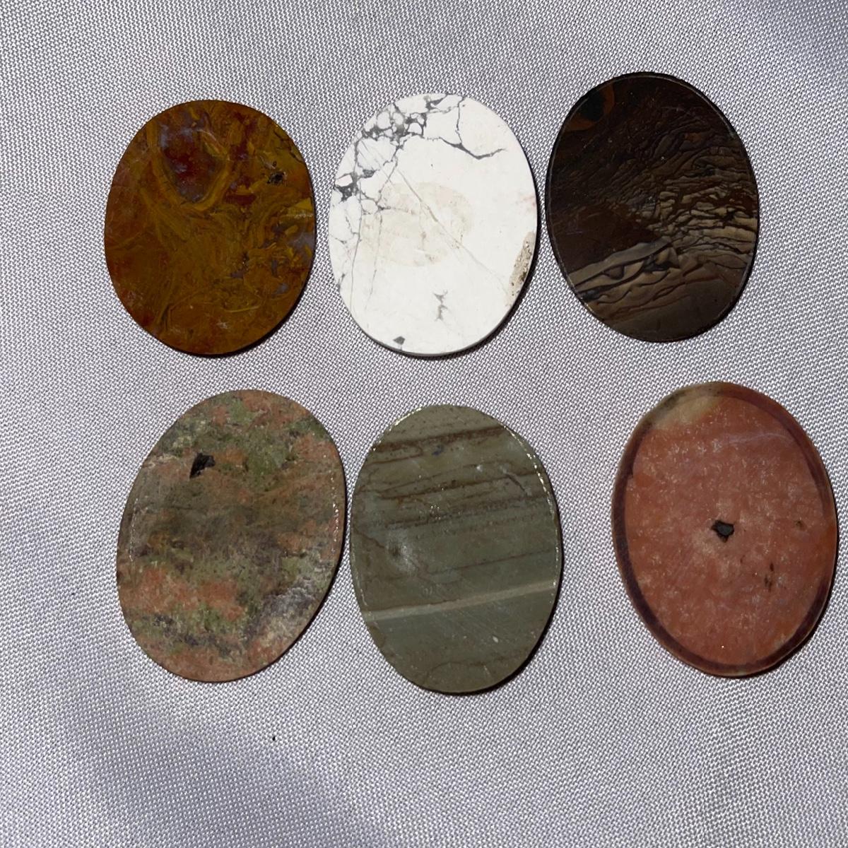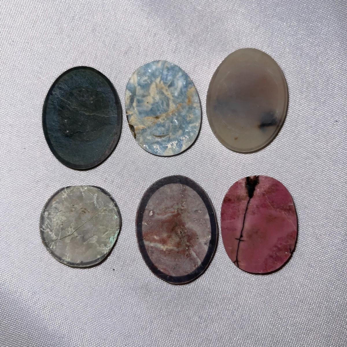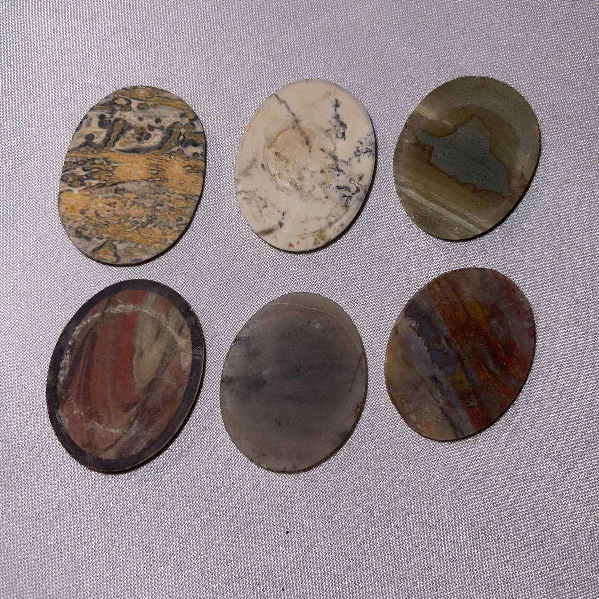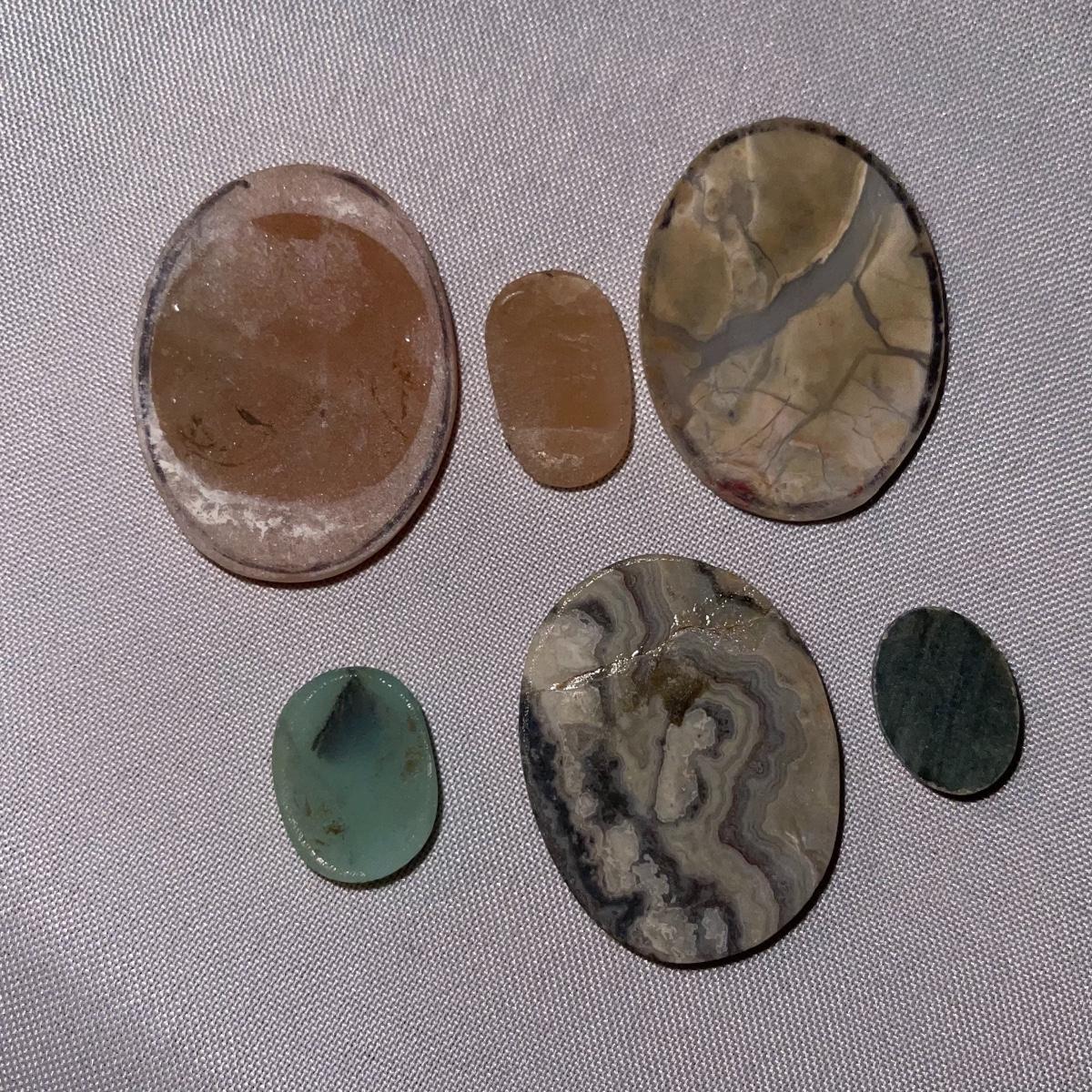 This large assortment of cabochons are ready to be used for jewelry, any crafting, or decor. There is a wide variety of types of stones, size, and color. Almost all are ovular shaped with a few exceptions. They have a convex obverse with a flat reverse, as cabochons do, the flat side not being as polished as the curved. There is also a small glass jar full of mini cabechons. Huge variety of shapes and colors here.