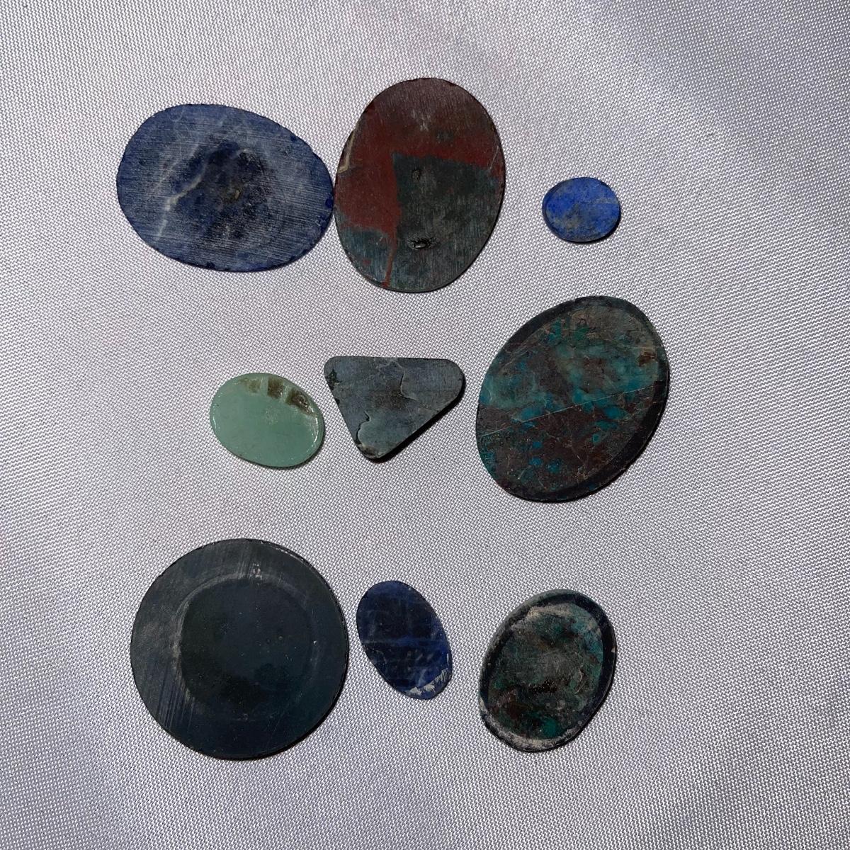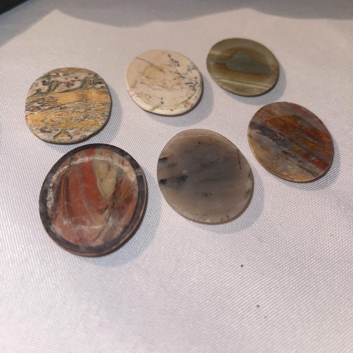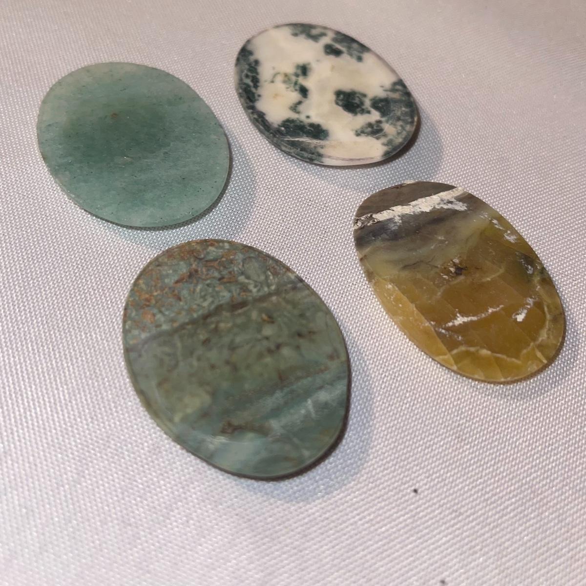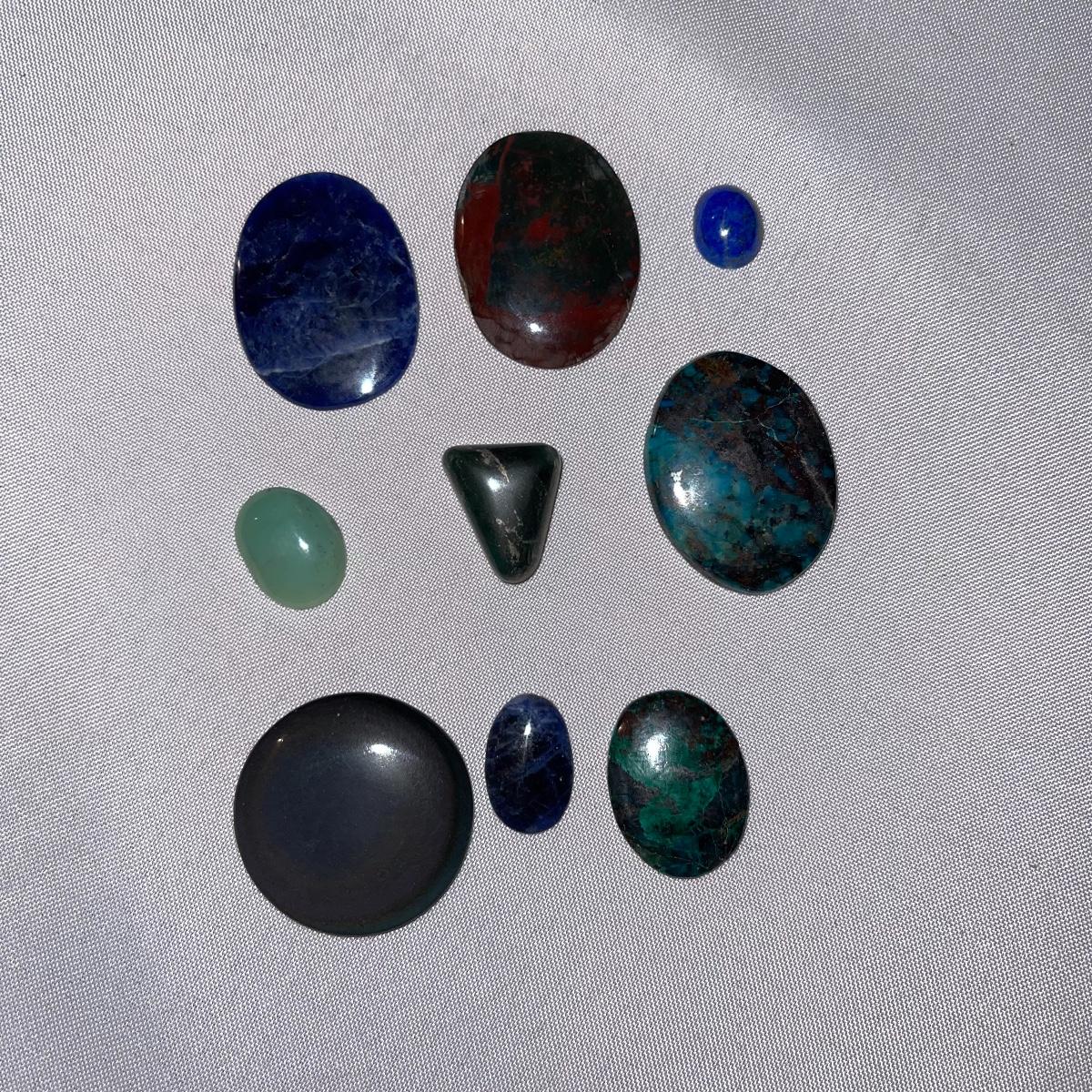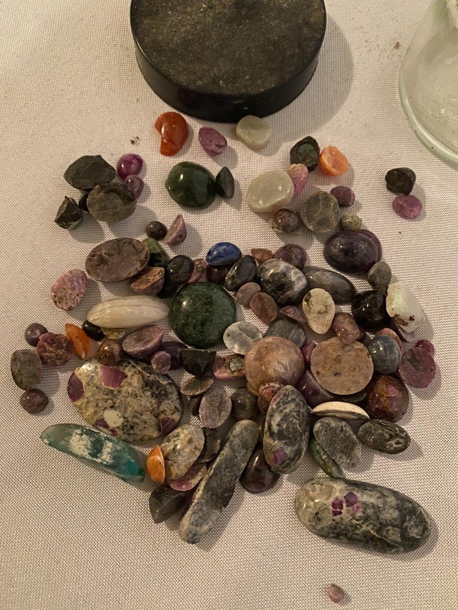 This large assortment of cabochons are ready to be used for jewelry, any crafting, or decor. There is a wide variety of types of stones, size, and color. Almost all are ovular shaped with a few exceptions. They have a convex obverse with a flat reverse, as cabochons do, the flat side not being as polished as the curved. There is also a small glass jar full of mini cabechons. Huge variety of shapes and colors here.