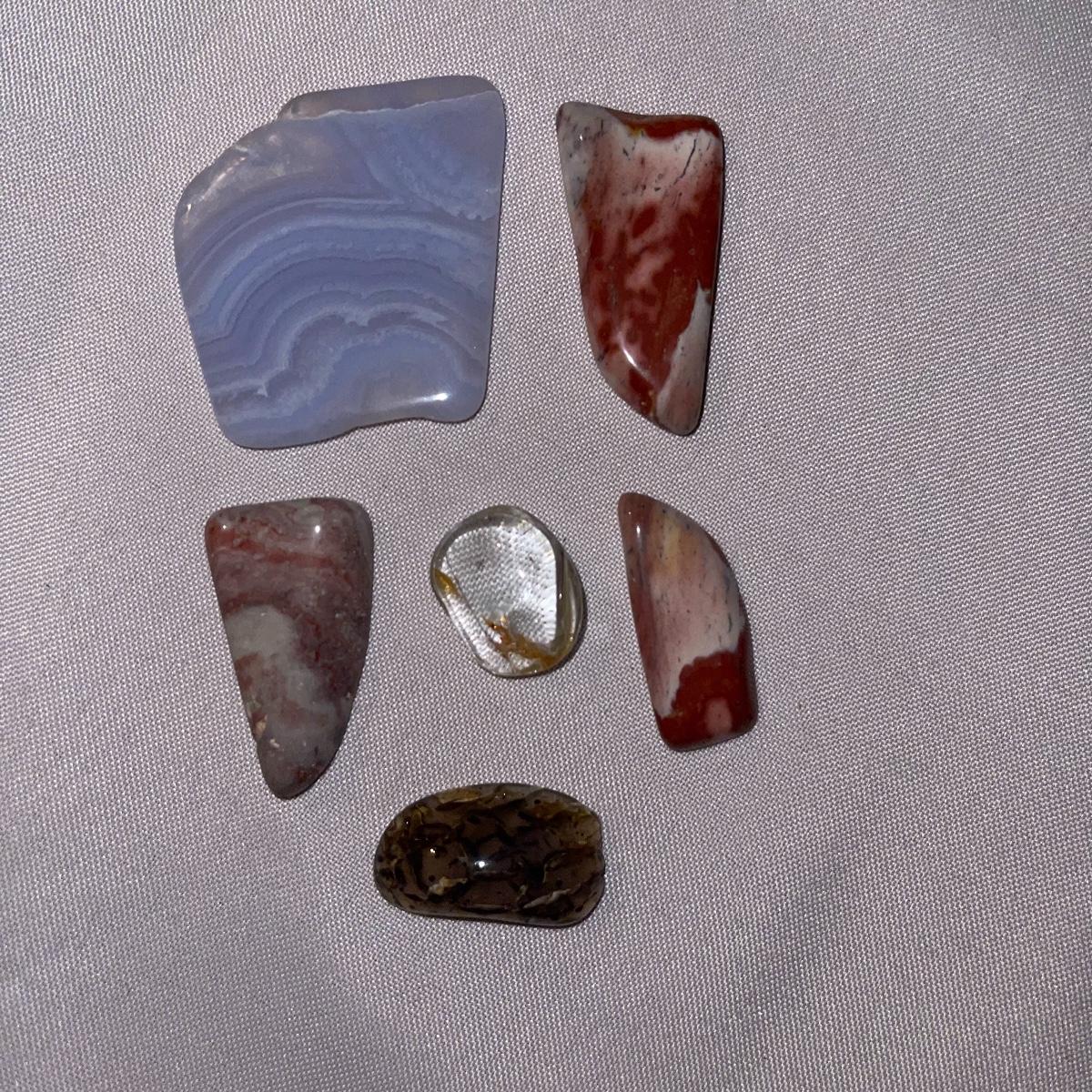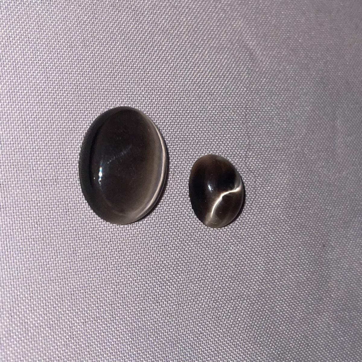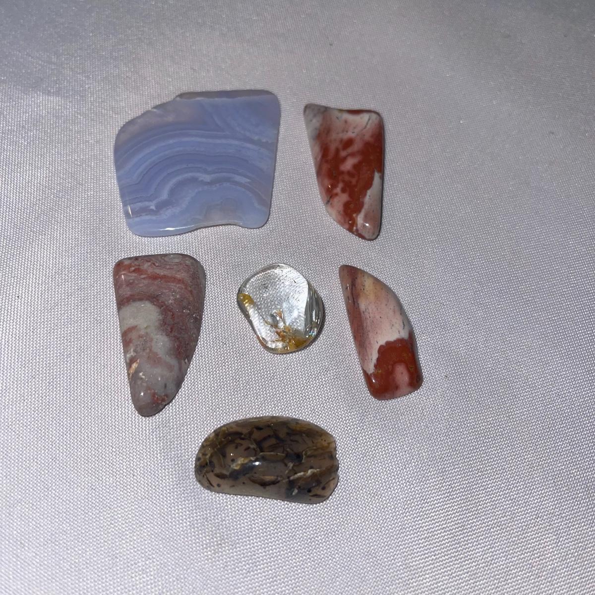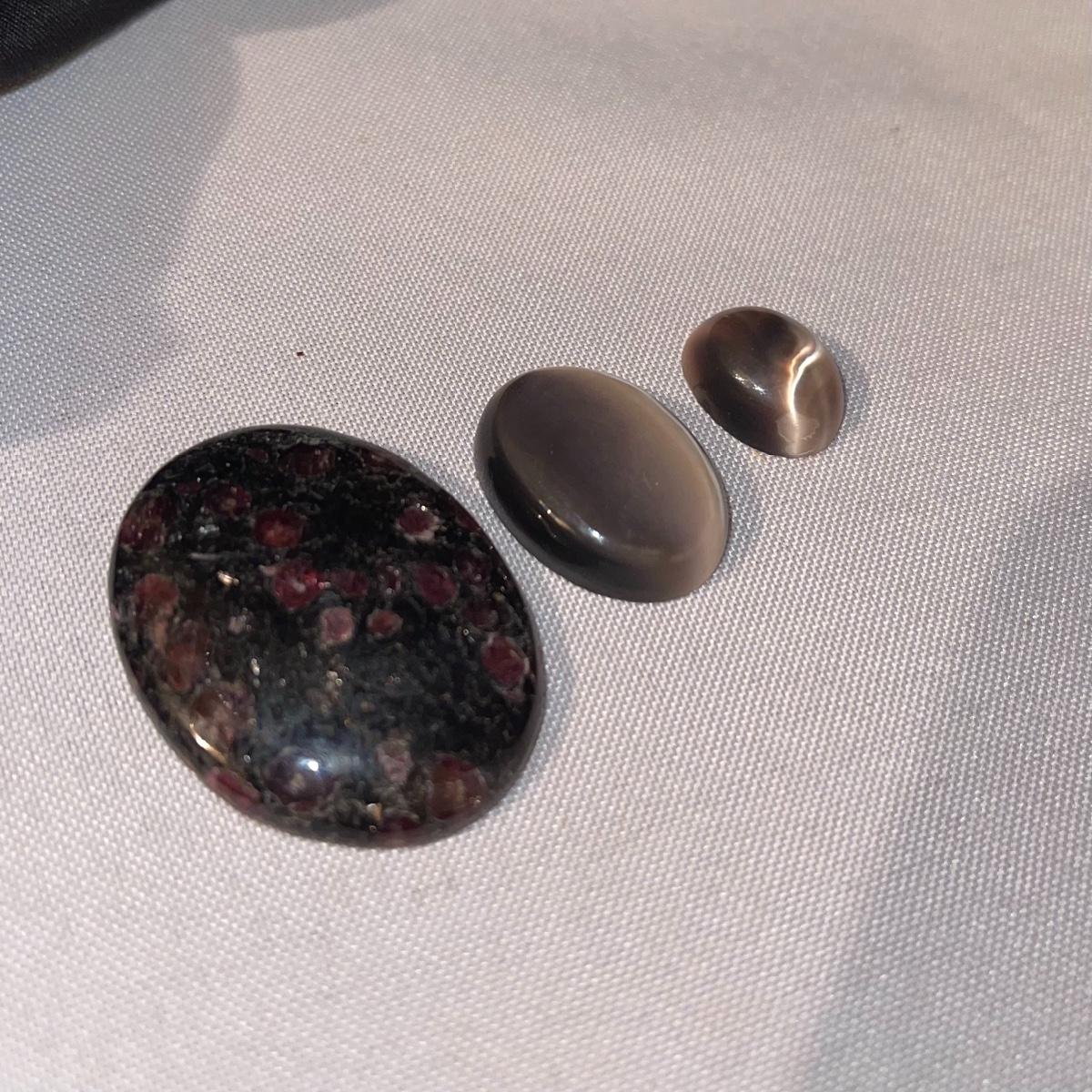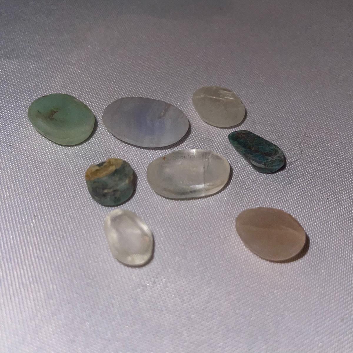 This large assortment of cabochons are ready to be used for jewelry, any crafting, or decor. There is a wide variety of types of stones, size, and color. Almost all are ovular shaped with a few exceptions. They have a convex obverse with a flat reverse, as cabochons do, the flat side not being as polished as the curved. There is also a small glass jar full of mini cabechons. Huge variety of shapes and colors here.
