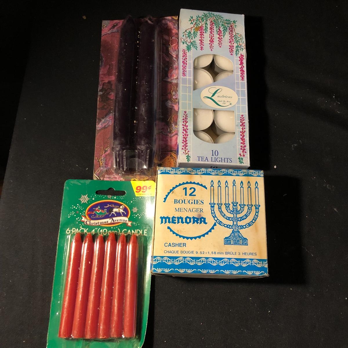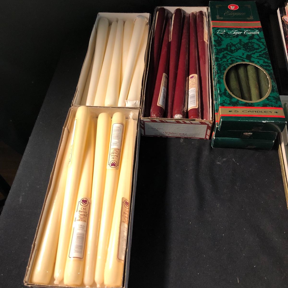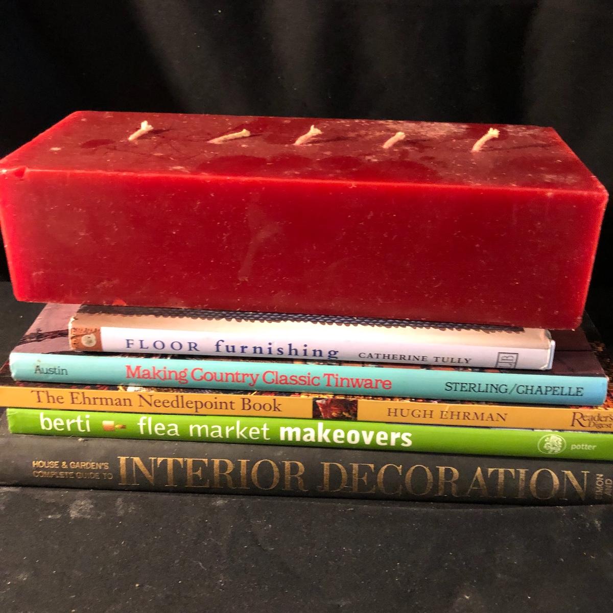You won’t be in the dark with this large collection of candles. Lot includes over eight tapered candles, thirty tapered candles, tea lights, books, glass plate and more. Rectangular candle measures 3.75” x 9.75” x 2.5”.