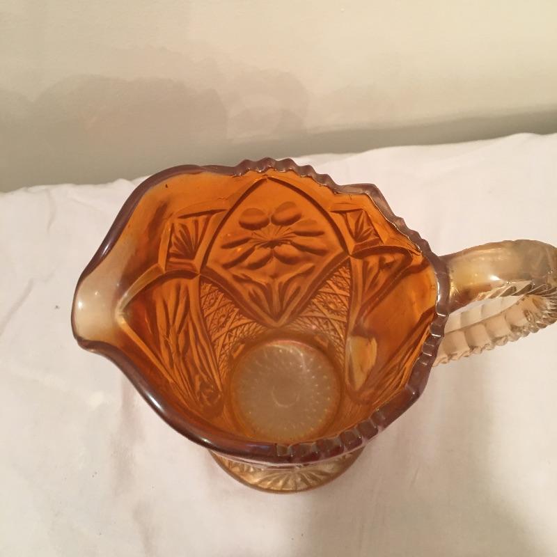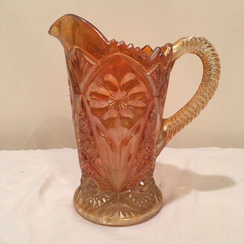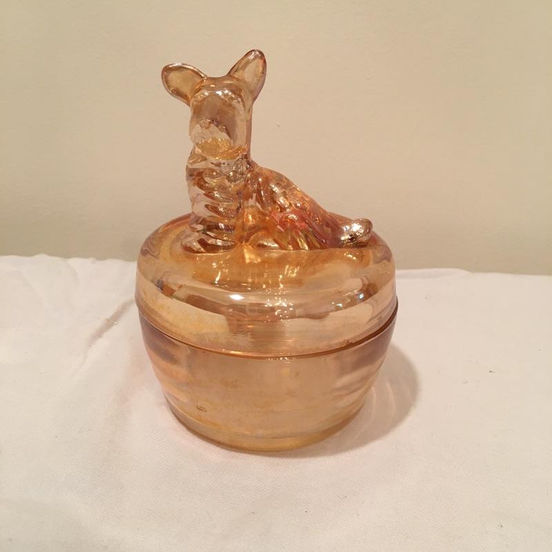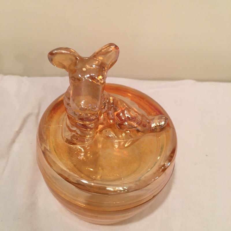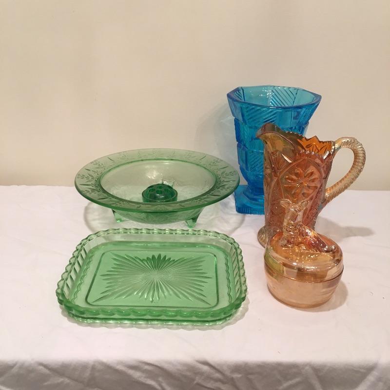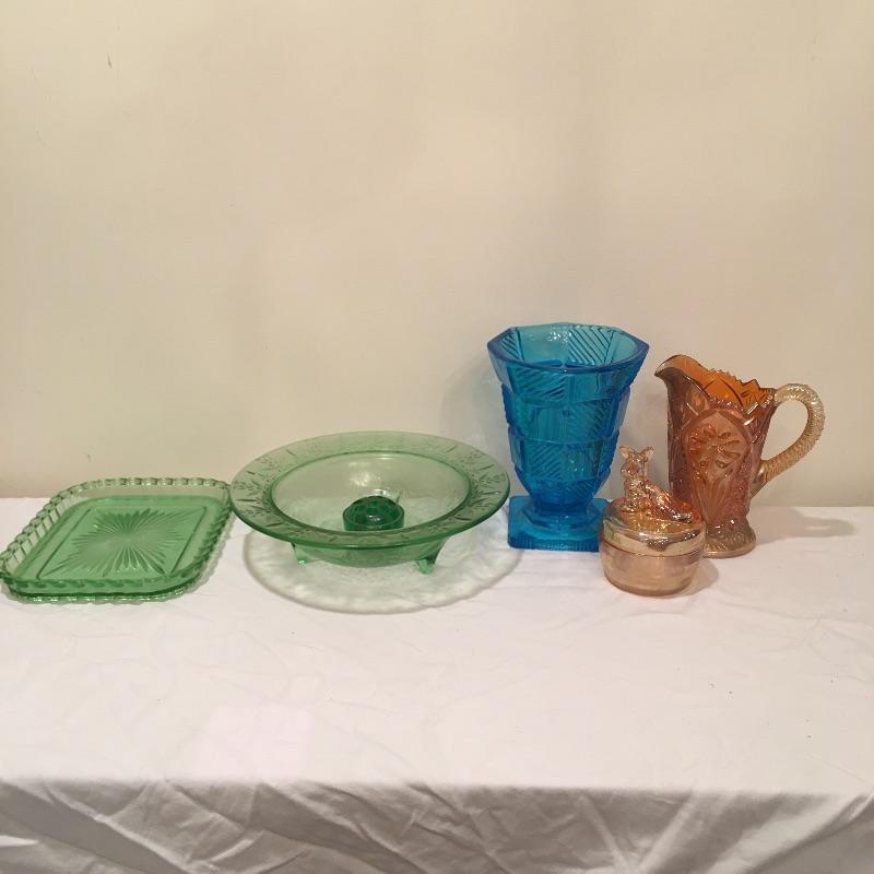 This festive colored lot includes carnival glass pitcher and dog adorned lidded jar, a green bowl, tray and plant holder and a blue vase.