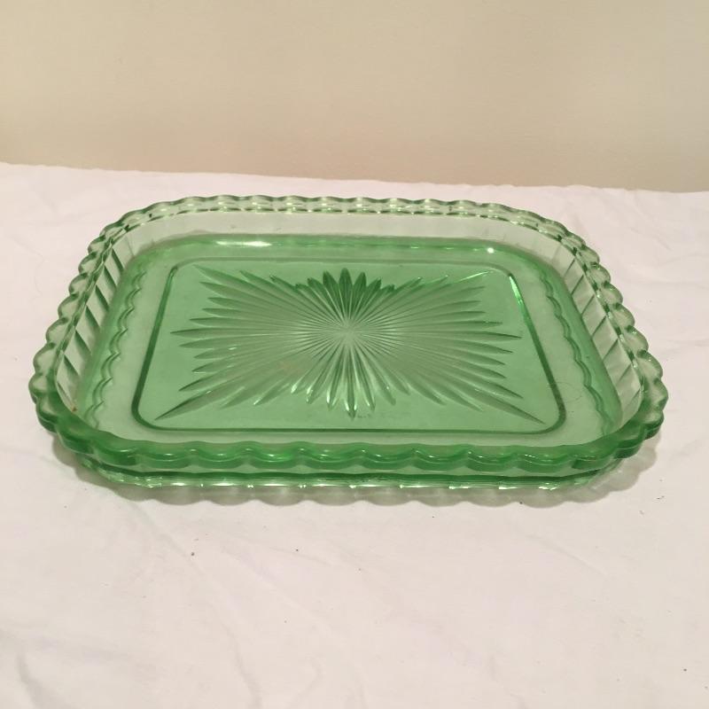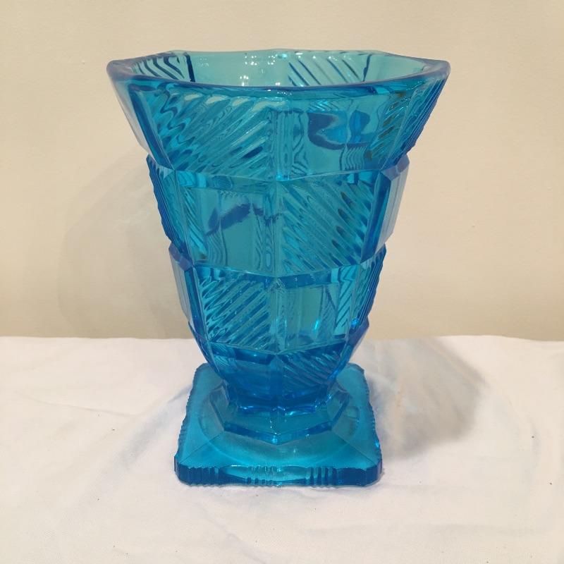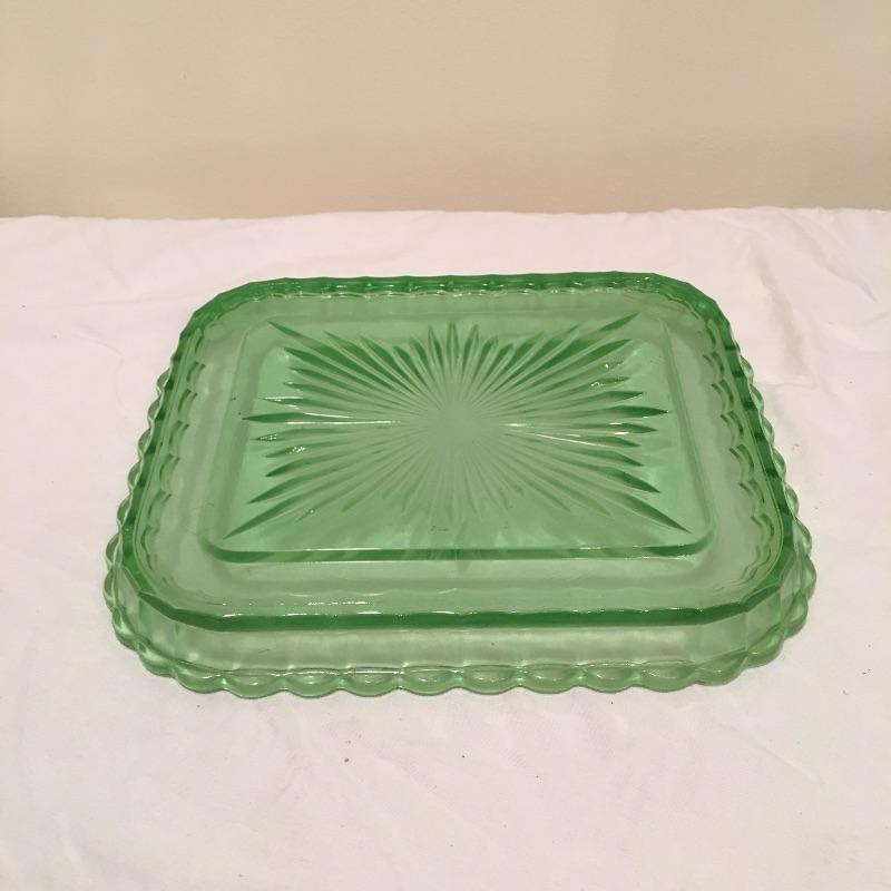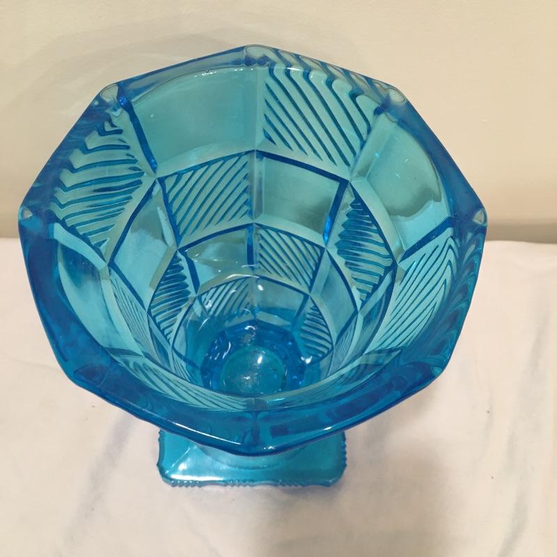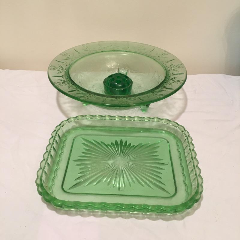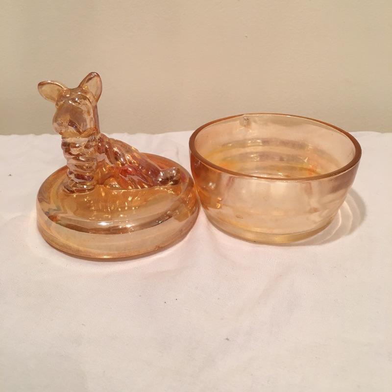 This festive colored lot includes carnival glass pitcher and dog adorned lidded jar, a green bowl, tray and plant holder and a blue vase.