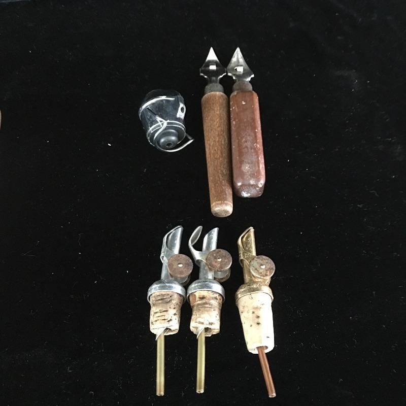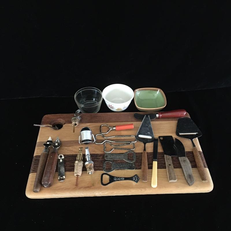 We see you amateur chefs posting pics of food on social media- let this lot create a masterpiece! A We Sun charcuterie board with a assortment of vintage bottle openers, spirit pourers, three small containers and cheese knives. Be ready for your next get together with this cool and useful lot. Board measures 11” x 18”.