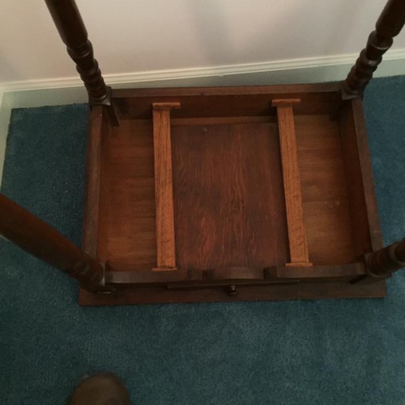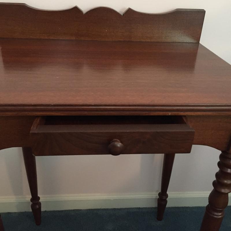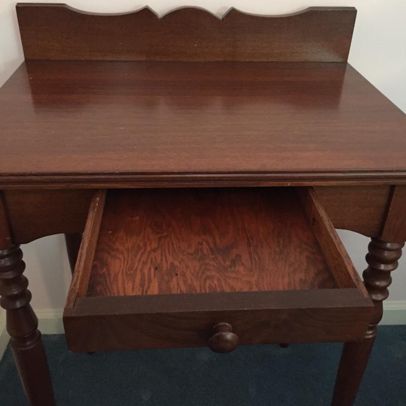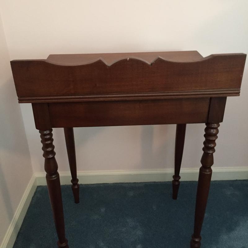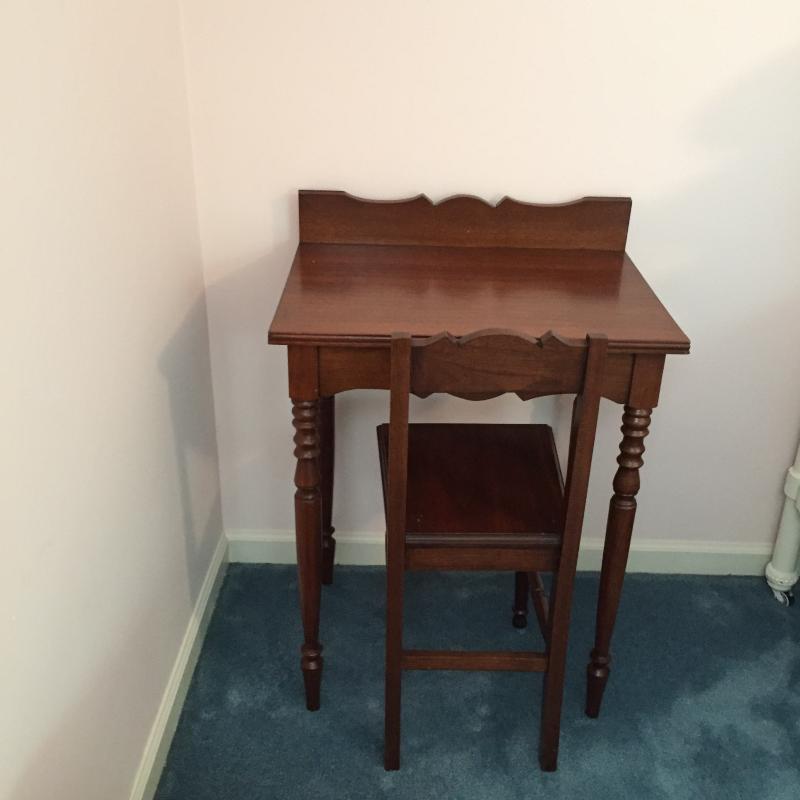 Small Wooden Desk and Chair. Owner states that they are handmade. Great for a child's room! Desk Measures 18”x24”x30” and is up a flight of stairs. Local Pickup Only