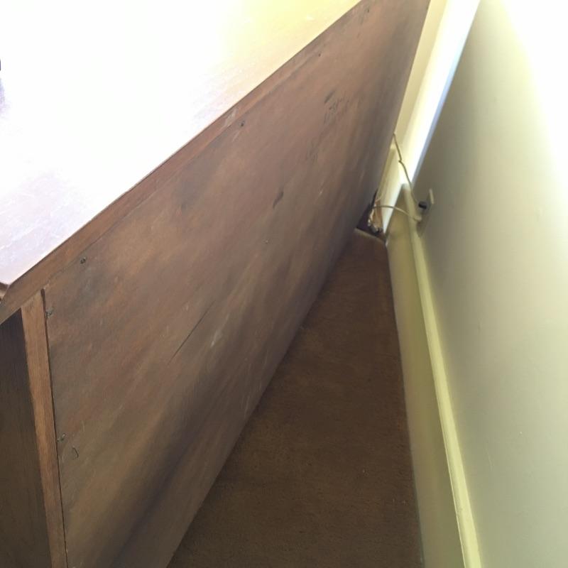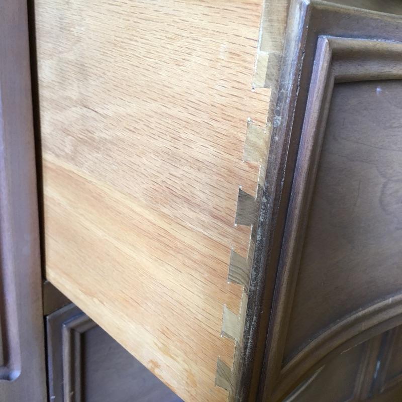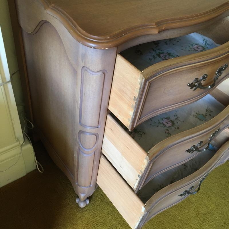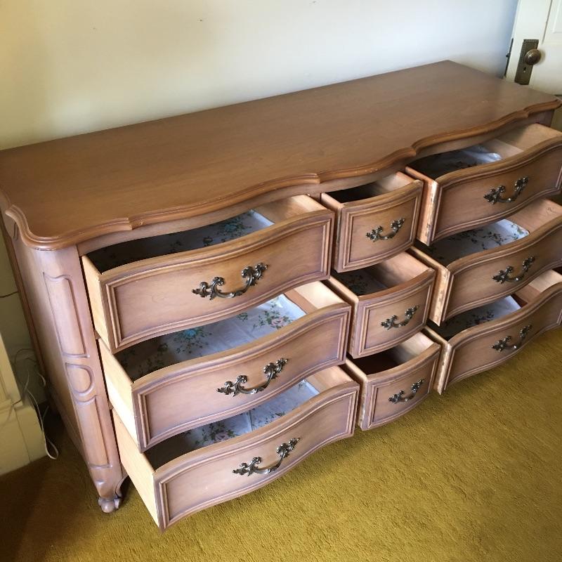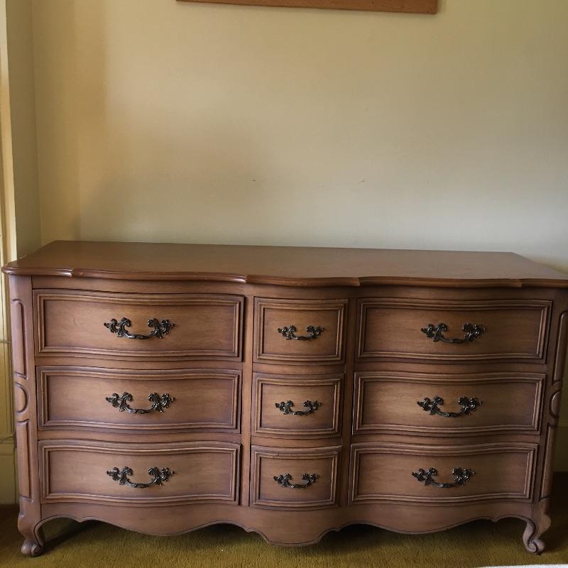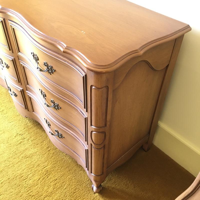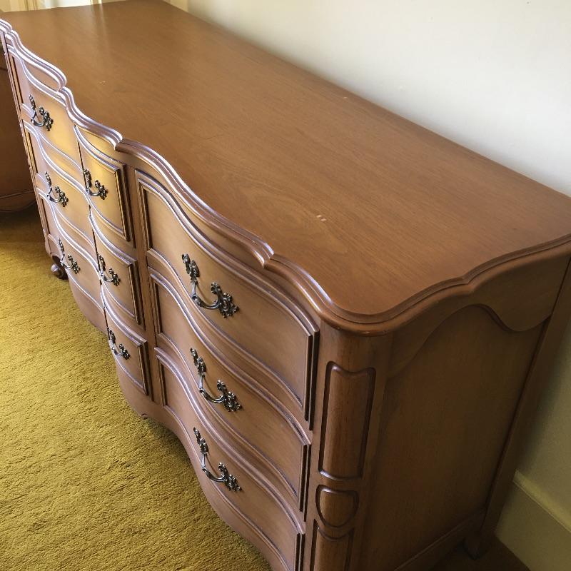 A gorgeous and large Drexel dresser with nine dovetailed drawers. You should have plenty of room with this piece for storage! Dresser has a few scratches on the top and a few more on the front that are hardly noticeable, see pictures. Dresser measures 21” x 61” x 33”. Bring help item is substantial. Matches lot 83, 84, 87 and 90.