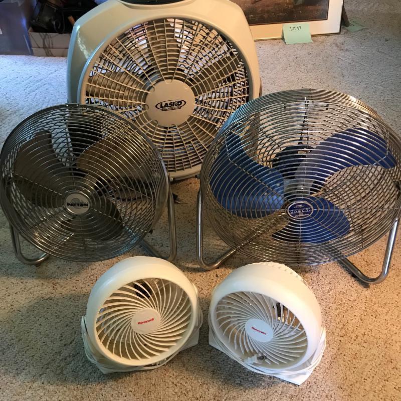 Lot includes five fans, two metal Pattons, one plastic Lasco, and two plastic Honeywells. All turned on when plugged in. No shipping available. Local pickup only in Hendersonville, NC.