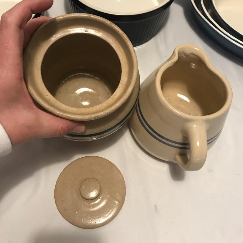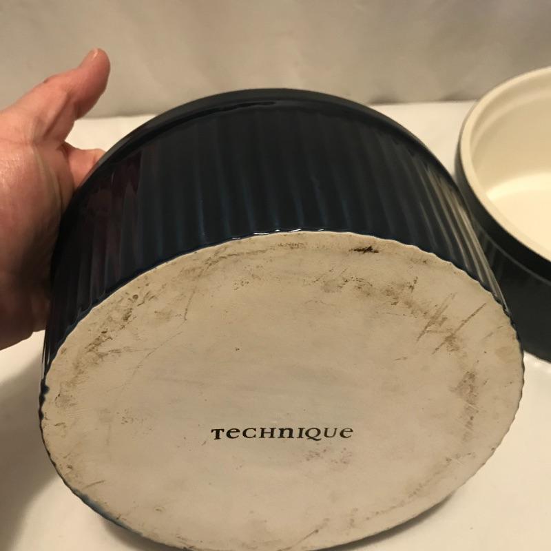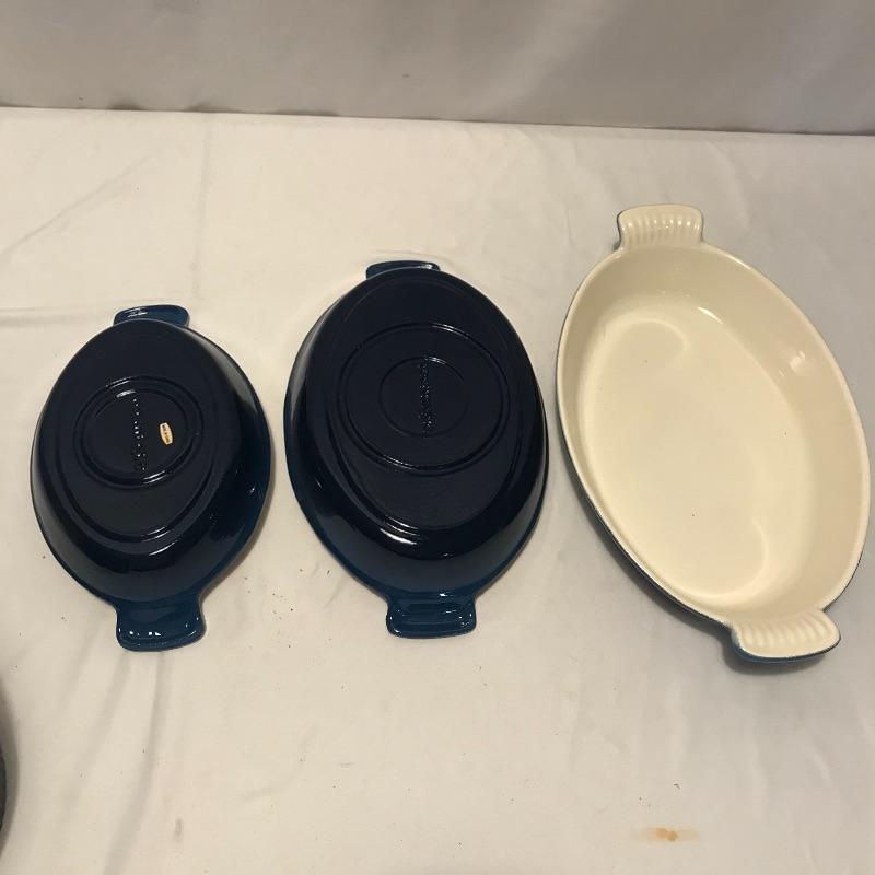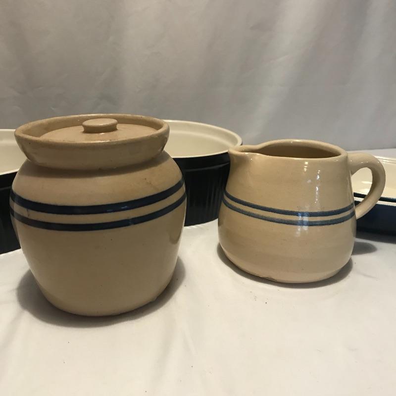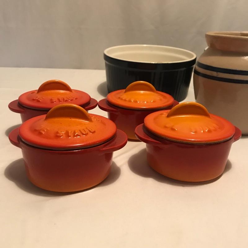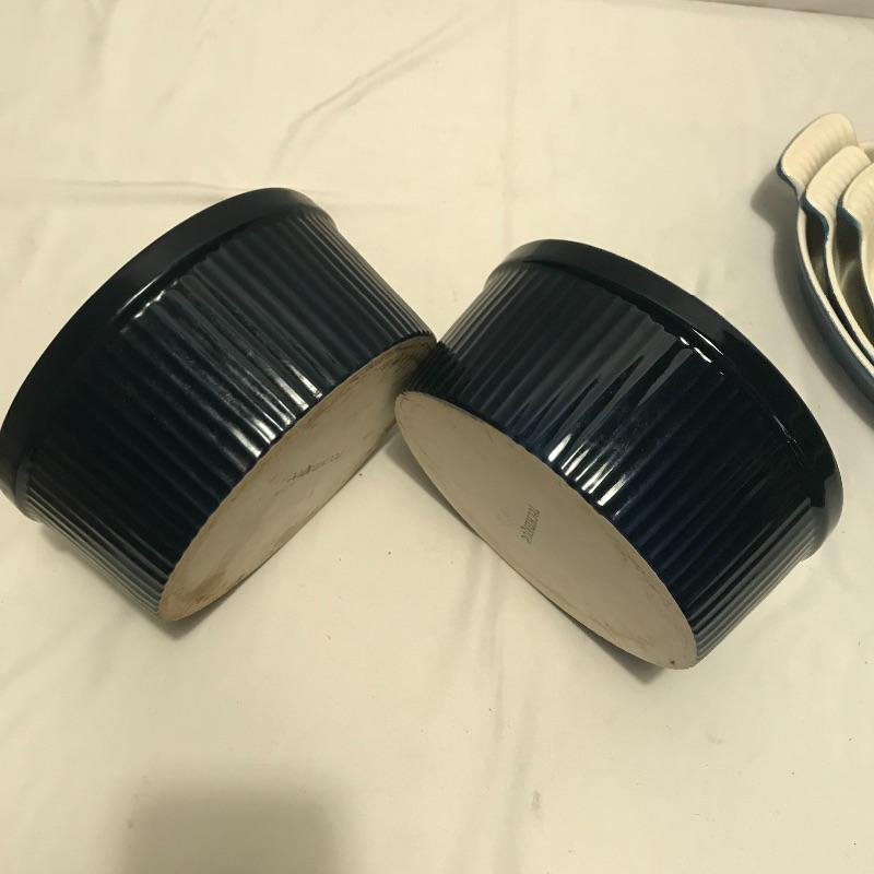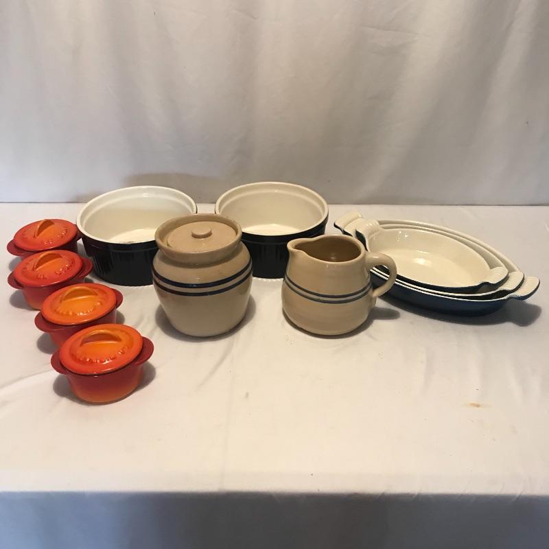 Neat collection of four bright French soufflé Dutch ovens, two Technique sets - deep 7.5”d x 3.75” blue and white crocks and three nesting stoneware pieces. Lastly a pitcher and canister duo with pretty blue stripes. Master all of your baked dishes with this variety! Local pick up only.