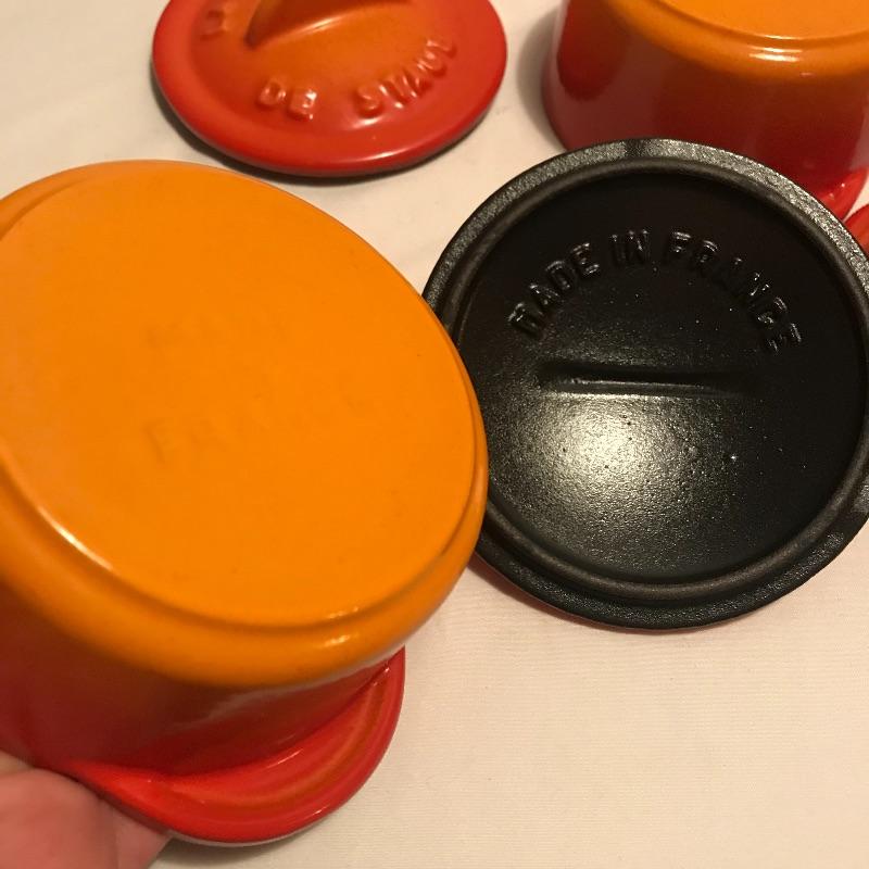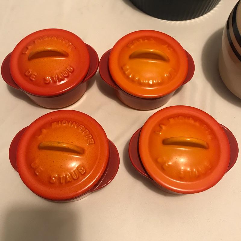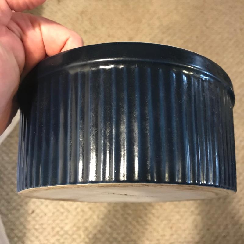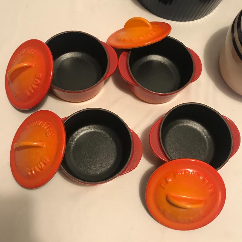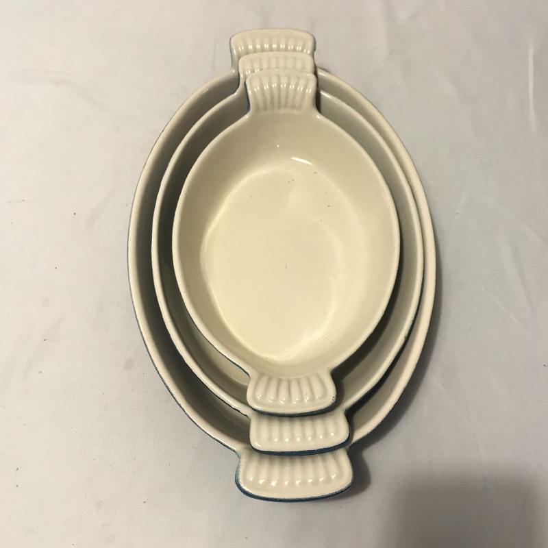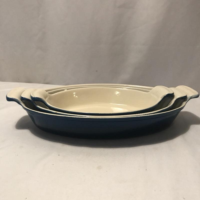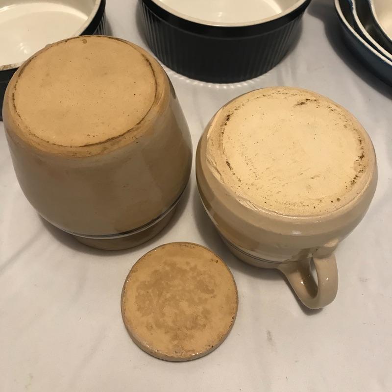 Neat collection of four bright French soufflé Dutch ovens, two Technique sets - deep 7.5”d x 3.75” blue and white crocks and three nesting stoneware pieces. Lastly a pitcher and canister duo with pretty blue stripes. Master all of your baked dishes with this variety! Local pick up only.