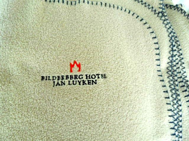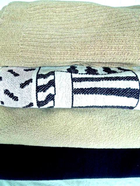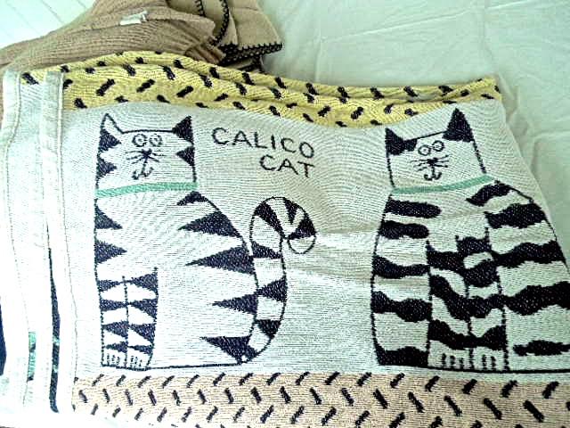 Here are four machine manufactured used throw blankets. Woven cotton blanket with a cat motif. Two are pile polyfleece and the darker beige ribbed blanket is acrylic velour. Santiago brand Bilderberg Hotel embroidered on light beige pile blanket has whip stitched edge,