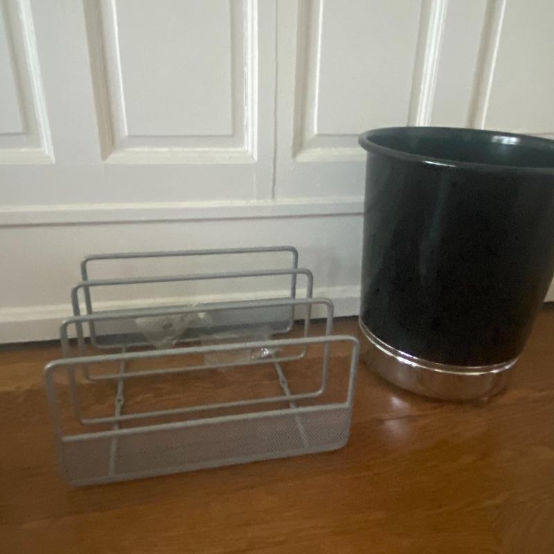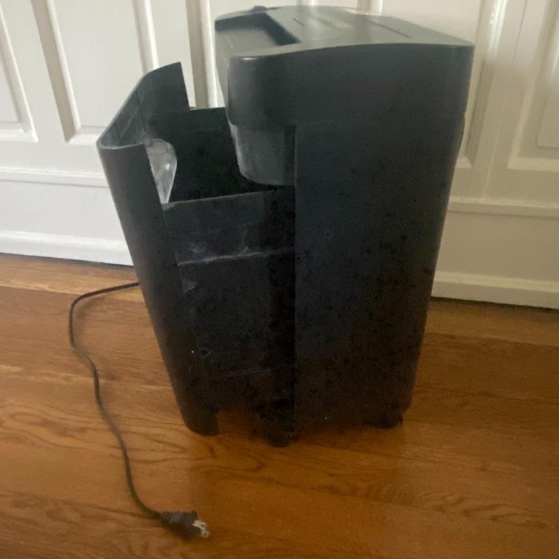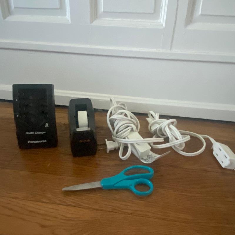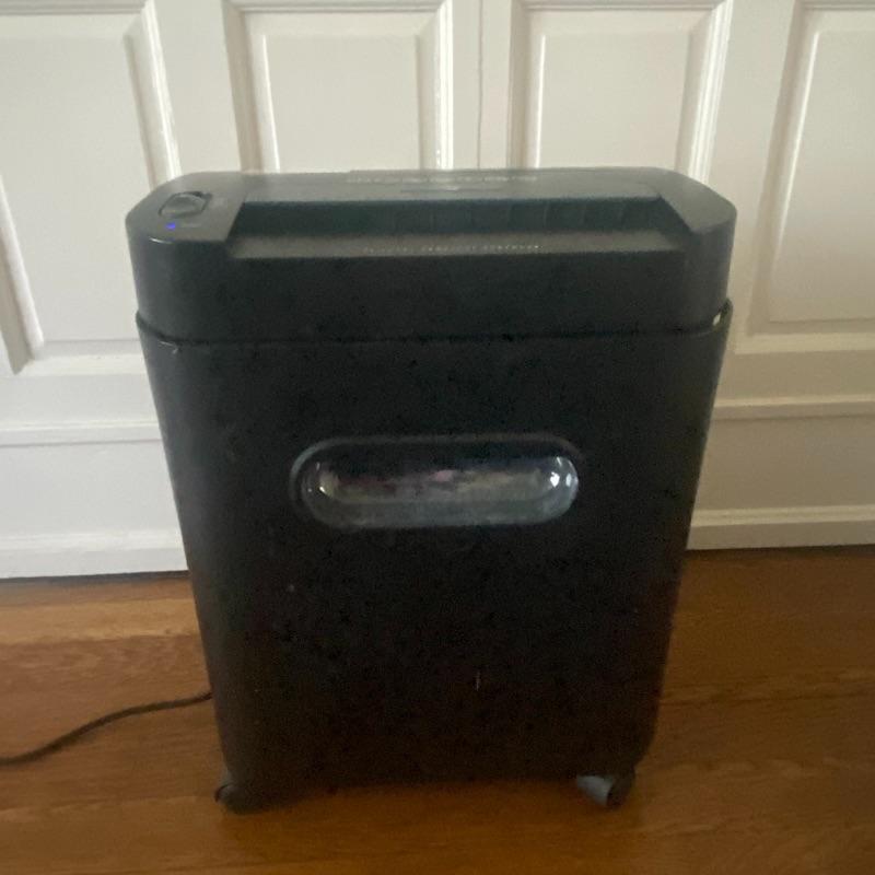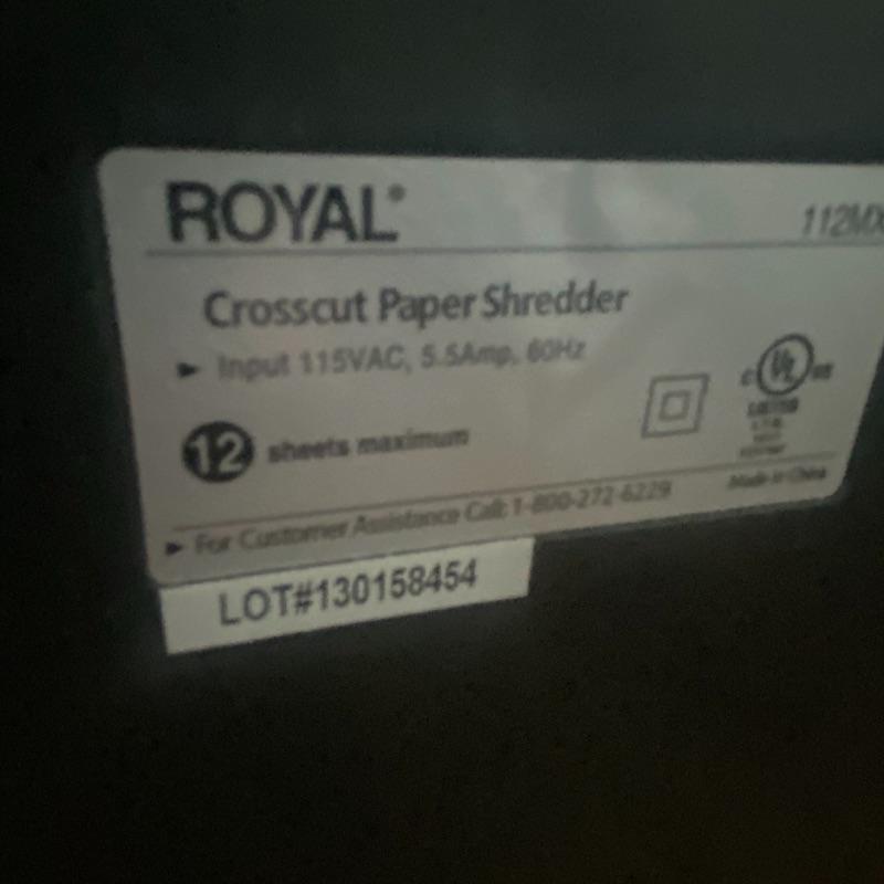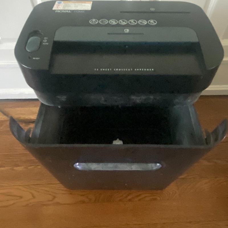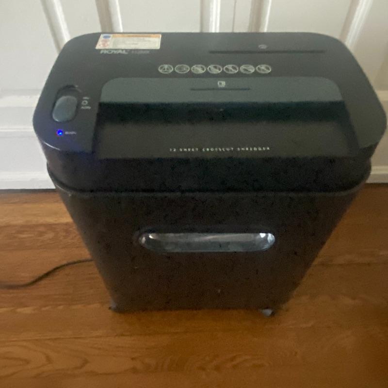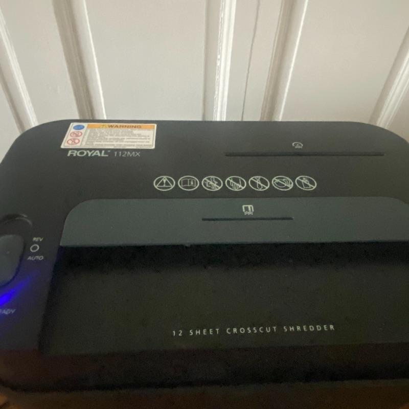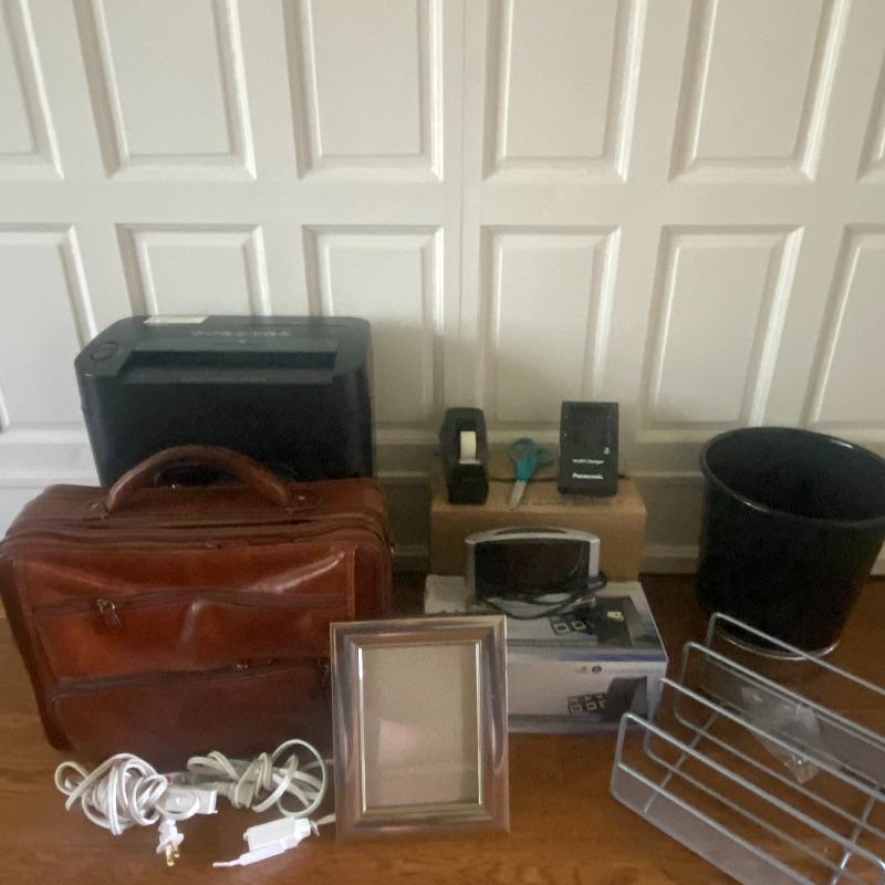 This lot meets all of your office needs! Lot includes Royal 112MX 12-sheet cross cut shredder. Measurements are 12”x7.5”x17”. Dark brown/red leather-like office bag. See photos. Packaged Hammacher Schlemmer digital picture converter. Box of six picture frames 5 x 7. Lot also include small trashcan, paper organizer, working digital clock, tape dispenser and scissors. Lot also includes Panasonic five hour battery recharger and two white extension cords. See photos.Local pickup only.