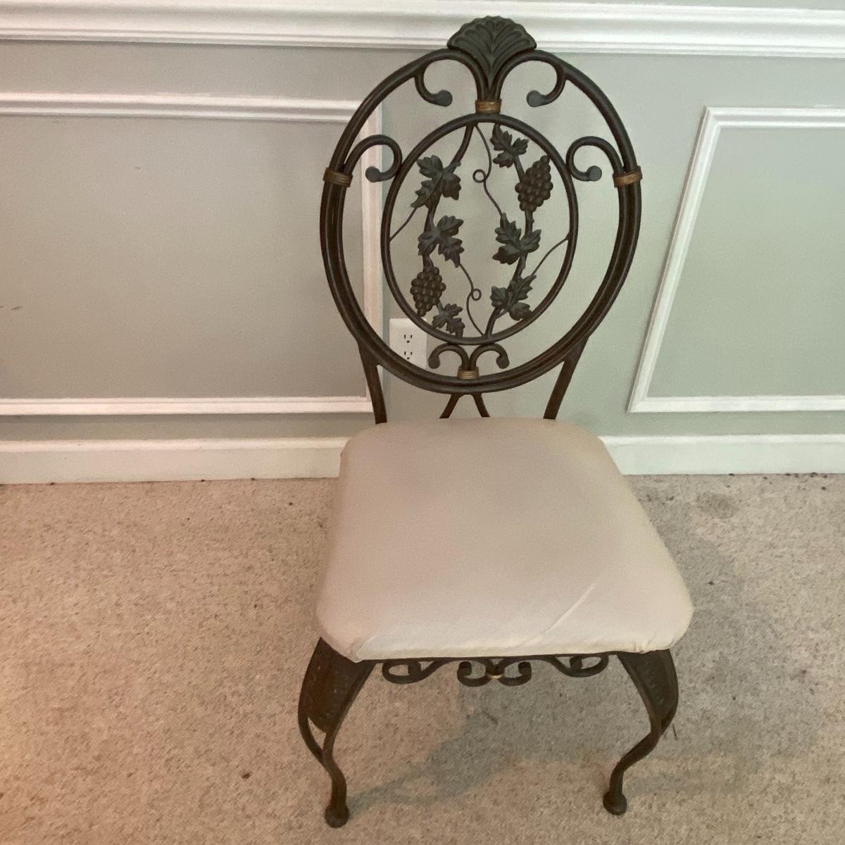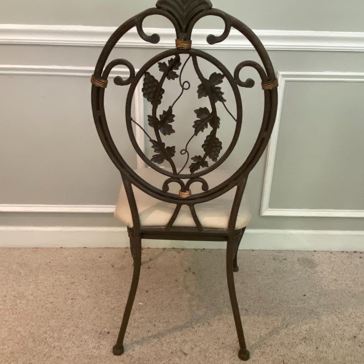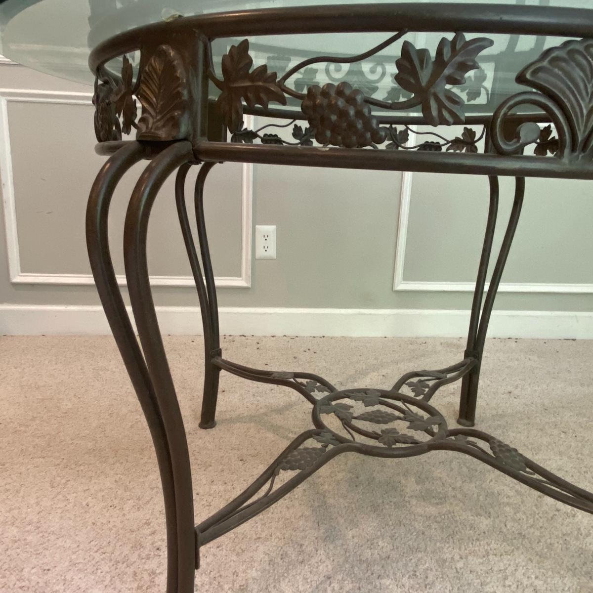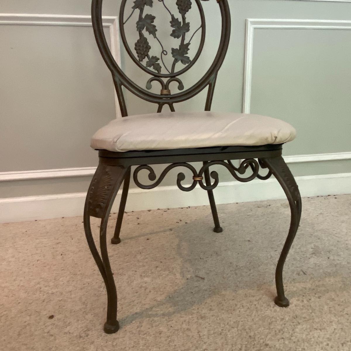 This charming lot includes a five piece table set. The table is a round glass-top table that fits four matching chairs. Notice the greenery and vine details on the metal framing of the table and chair legs. Chairs are armless with plastic/wipeable fabric seats. The four chairs are matching with one having a small rip in the seat, See pictures. Table measures 45”D x 29.5” tall and chairs measure 19” x 19” x 38” with a 19” seat height. Bring help item is substantial and will need to be walked around outside of house.