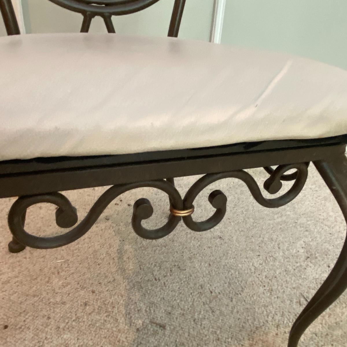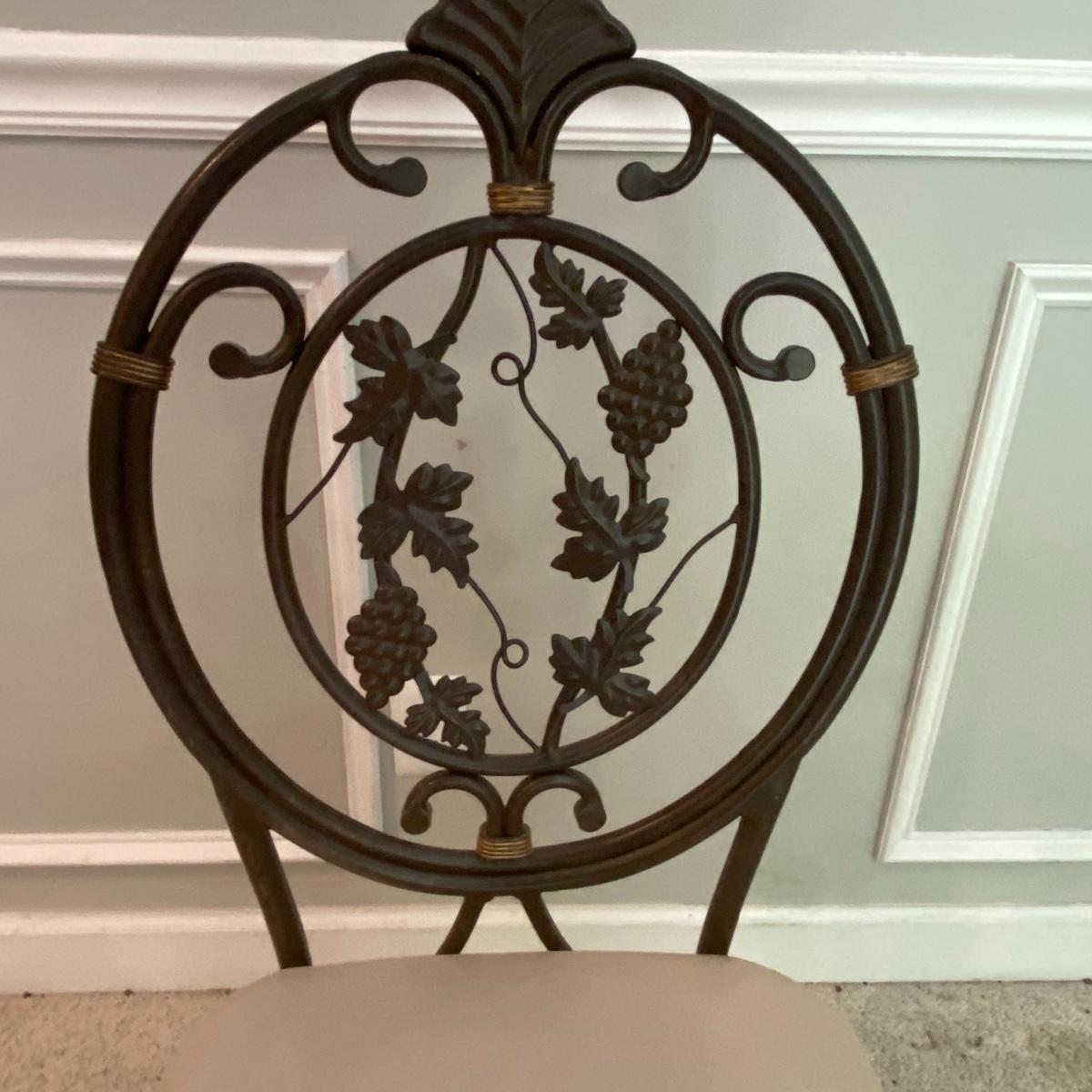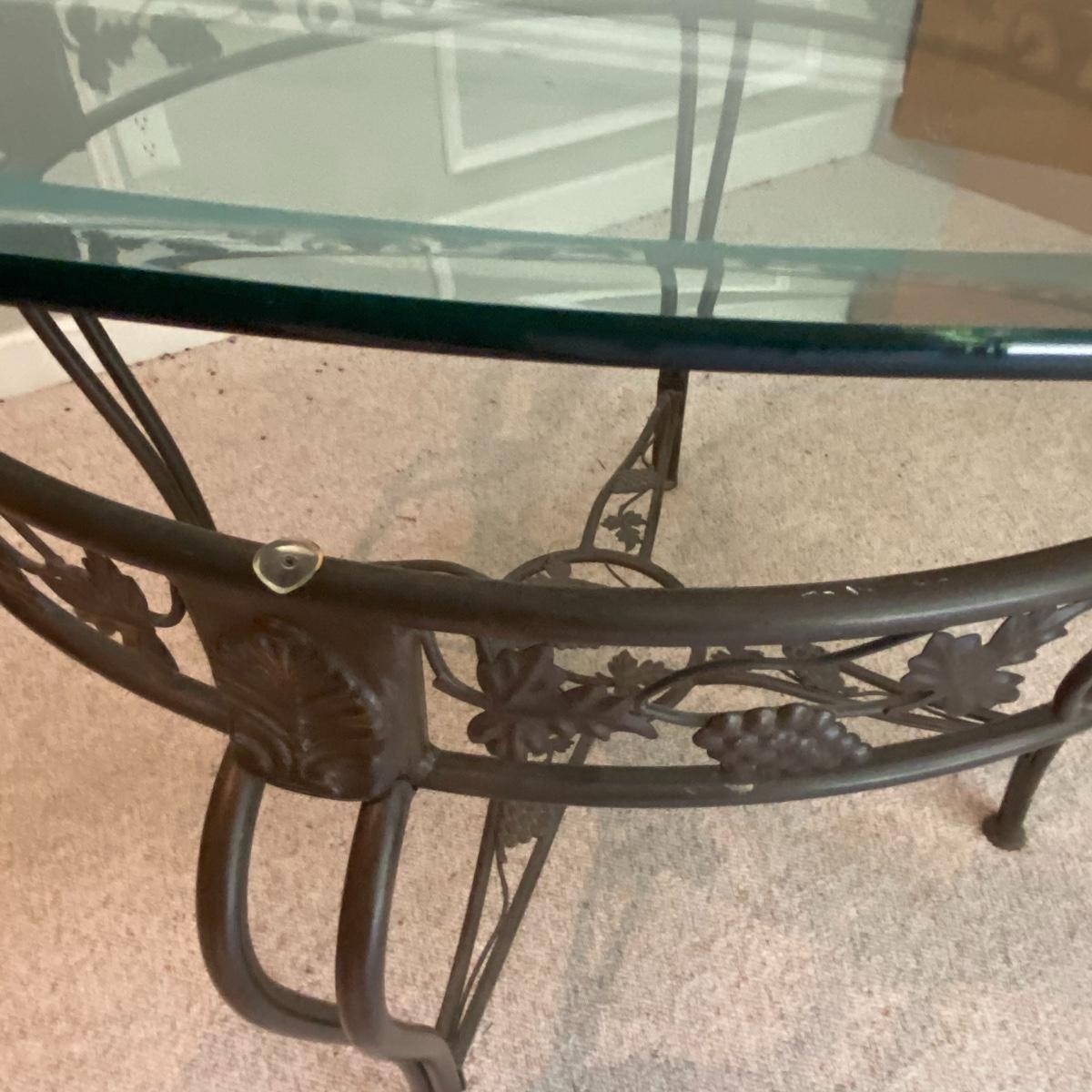 This charming lot includes a five piece table set. The table is a round glass-top table that fits four matching chairs. Notice the greenery and vine details on the metal framing of the table and chair legs. Chairs are armless with plastic/wipeable fabric seats. The four chairs are matching with one having a small rip in the seat, See pictures. Table measures 45”D x 29.5” tall and chairs measure 19” x 19” x 38” with a 19” seat height. Bring help item is substantial and will need to be walked around outside of house.