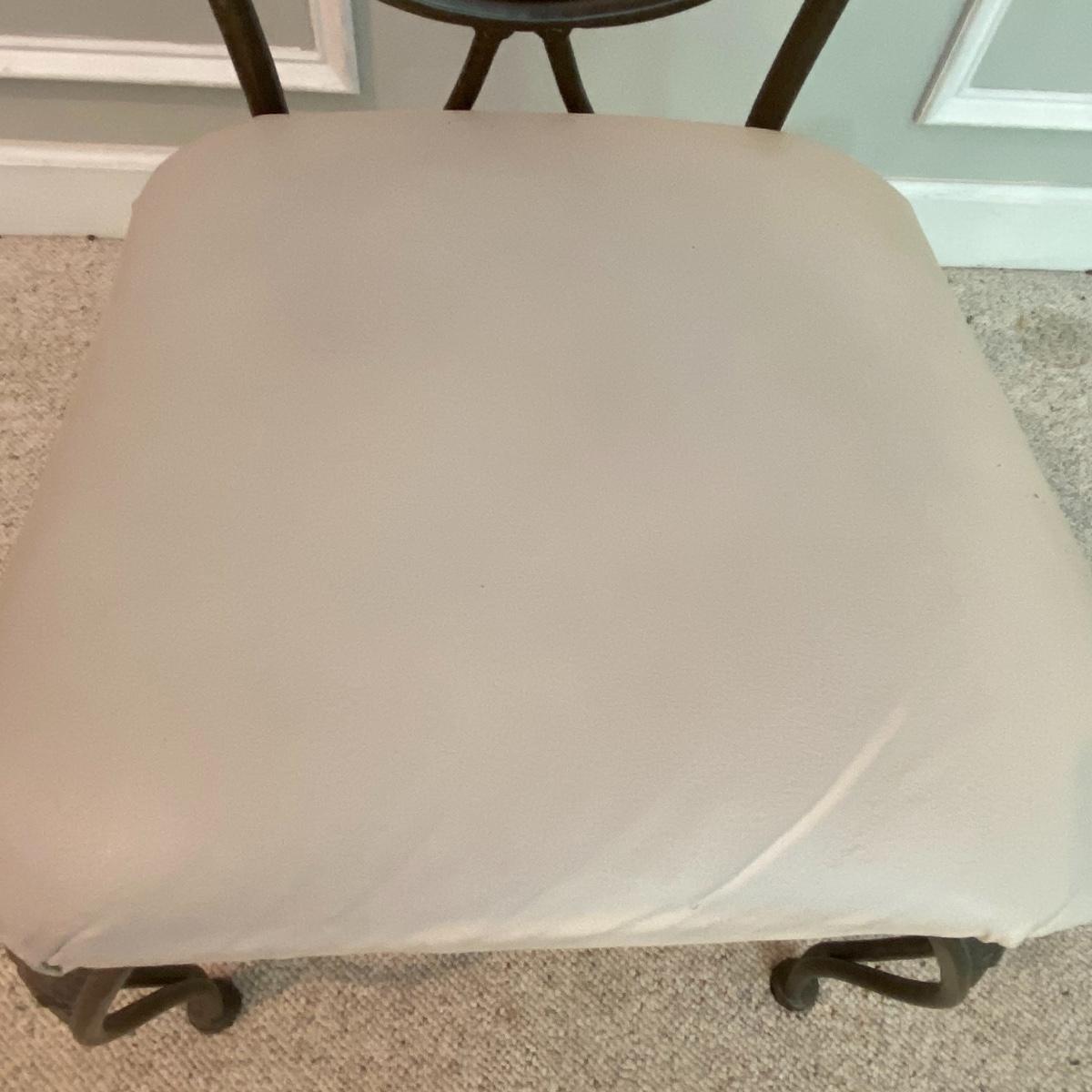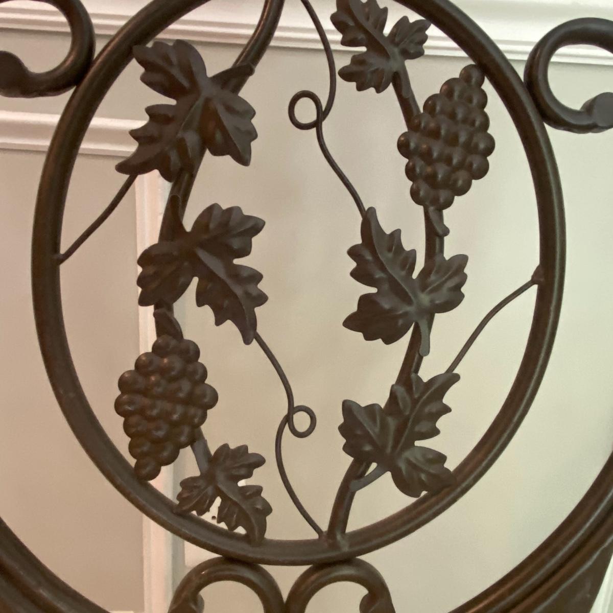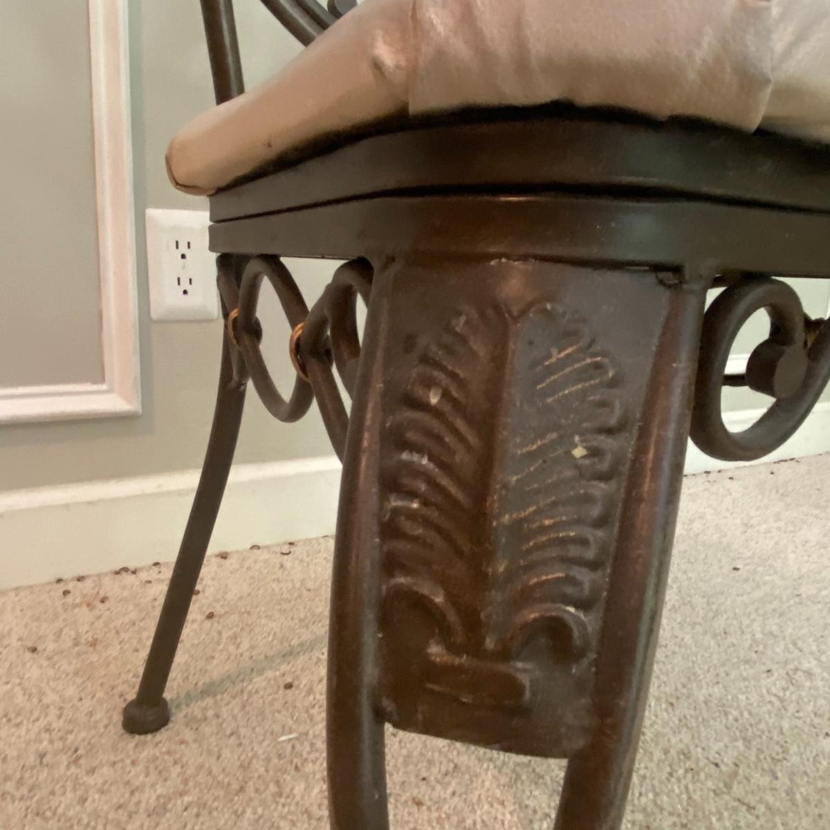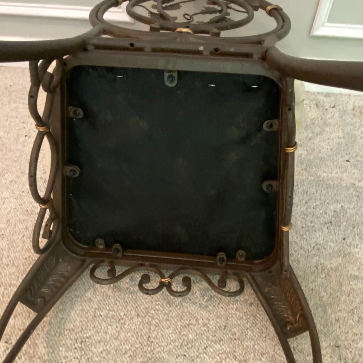 This charming lot includes a five piece table set. The table is a round glass-top table that fits four matching chairs. Notice the greenery and vine details on the metal framing of the table and chair legs. Chairs are armless with plastic/wipeable fabric seats. The four chairs are matching with one having a small rip in the seat, See pictures. Table measures 45”D x 29.5” tall and chairs measure 19” x 19” x 38” with a 19” seat height. Bring help item is substantial and will need to be walked around outside of house.