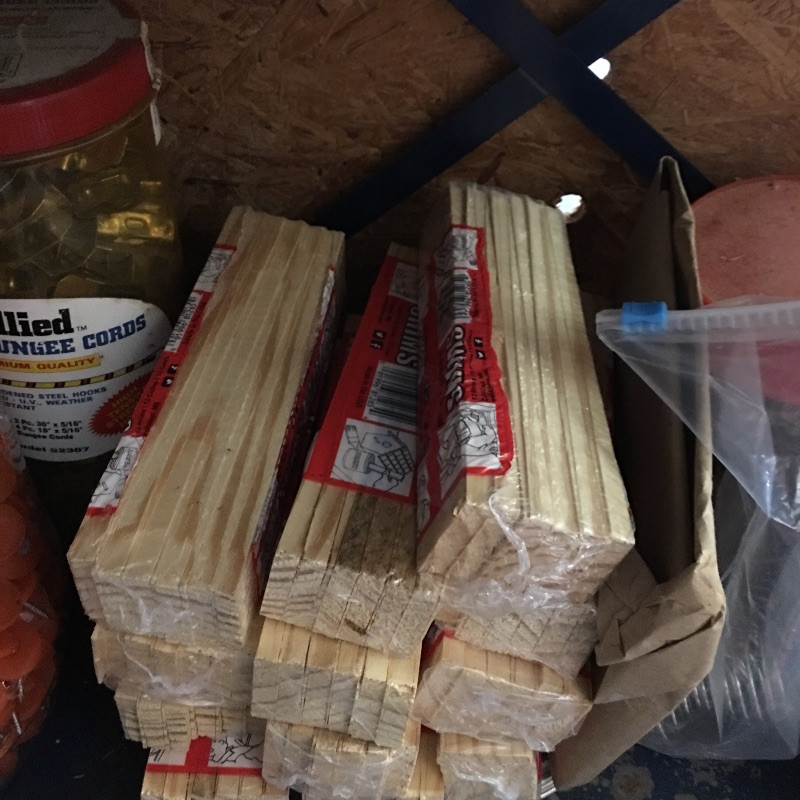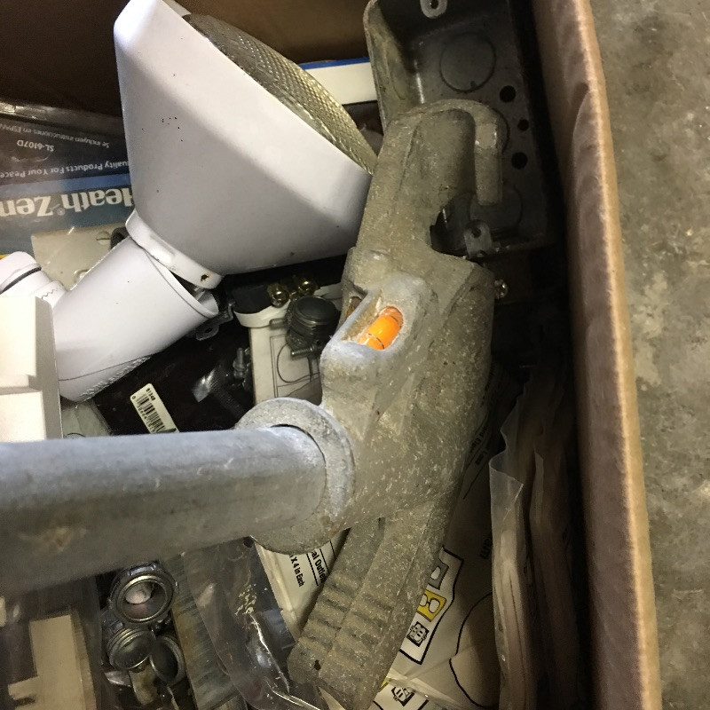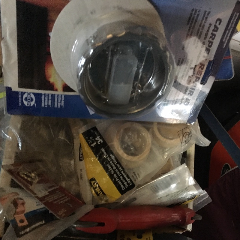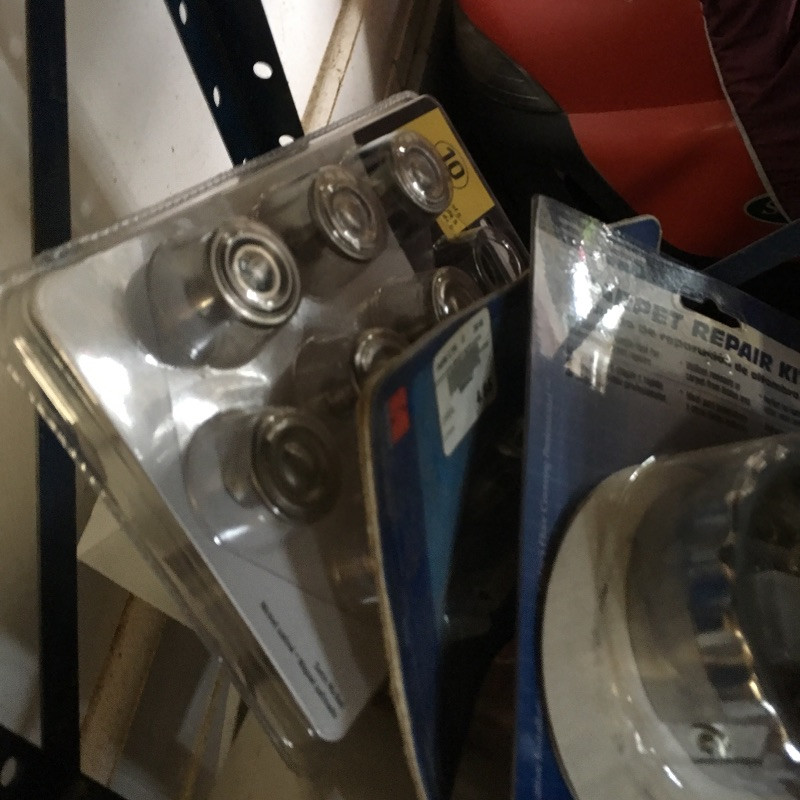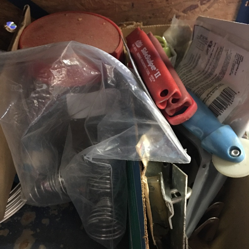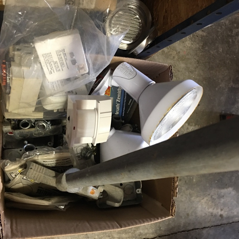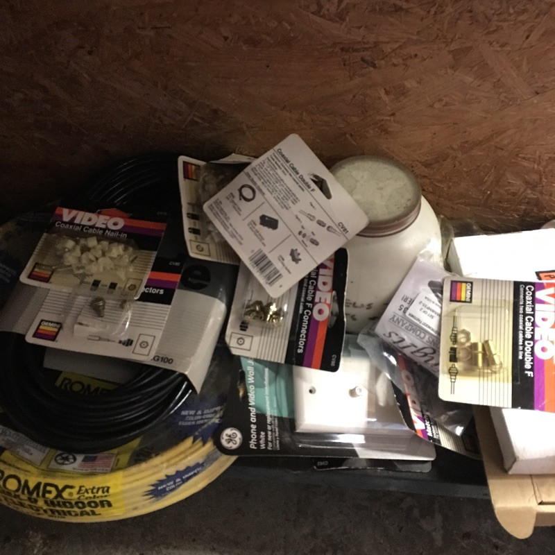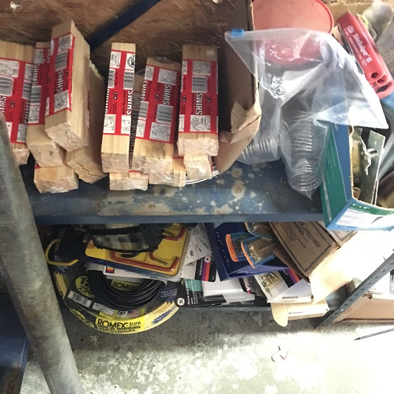 There is bound to be things that will come in handy for you with this large assortment of household hardware including electrical boxes, pipe bender, flood lights, zip ties, piano hinges, romex, shims, screen tools and more. Shelves not included.
