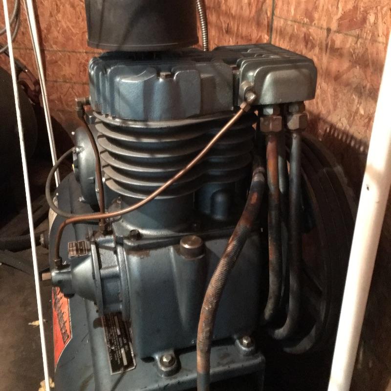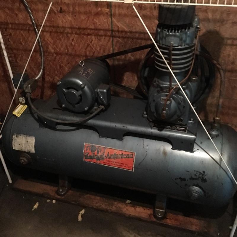 Kellogg American compressor. Heavy duty industrial compressor is just what your shop needs. Compressor measure 25” x 62” x 52.5”. Compressor works as it should. Bring help item is substantial.