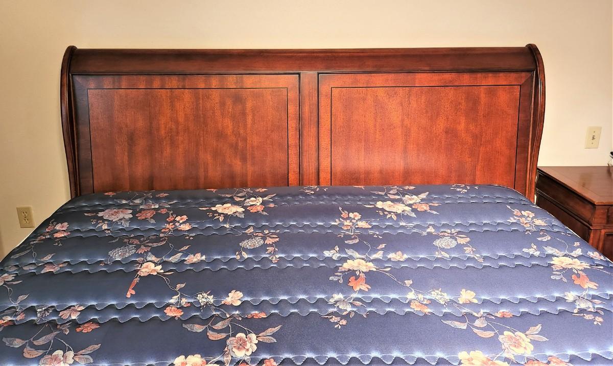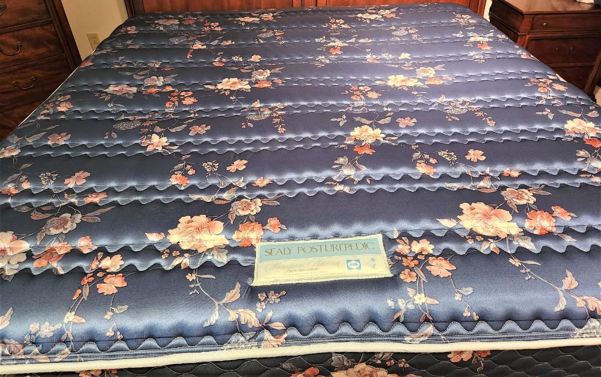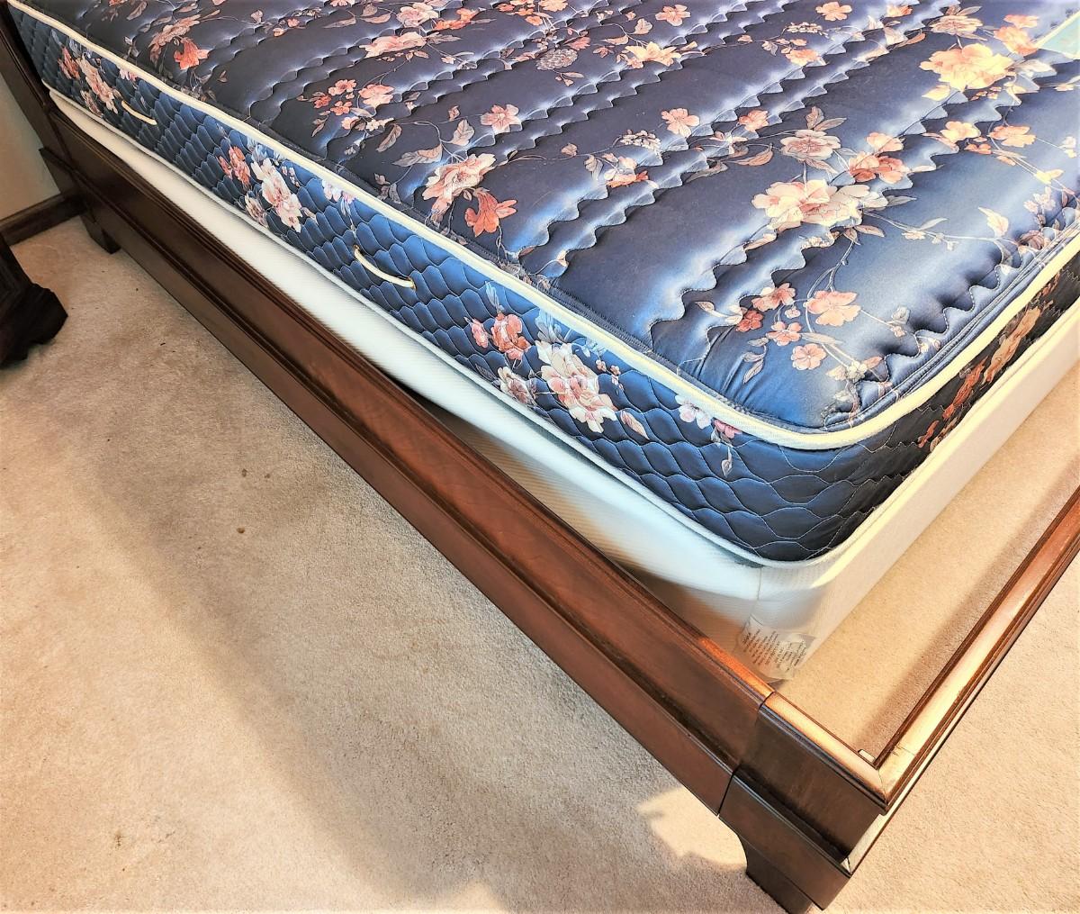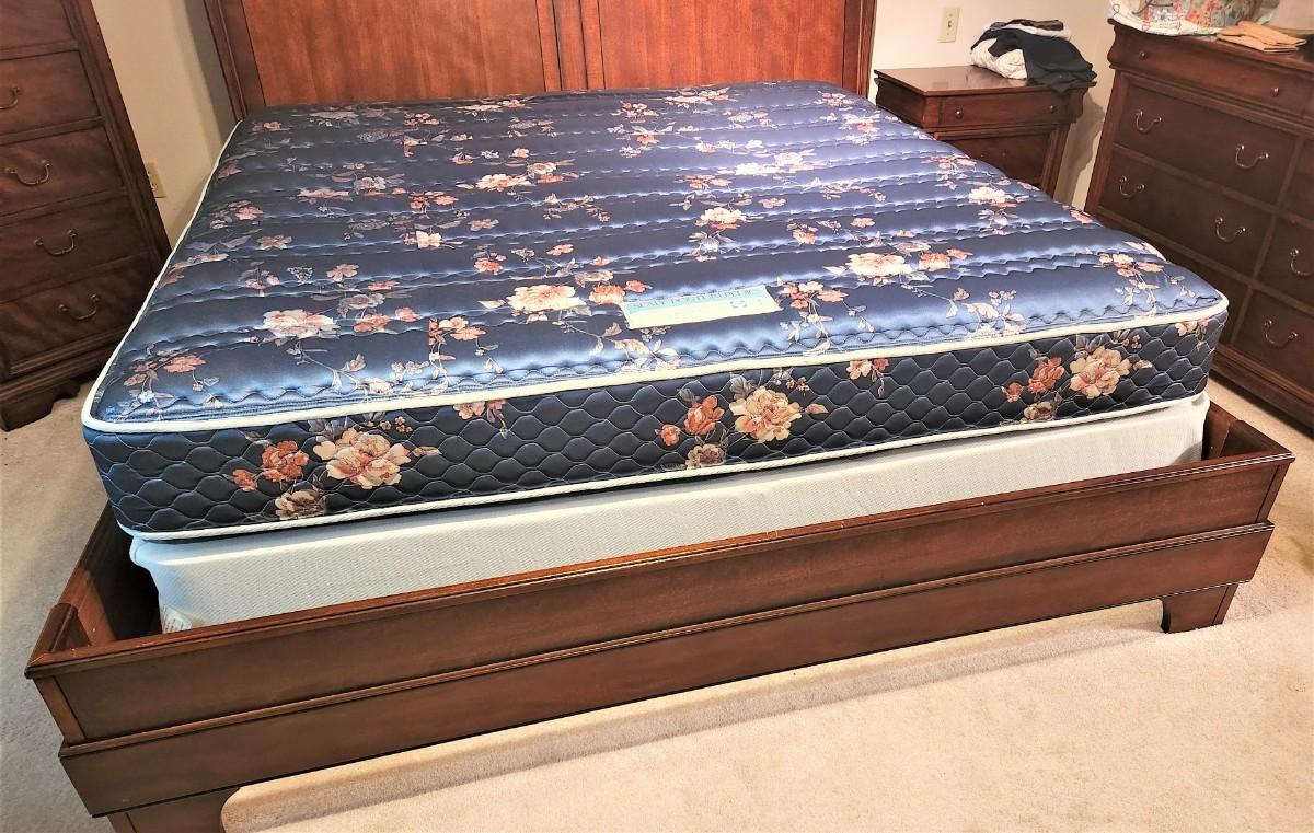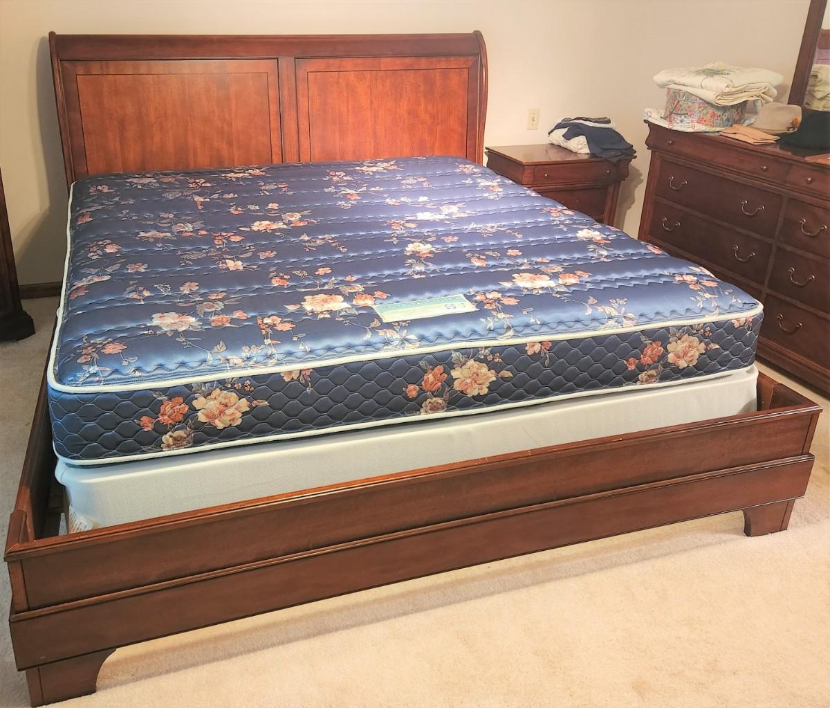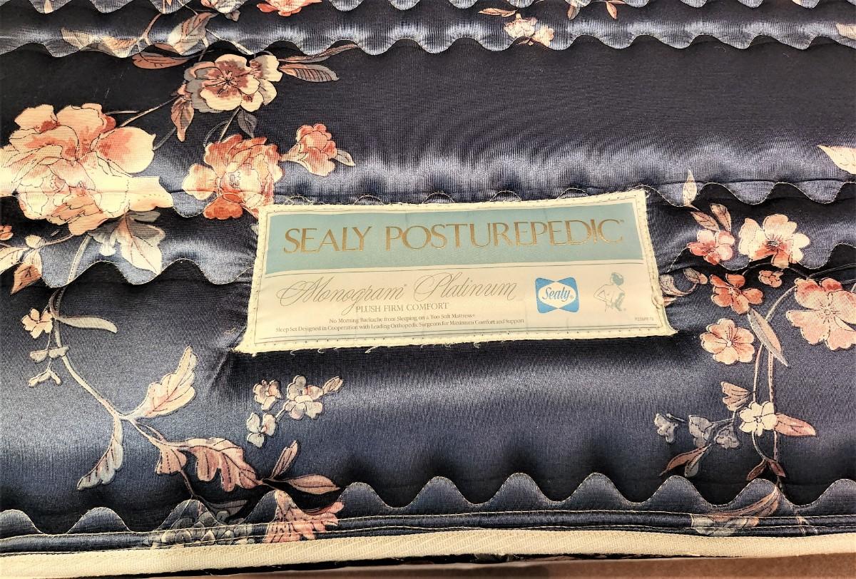 Attractive contemporary King bed - headboard, footboard, side rails, along with super clean Sealy Posturpedic Monogram Platinum Plush Firm Mattress, box springs. 81.5" across, 91.5" long, 49" tall. Only gently used. I tried out the mattress and it's quite comfy!