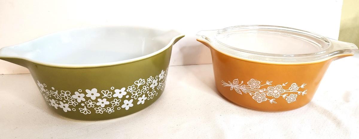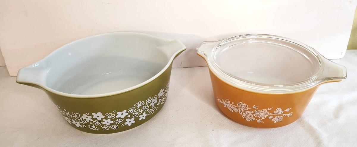 Lot of 2 vintage pyrex bowls - smaller one is 1.5 quarts (has lid) in the Butterfly Gold pattern - larger is 2.5 quarts (no lid) in the Spring Blossom pattern. Good gently used condition.