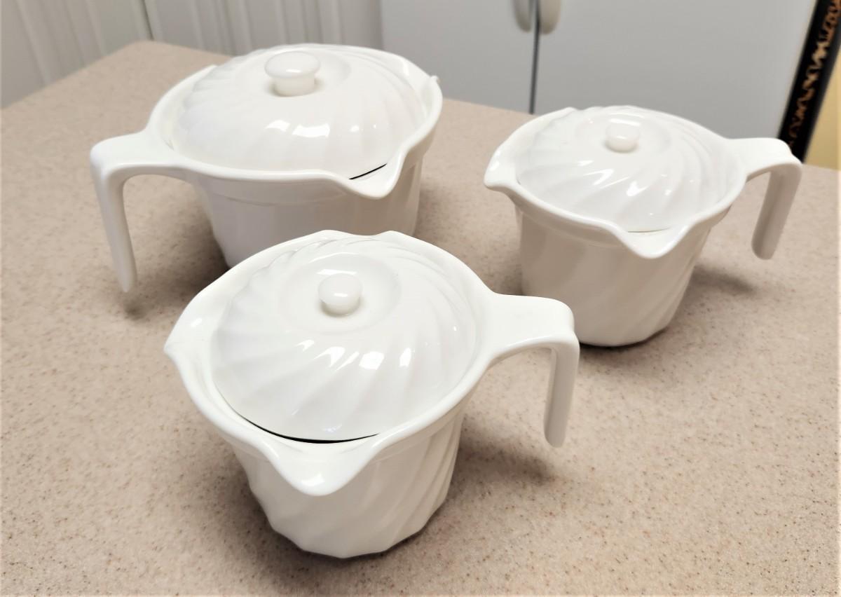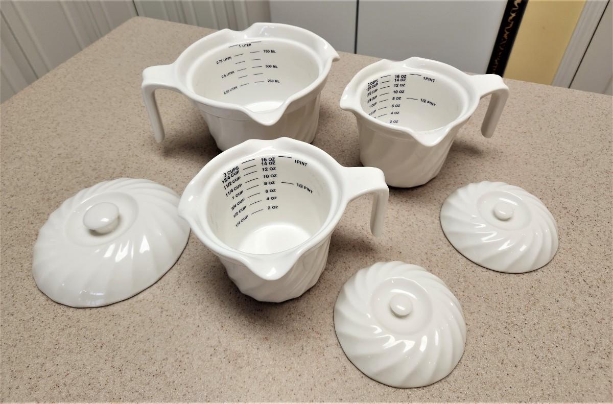 Lot #94 Lot of 3 White Stoneware Lidded Measuring Cups