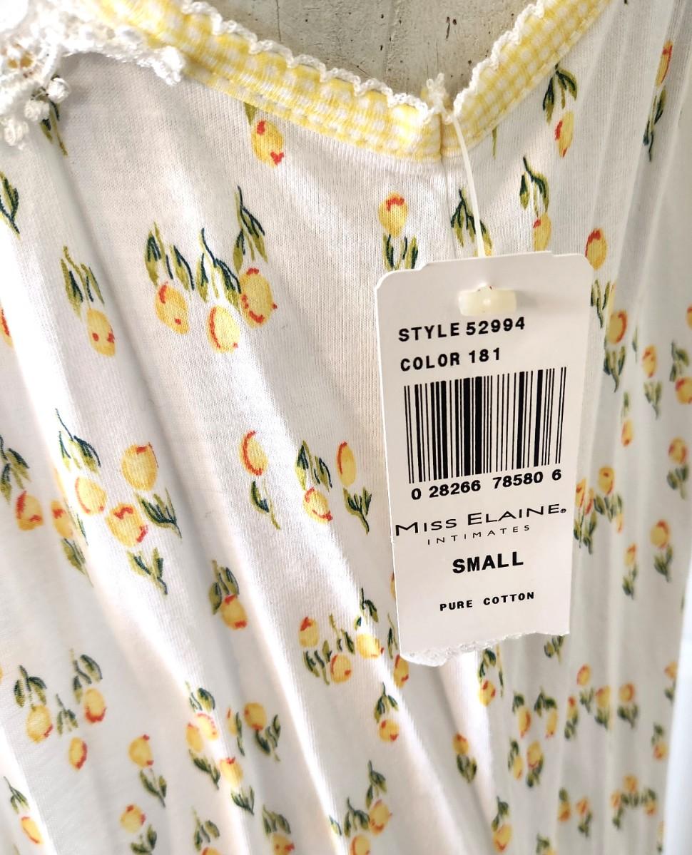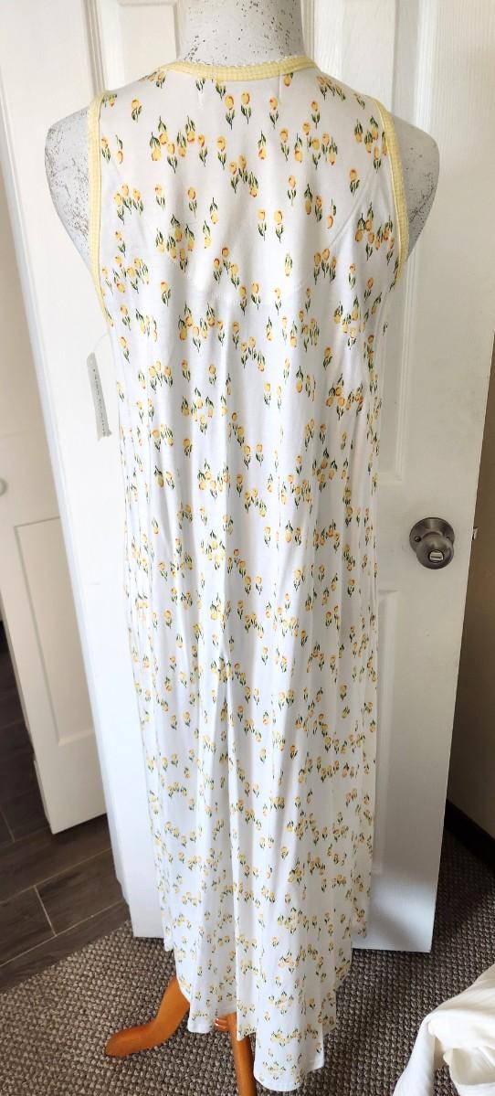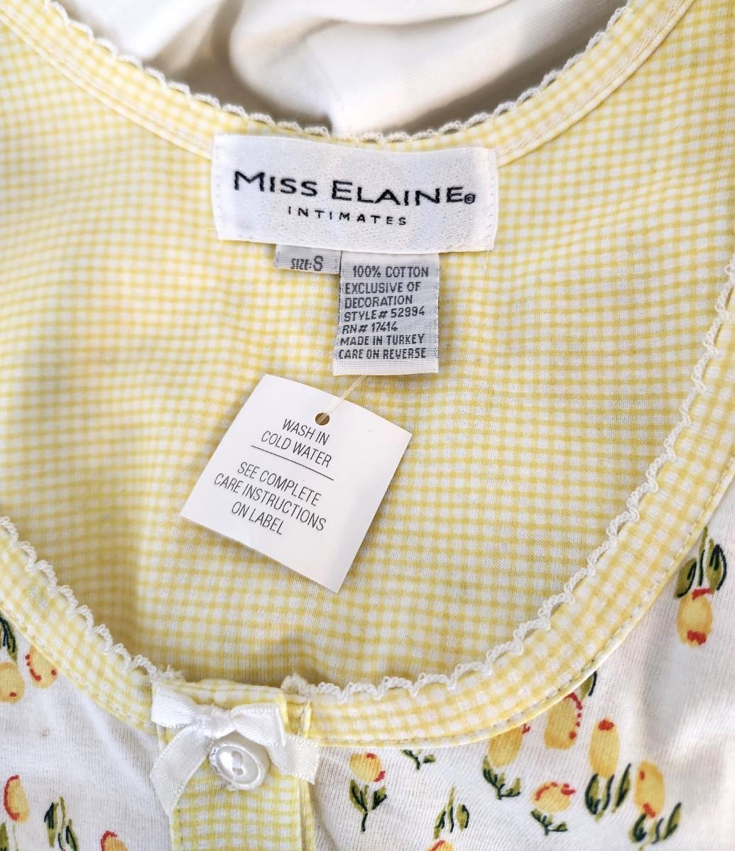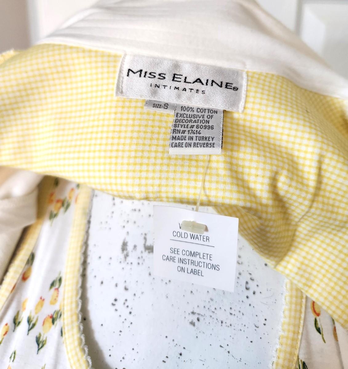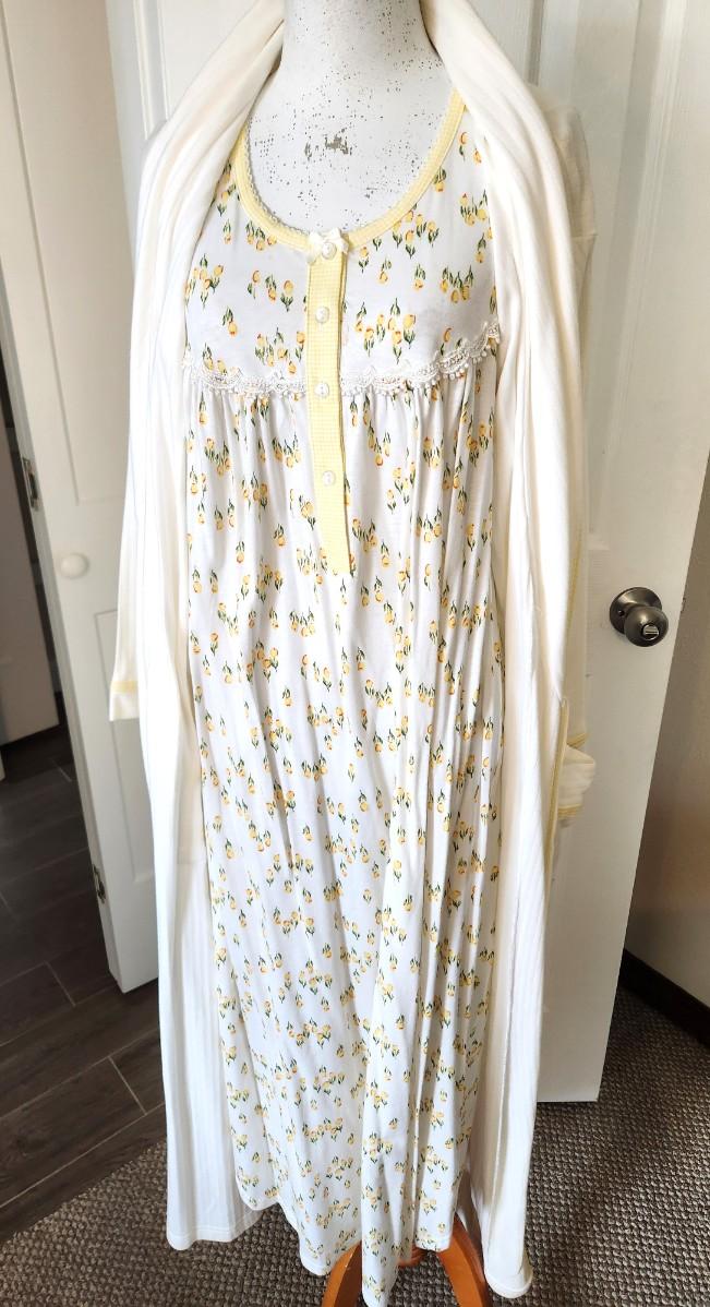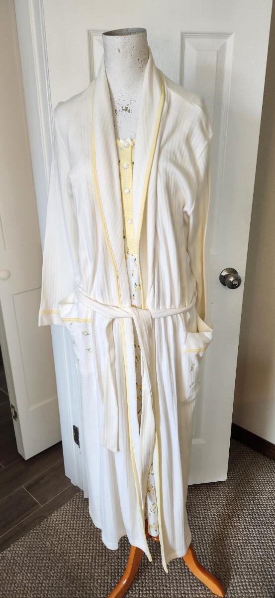 Pretty "Miss Elaine" nightgown/robe set - new with tags - yellow/white, yellow piping trim, 2 pockets on robe. Soft and comfy. Measurements: pit to pit 17", Length: 49". Robe has long sleeves - soft jersey material. No size noted, but I would consider this a Women's "small."