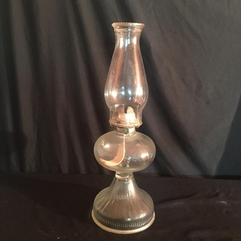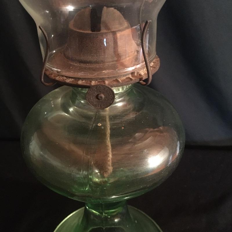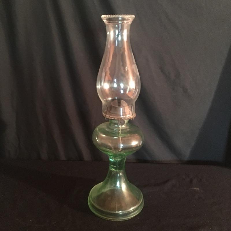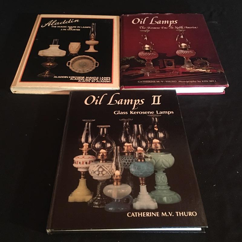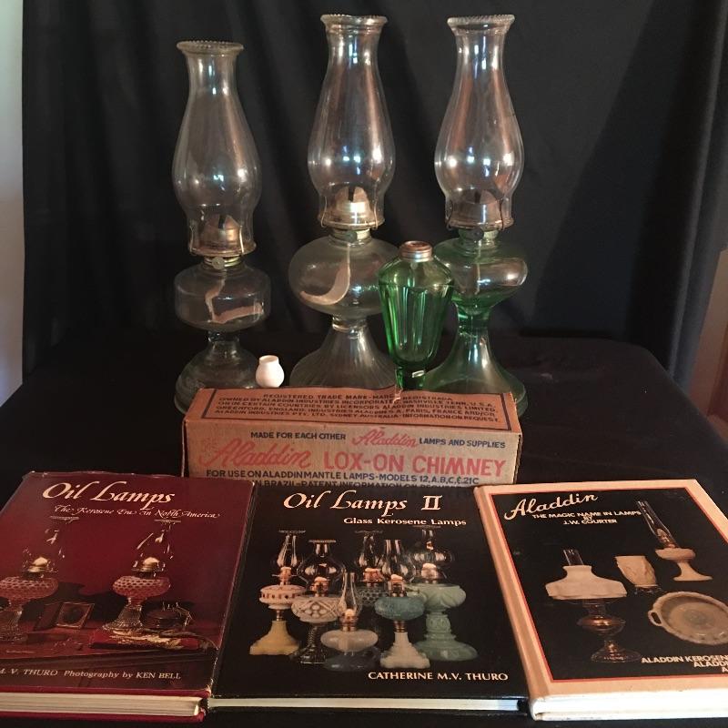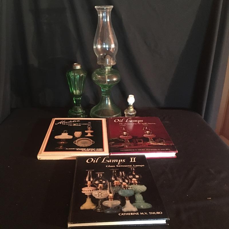 This array of lamps includes a small lamp marked Cressolene Kerosene Vapo Use, two clear glass lamps, two green tinted glass lamps with one missing globe and lamp apparatus, Aladdin glass in box and three books on oil lamps. Tallest lamp measures 6”D x 18” tall