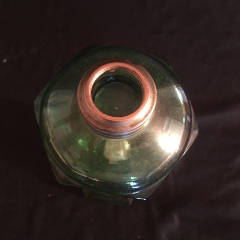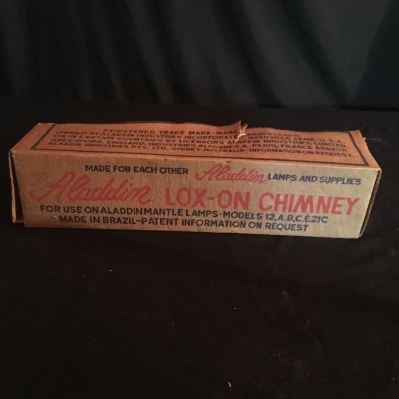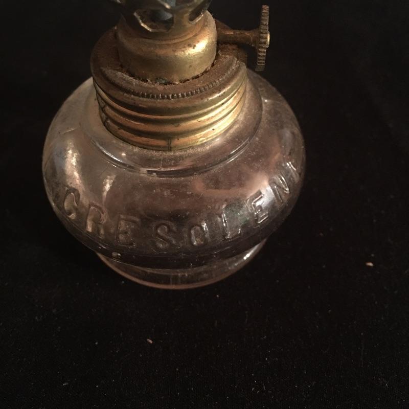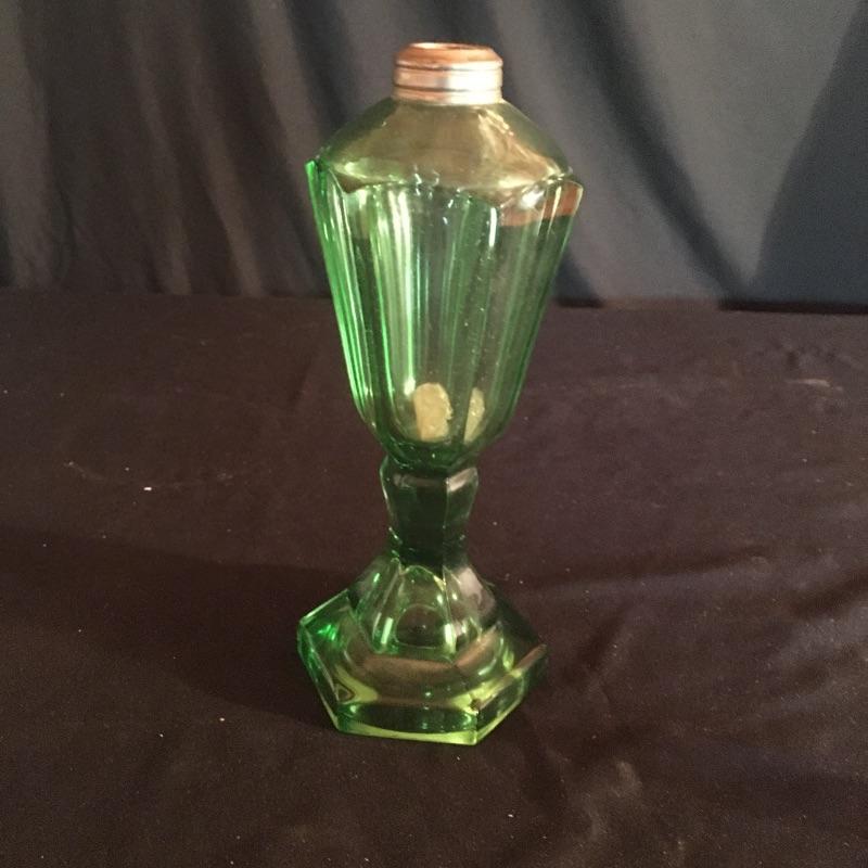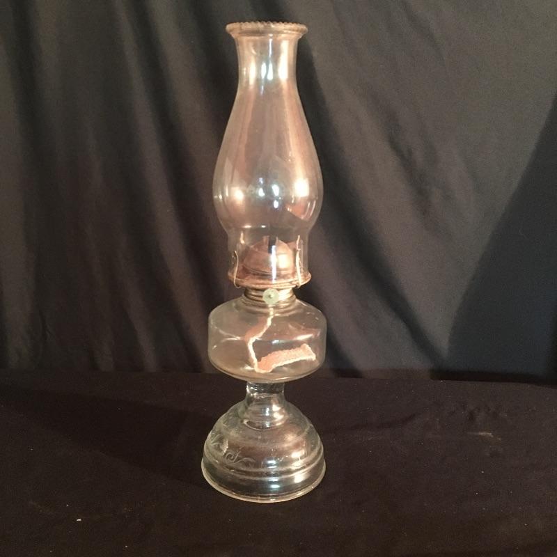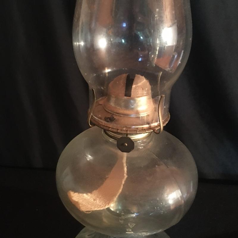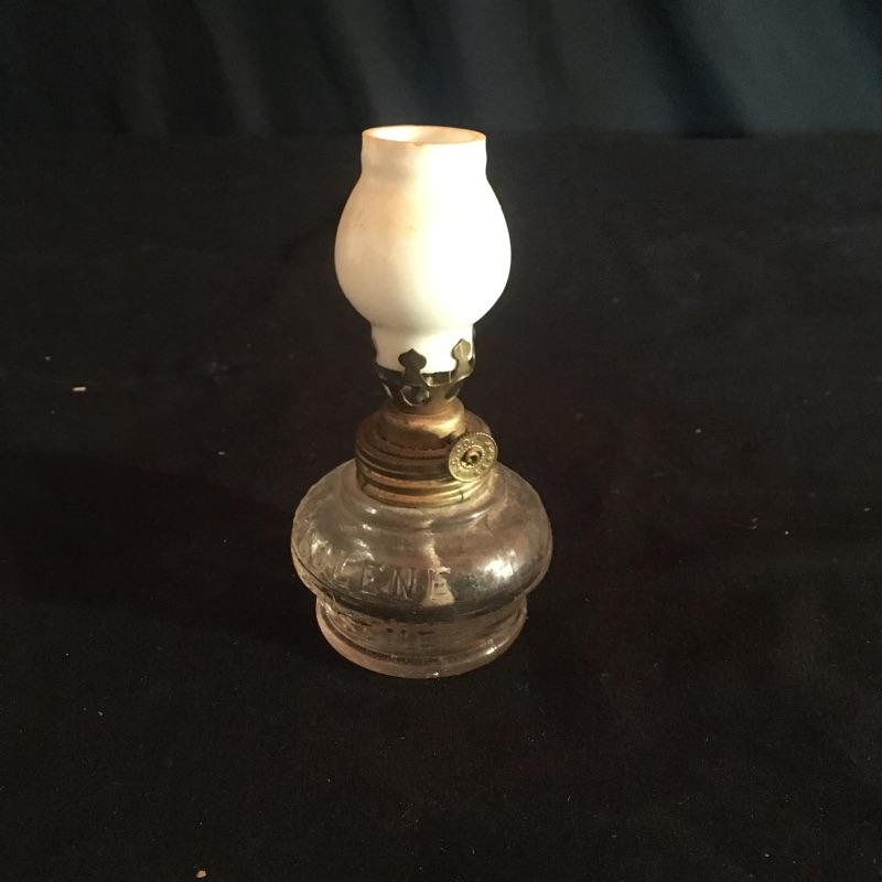 This array of lamps includes a small lamp marked Cressolene Kerosene Vapo Use, two clear glass lamps, two green tinted glass lamps with one missing globe and lamp apparatus, Aladdin glass in box and three books on oil lamps. Tallest lamp measures 6”D x 18” tall
