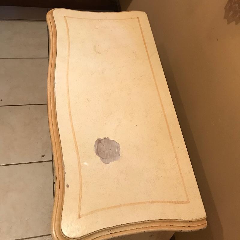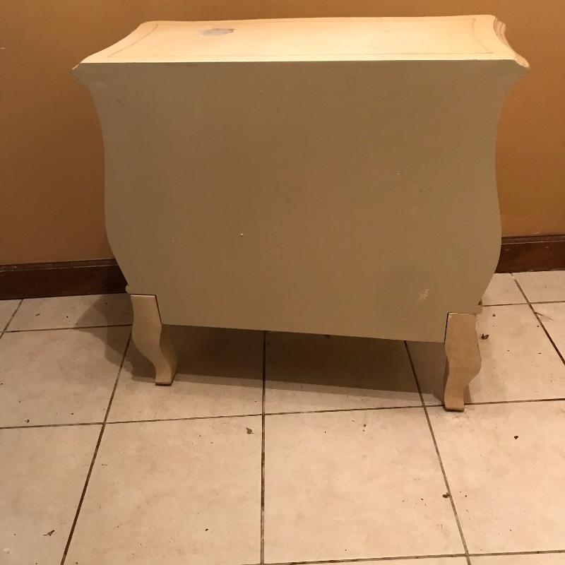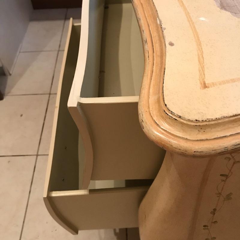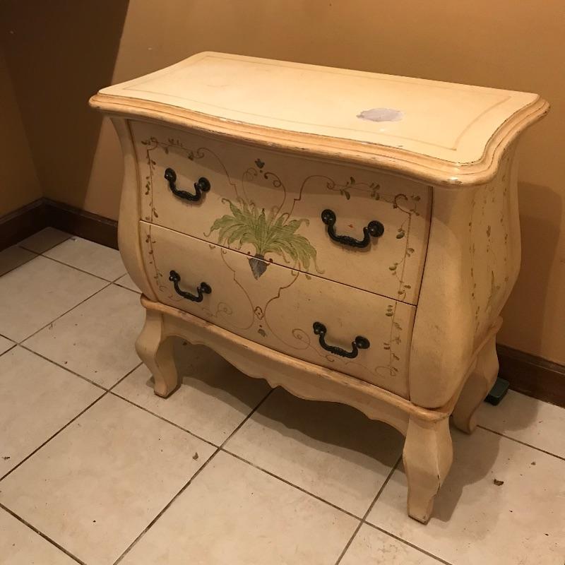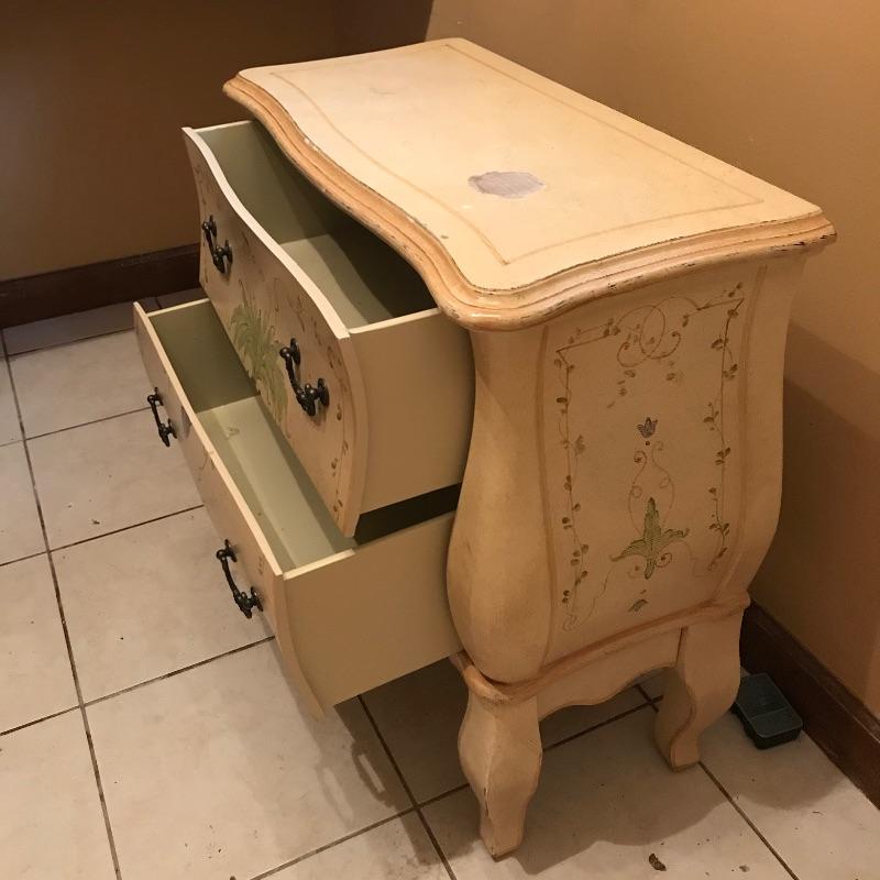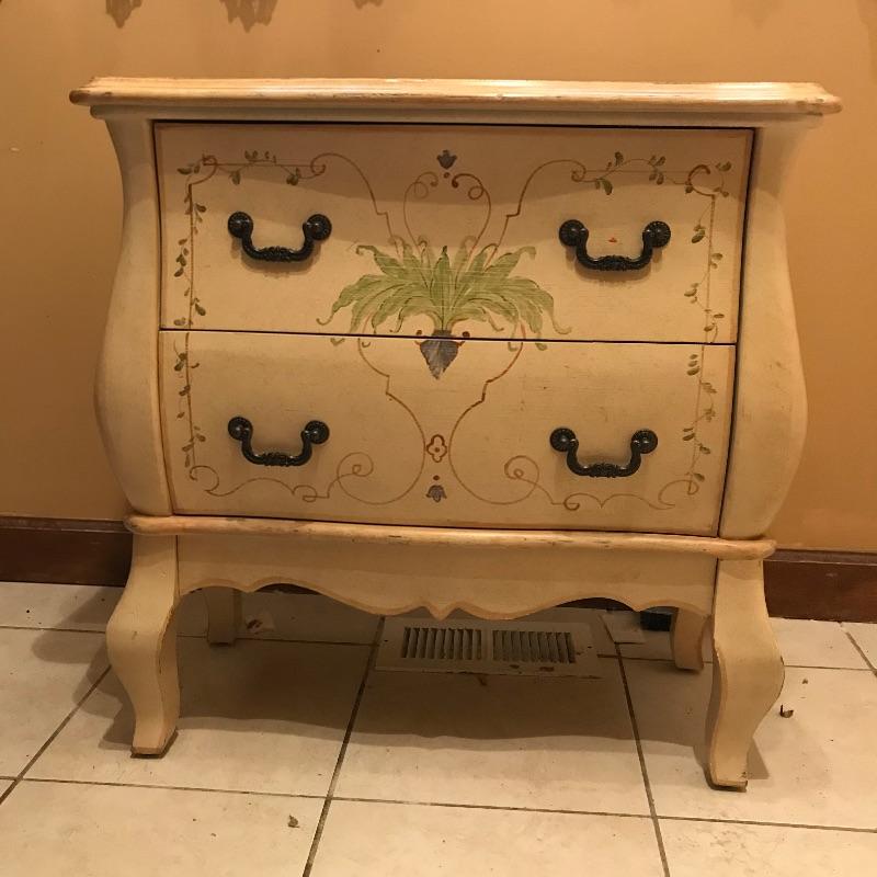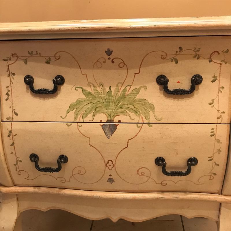 Wooden two drawer dresser with ornate painted designs on three sides. Piece has two drawers with metal pulls and drawers glide smoothly. The entire piece appears to be solid wood, but with it painted on all surfaces, we cannot confirm. The look has an antique finish with many small blemished that blend in with the look. The top, however, has a mug sized spot where the paint has been removed. Piece measures approximately 28” x 13” x 28.5”. Local pick up only.