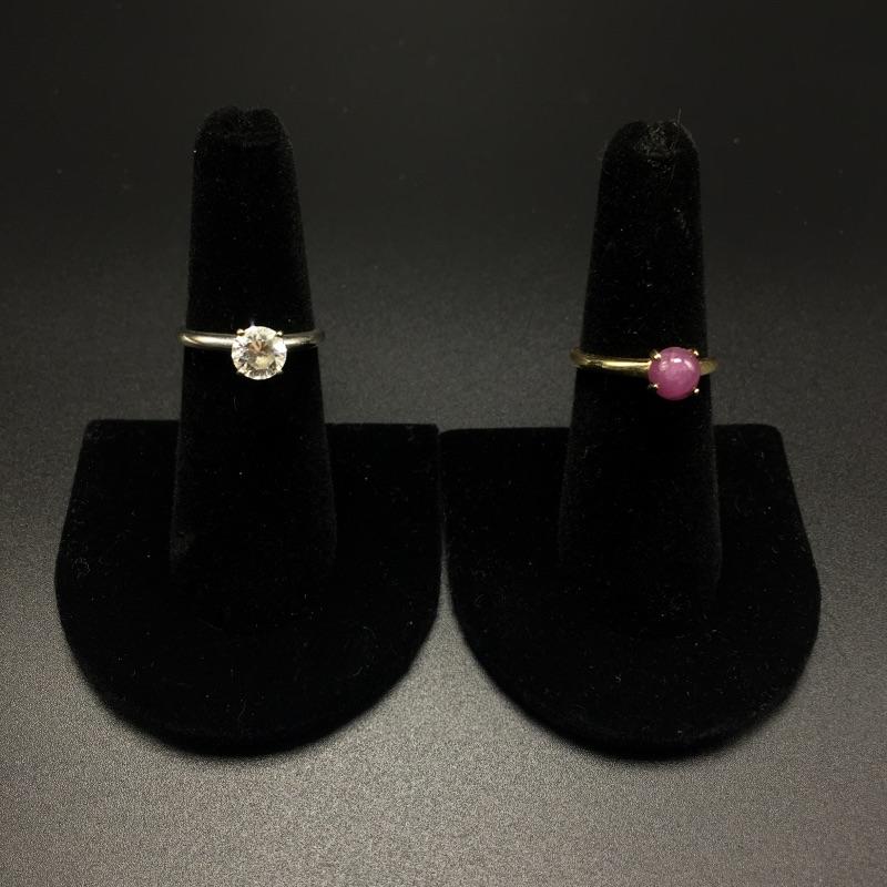 Pair of rings. Cubic Zirconia ring is 14K and pink stones ring has no markings. See pictures for sizes.