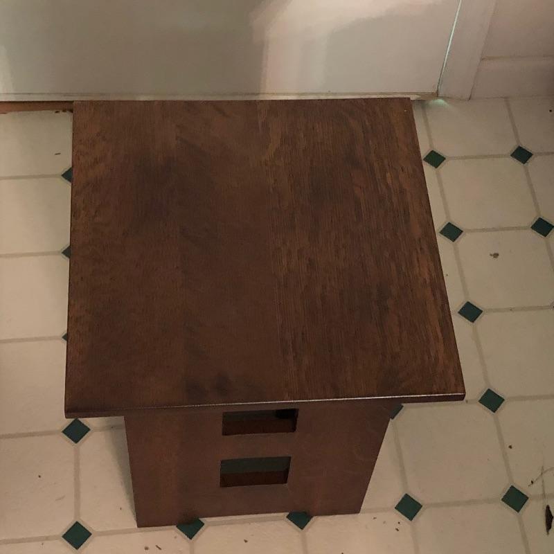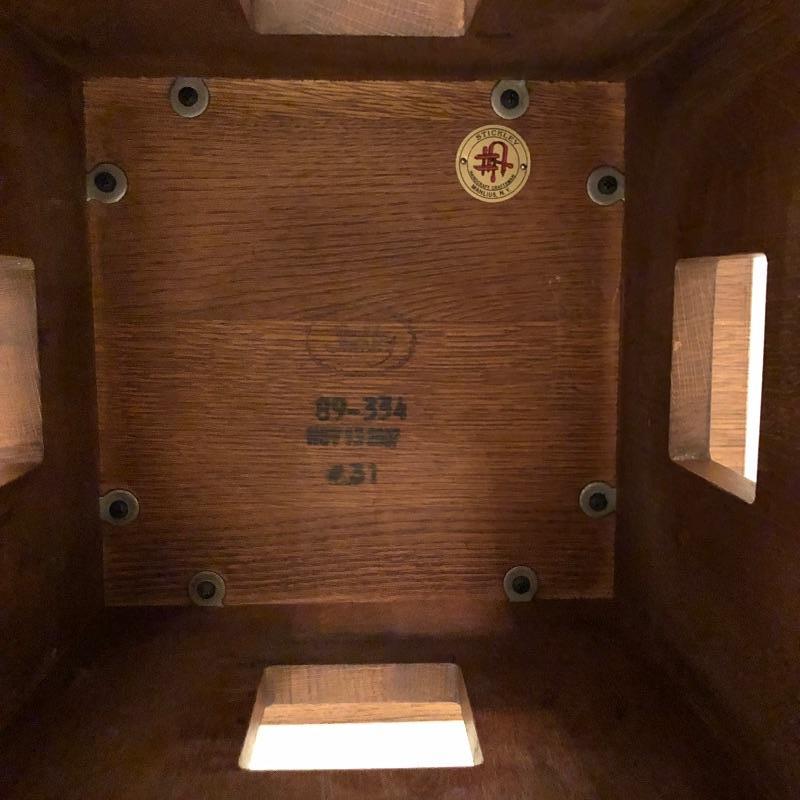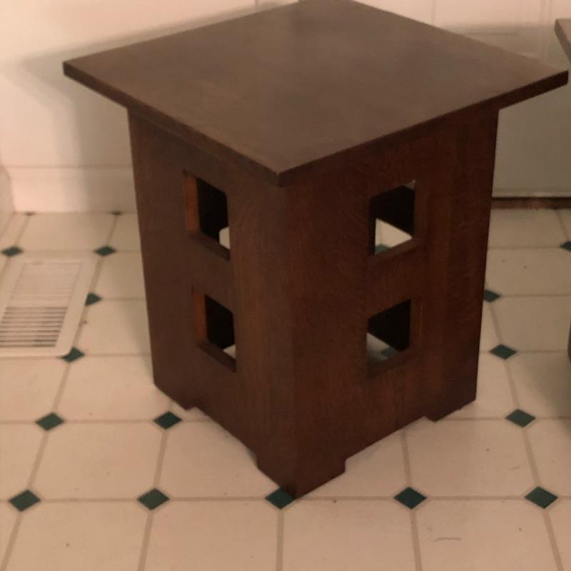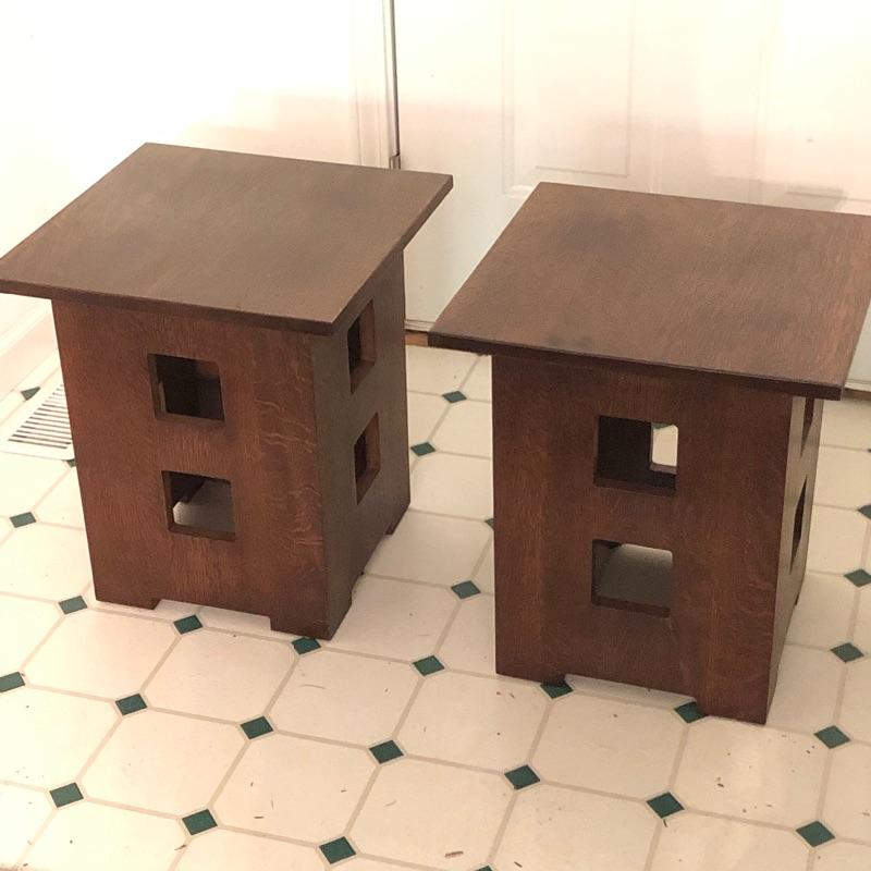 We have two matching Stickley Limbert Tabouret tables for you here that measure 16” square and stand 18” tall. Cube shaped they have two square cut outs on each side, see images. From the Stickley Mission Collection, these two pieces are sturdy and versatile as they can be bunched together to make a bigger table.