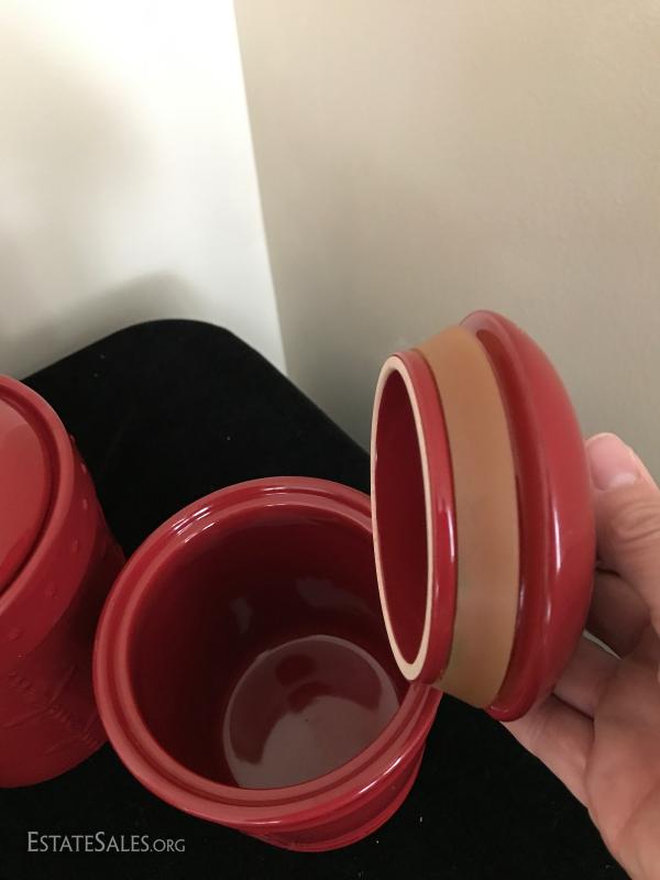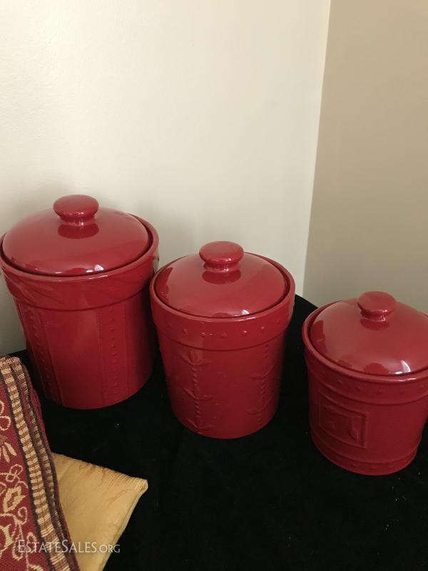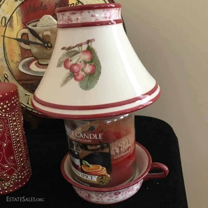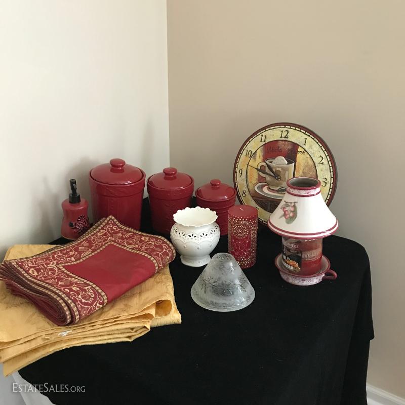 3 red sealing lid canisters, two yankee candle jar shades, wall clock, tart dish, decorative pillar candle, soap pump, 7 placemats and rectangle gold tablecloth. This lot is available for local pick up in Mills River, NC only.