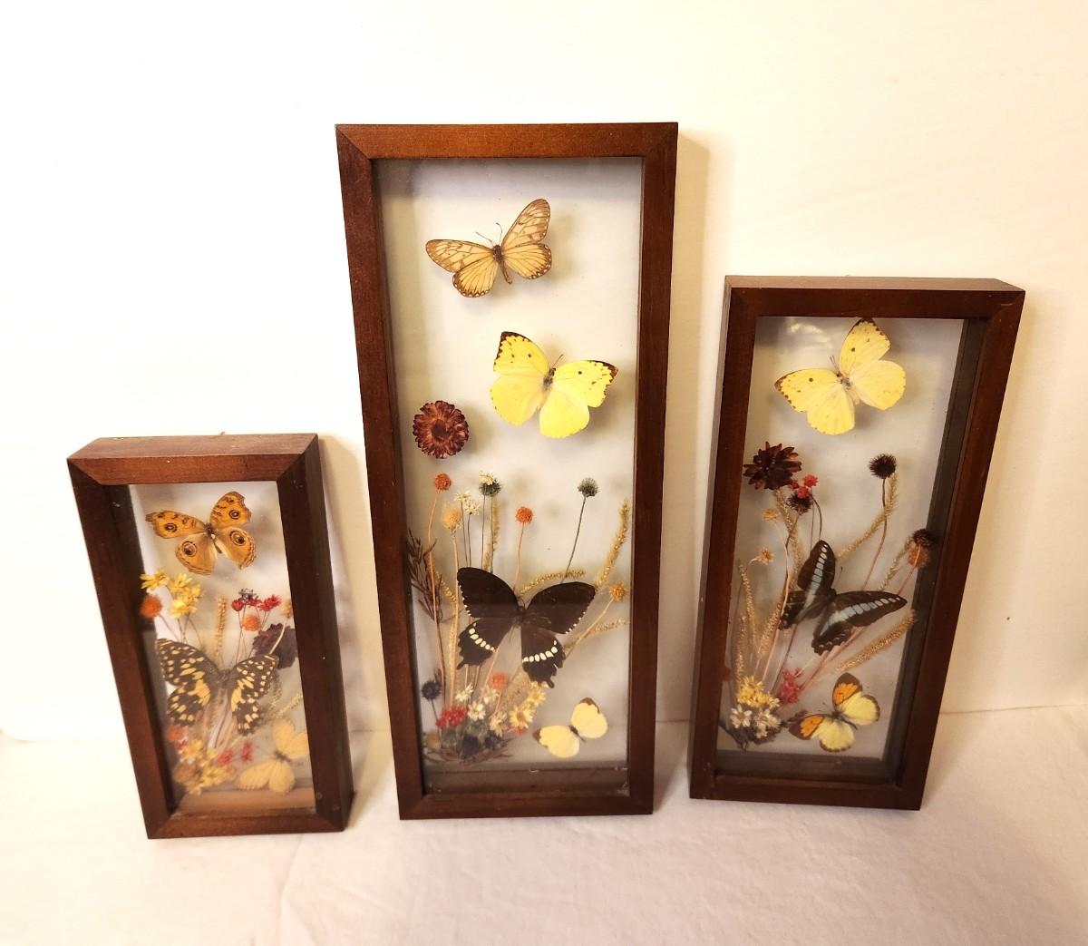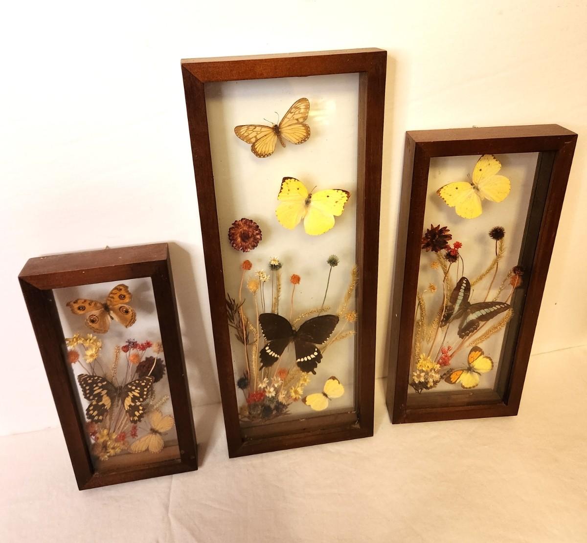 Great trio of 1970s wall decor featuring real butterfly specimens. good condition - 16" tall, 12.5" tall, and 10" tall.