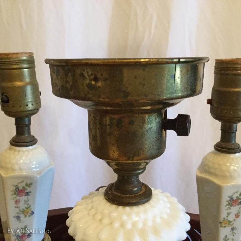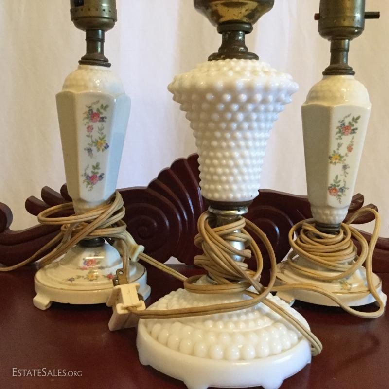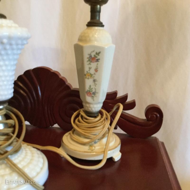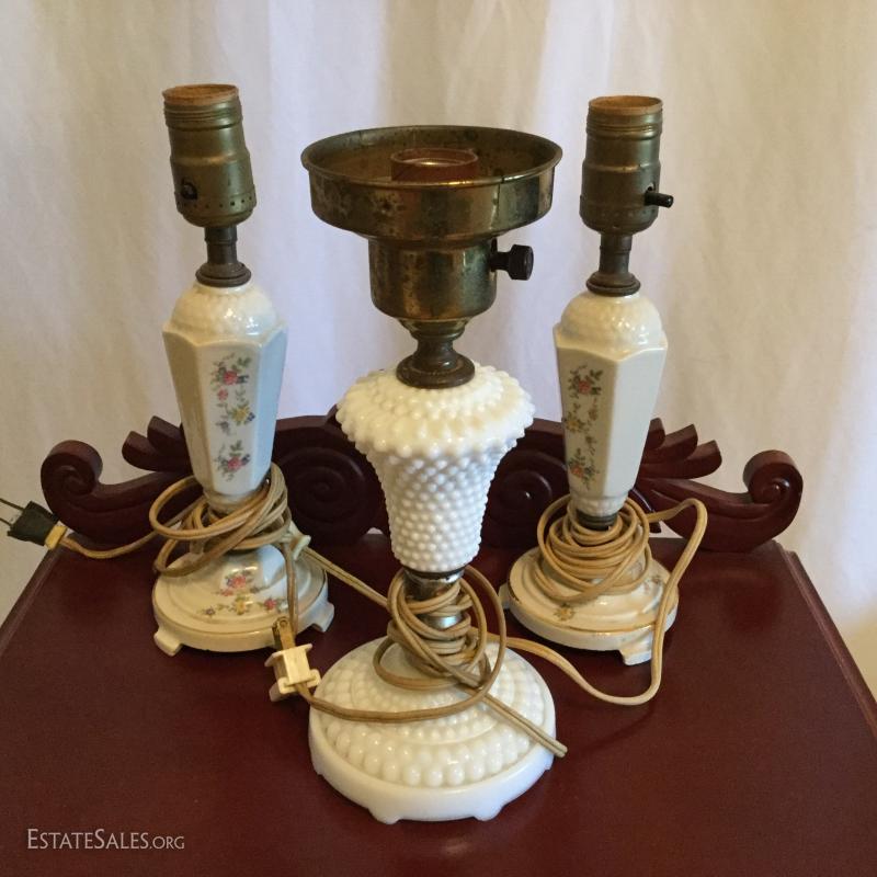 2 matching porcelain lamps with painted floral, 10.5" tall and 1 white hobnail milk glass lamp also 10.5" tall. Local pick up only Columbus, NC