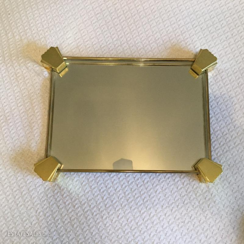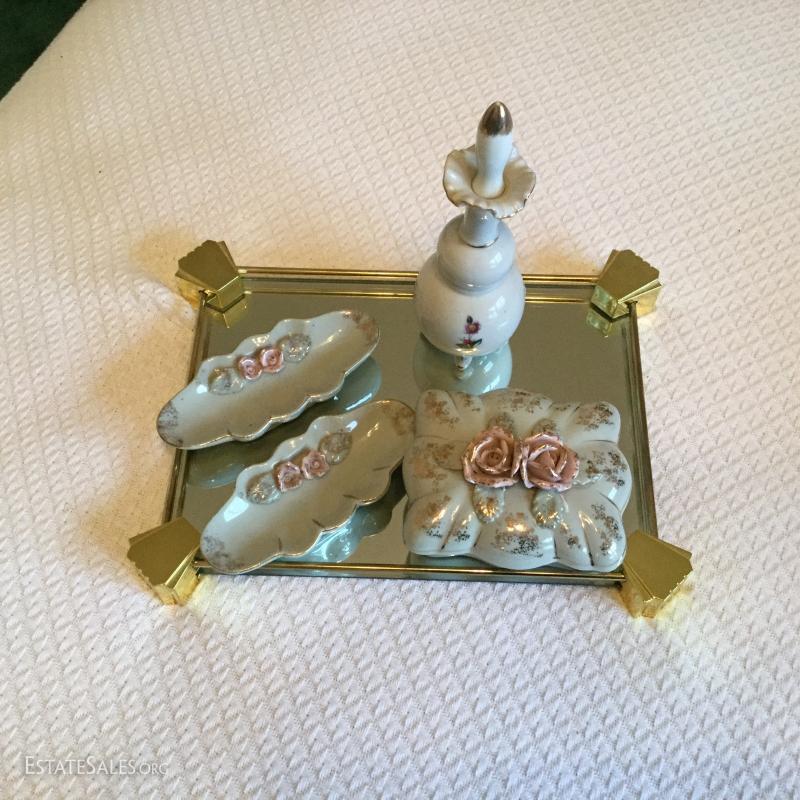 Brass vanity tray with mirror and 6 piece porcelaine set (including lids).
