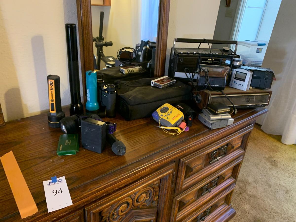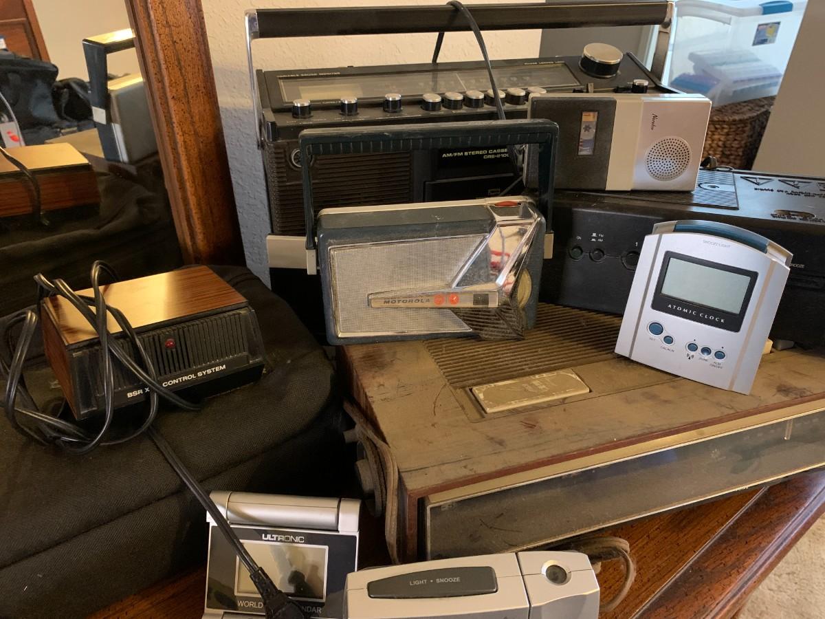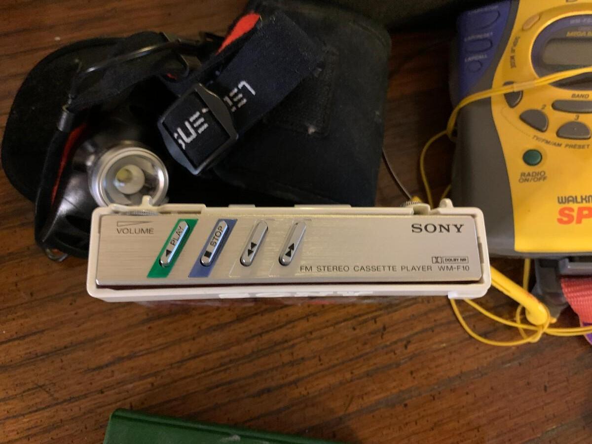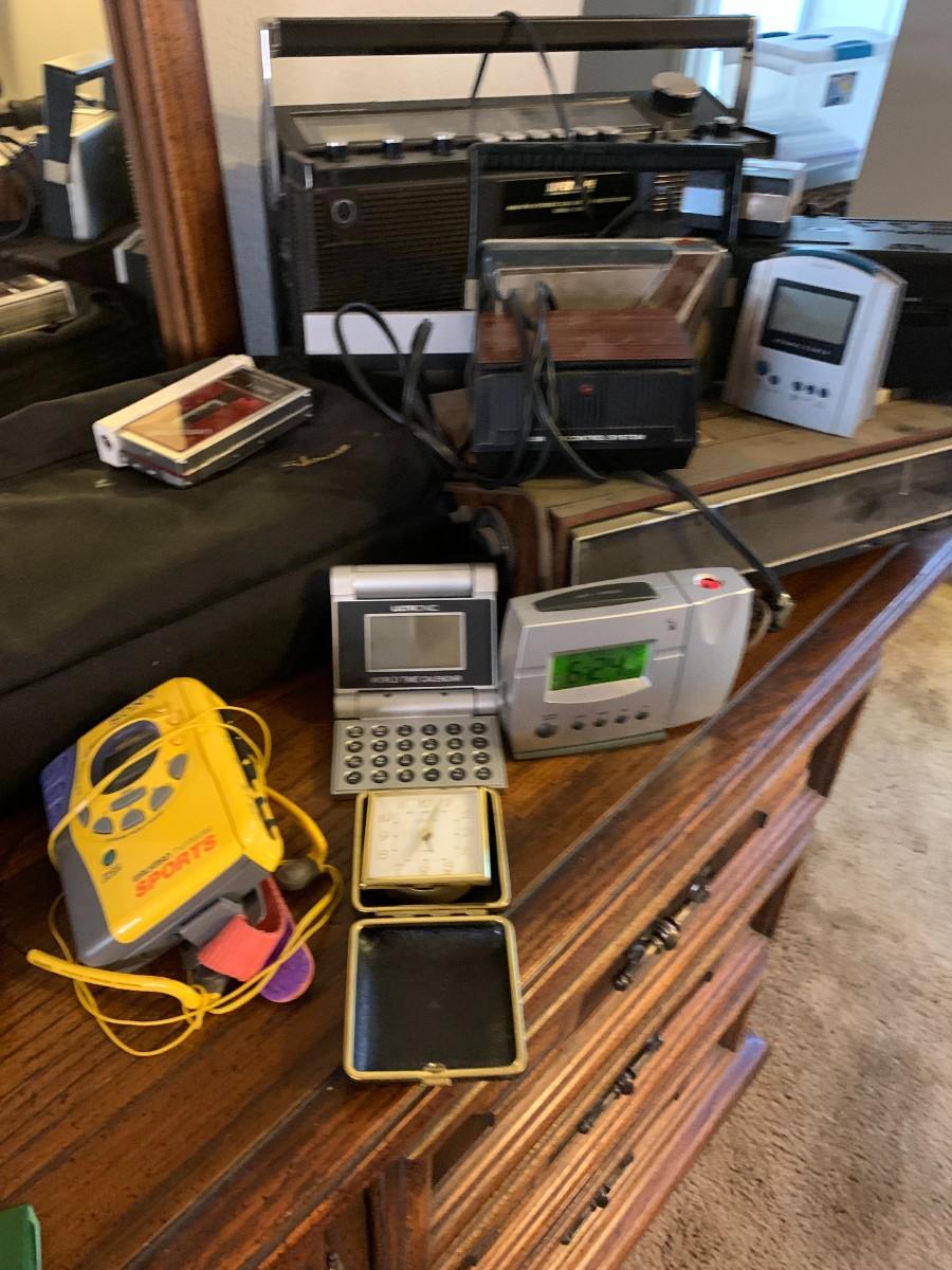 Vintage Sony Walkmans includ WM-F10. Flashlights. 1 pair Pentax binoculars with binocular filters. Superscope AmFmCassette with variable sound monitor. Travel alarm clocks, 2 vintage electric alarm clocks. Vintage Magnavox and Norelco portable radios. None tested.
