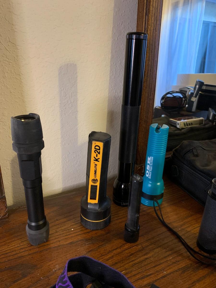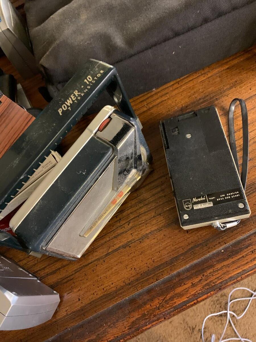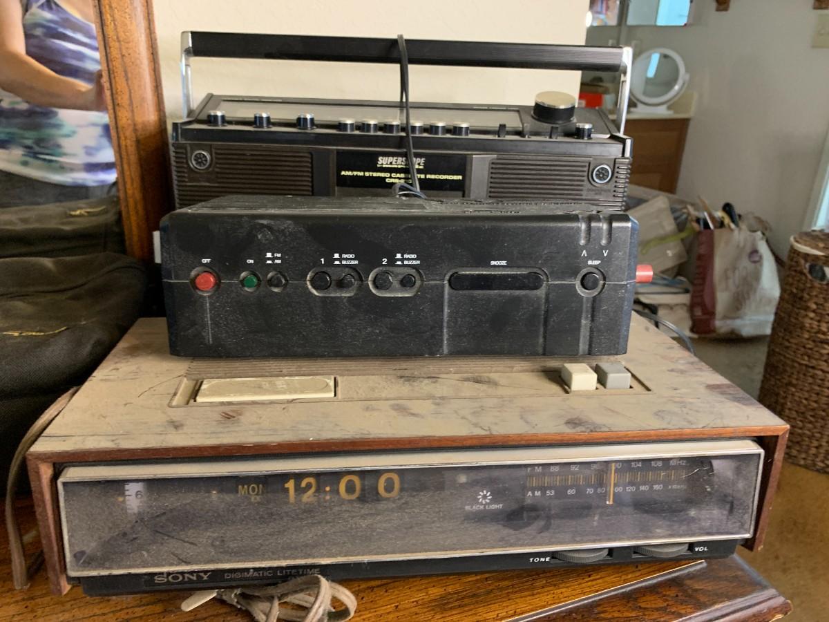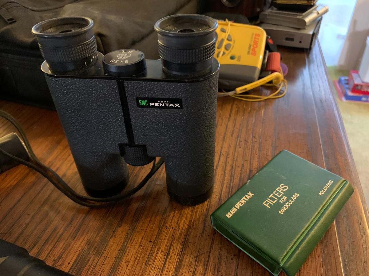 Vintage Sony Walkmans includ WM-F10. Flashlights. 1 pair Pentax binoculars with binocular filters. Superscope AmFmCassette with variable sound monitor. Travel alarm clocks, 2 vintage electric alarm clocks. Vintage Magnavox and Norelco portable radios. None tested.