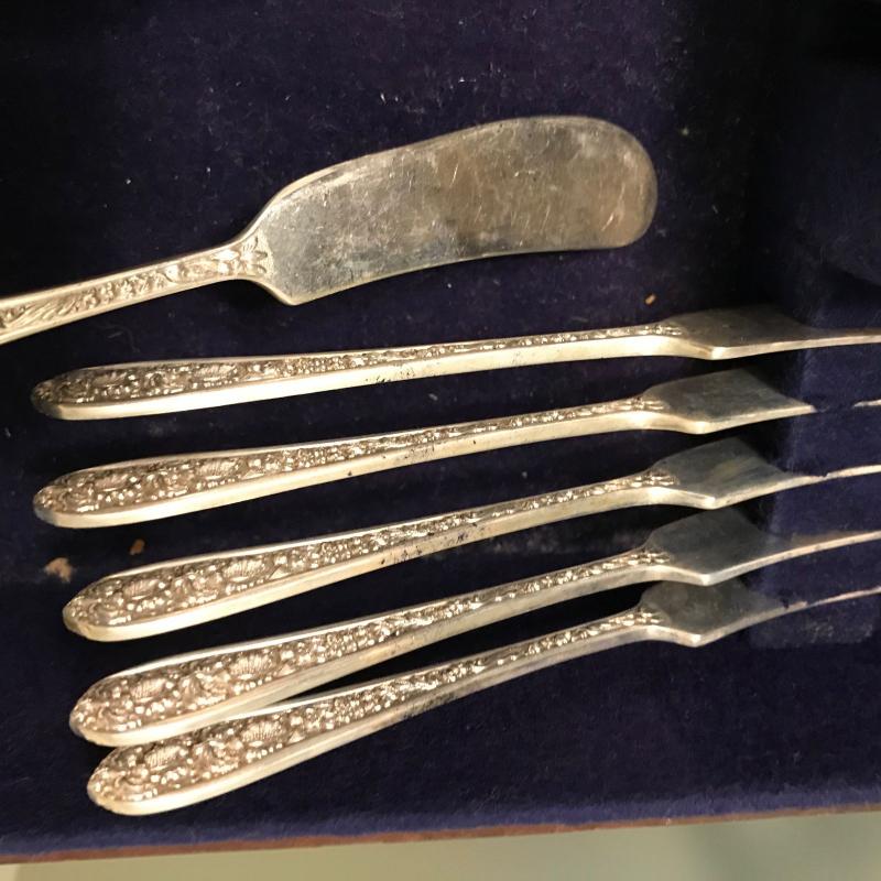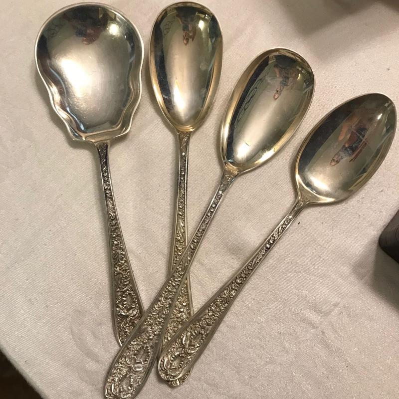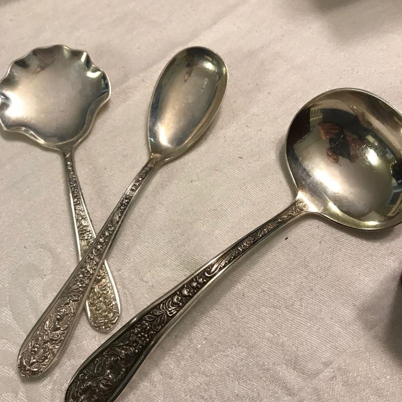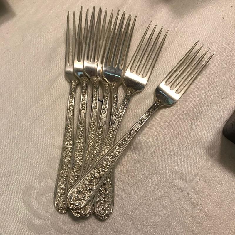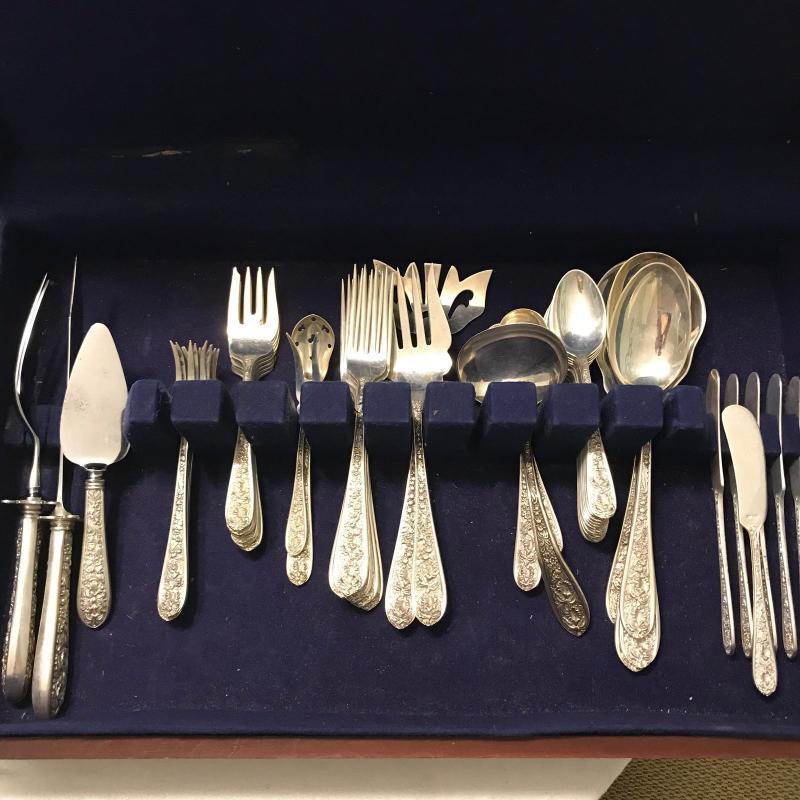 Gorgeous Sterling Silverware by Stieff. Service for 6 with a few extra pieces as well as serving pieces. Does NOT include knives. Storage box included. Starting price is at or near melt value. Shipping Available.