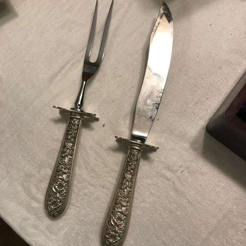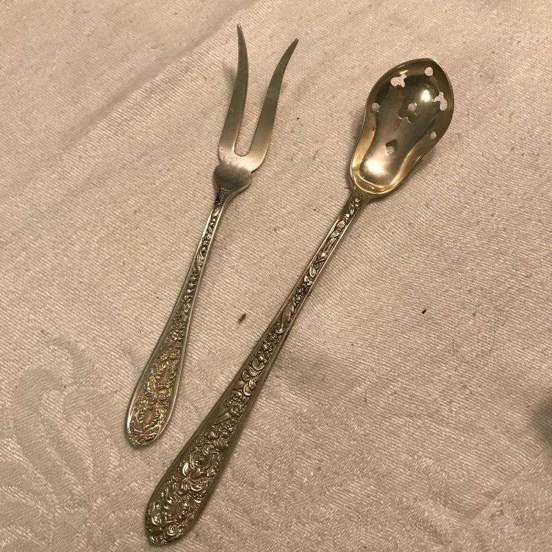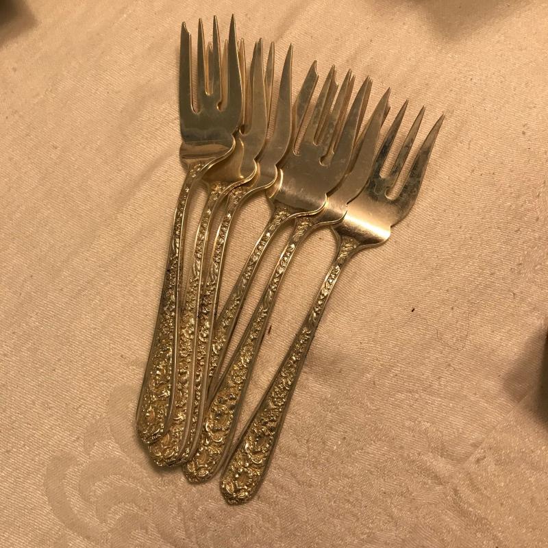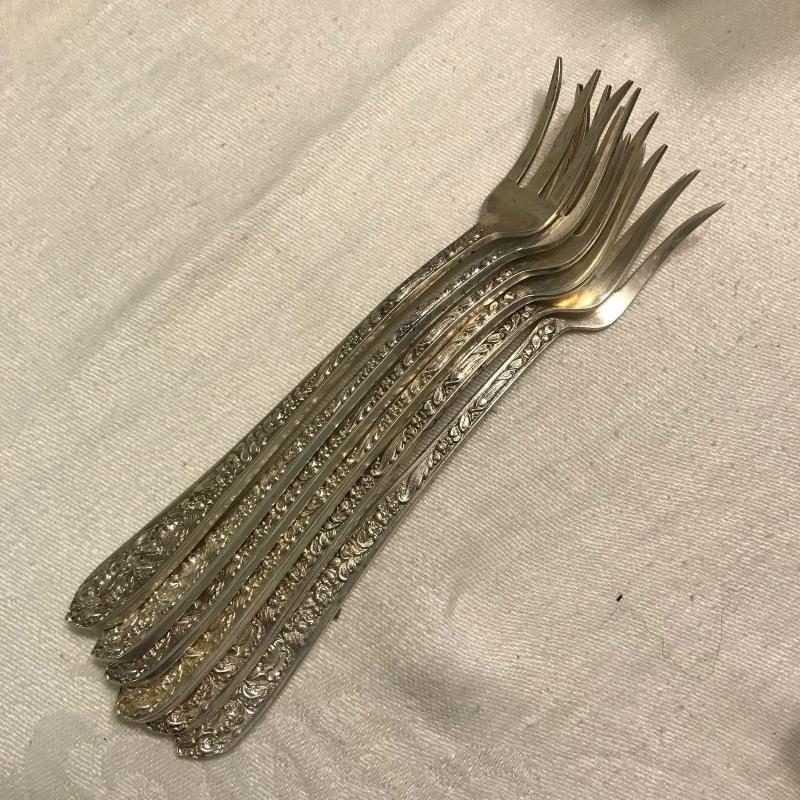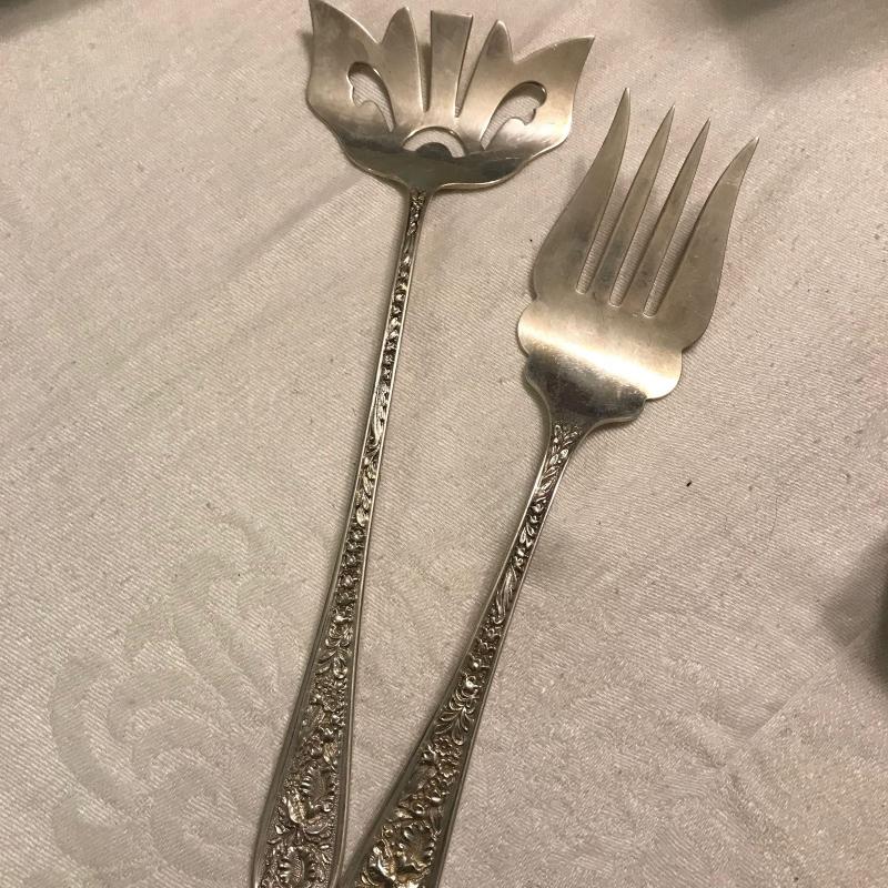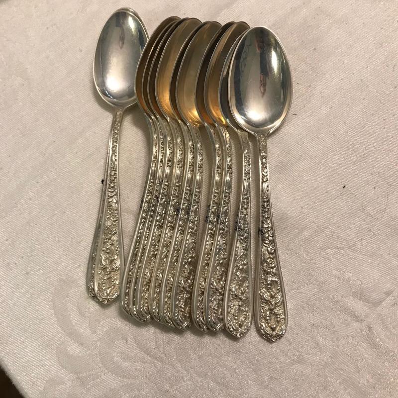 Gorgeous Sterling Silverware by Stieff. Service for 6 with a few extra pieces as well as serving pieces. Does NOT include knives. Storage box included. Starting price is at or near melt value. Shipping Available.