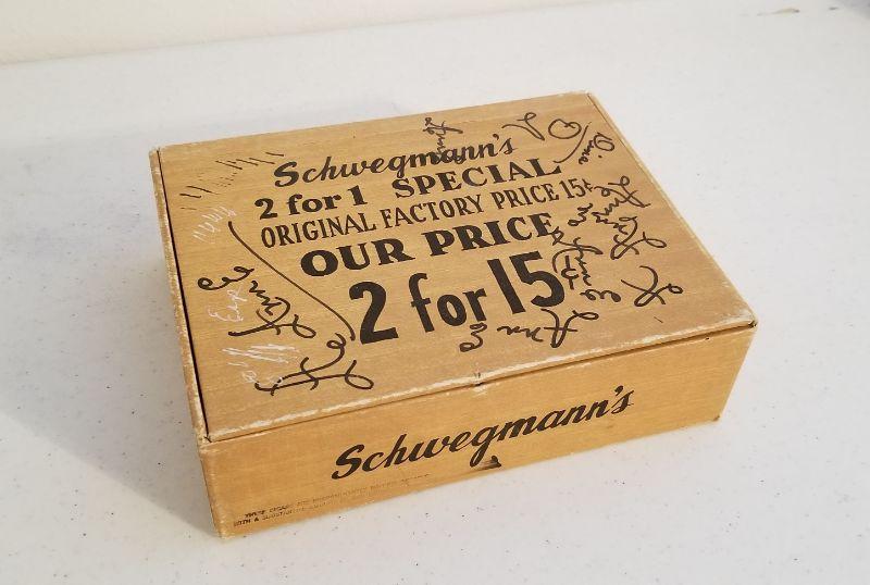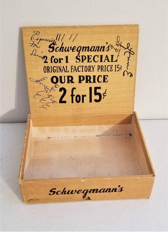 Cool vintage store display cigar box from Schwegmann's - 2 for 15 cents! Measures 9.75" x 6". Holds 50 cigars. Has some writing on it, as shown. Rather scarce.