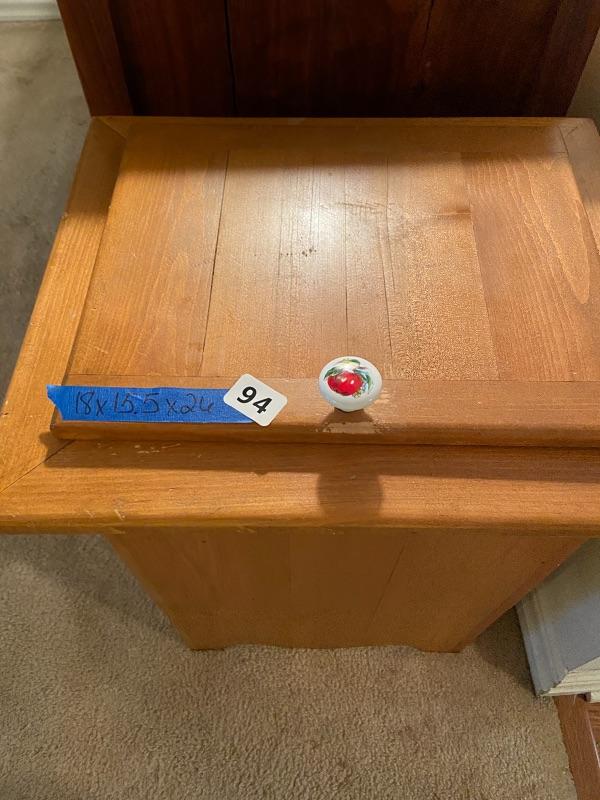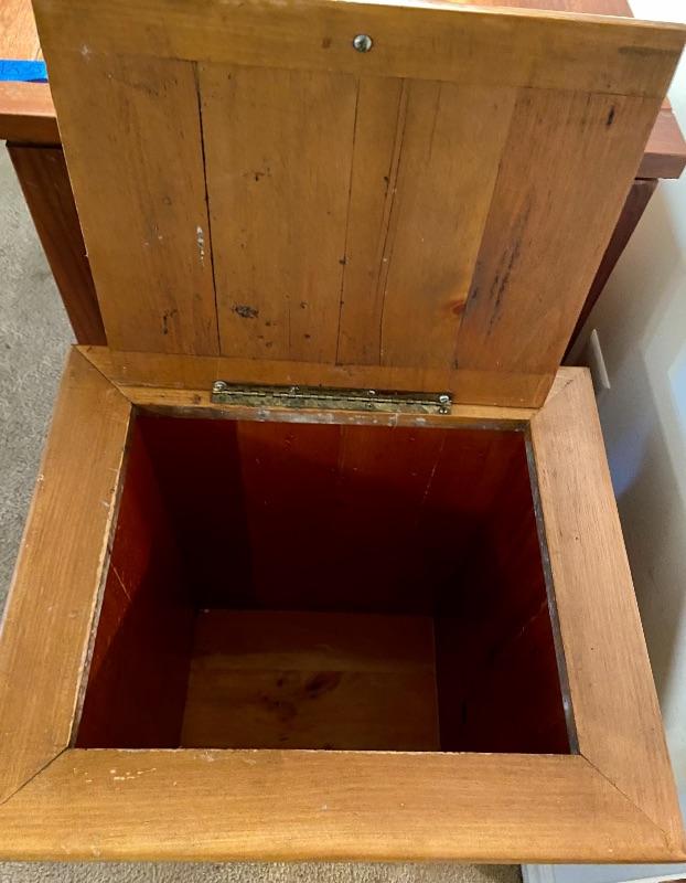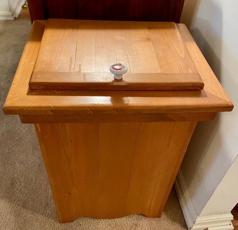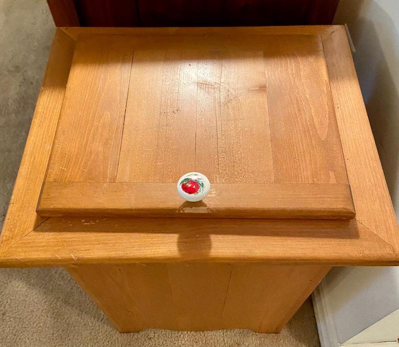 Tall vintage oak trashcan/hamper with hinged lid and apple knob 18Lx15.5Wx26H. MHW