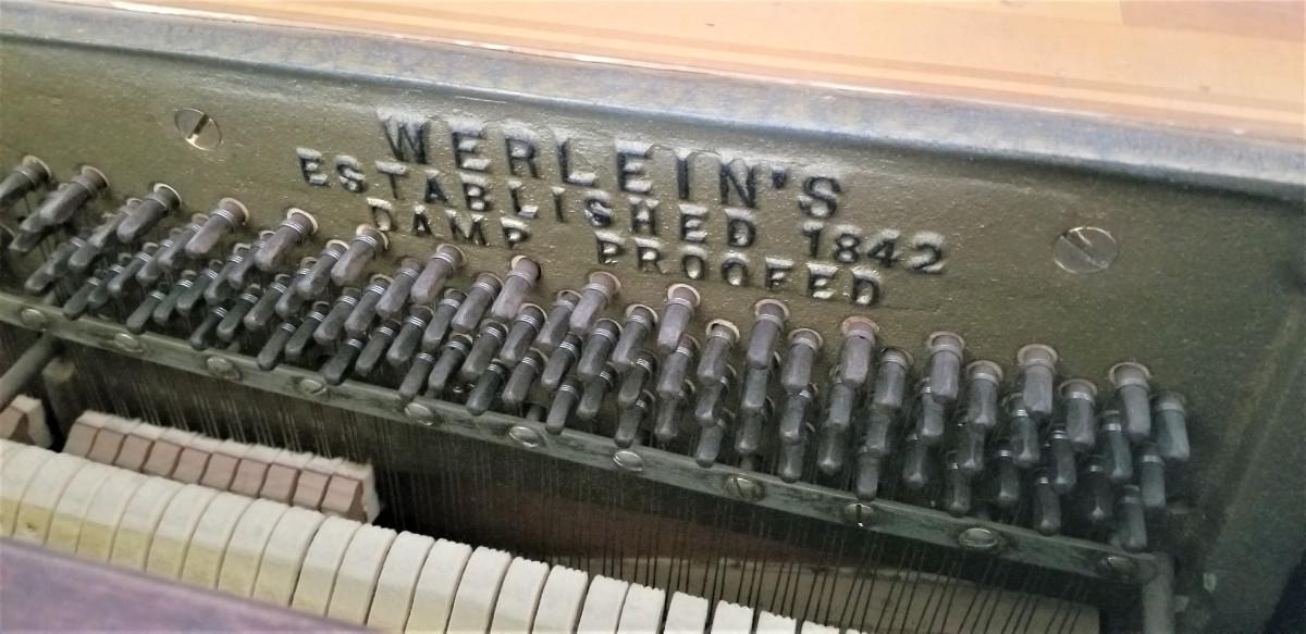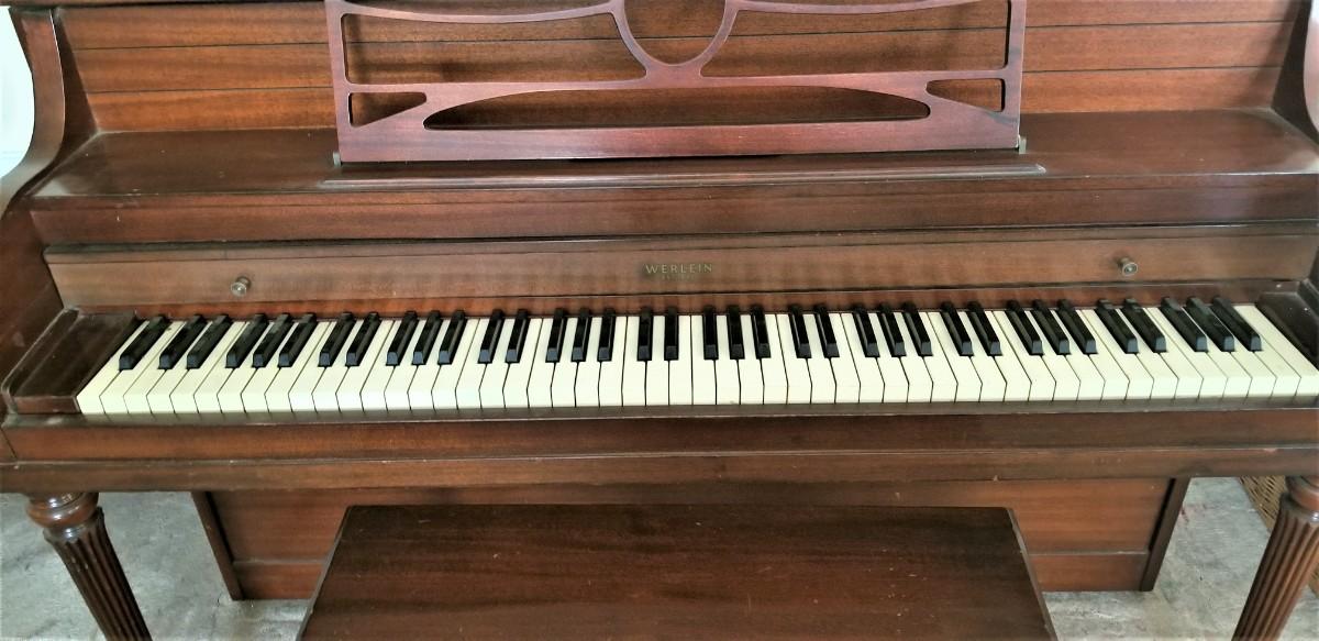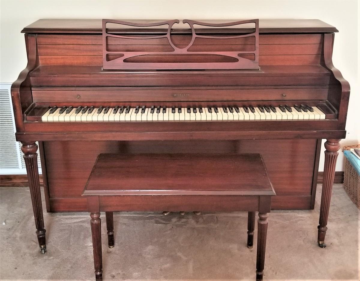 If you are looking for something for your kid to learn to play on, this is it. Werlein Studio piano - perfect for home use/the casual player/Student. Original owners - has been sitting unplayed for awhile - FLAT, needs a tune (you would have to tune it anyway after moving it). Come with bench. Clean, inside felts look good, all keys play. 55.5" wide, 24" deep, 39.5" tall. Whoever purchases this will be entirely responsible for moving/hauling it themselves (we cannot assist).