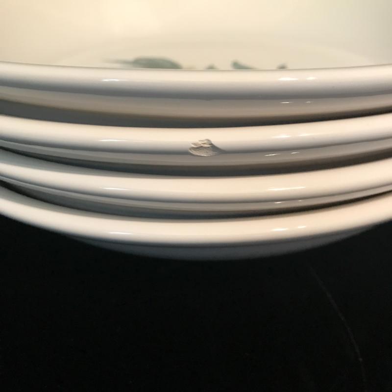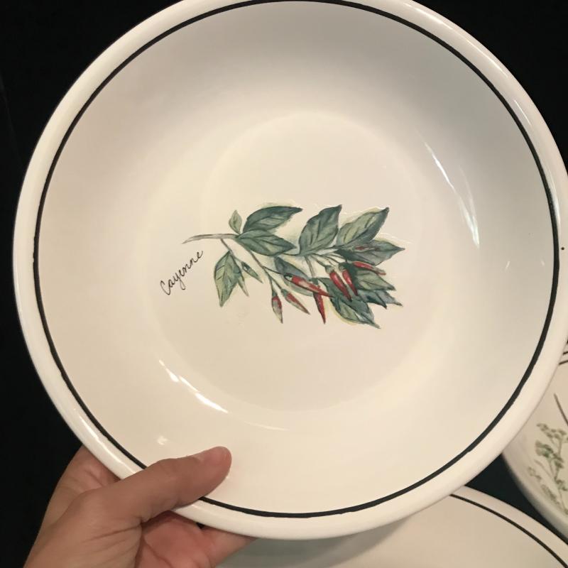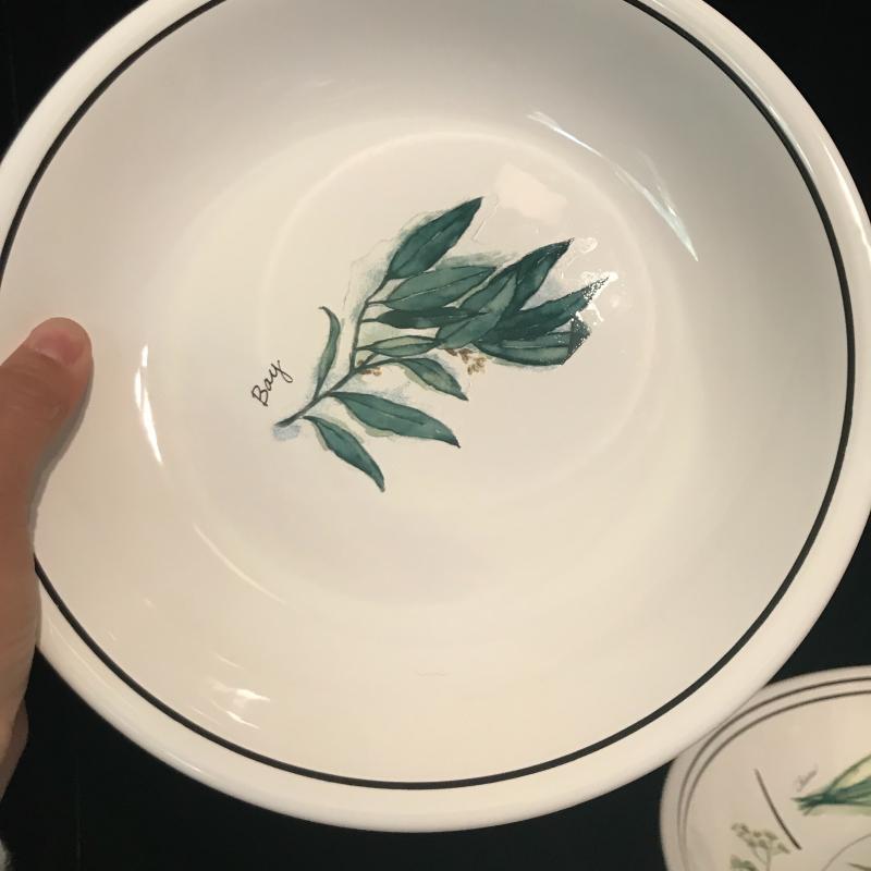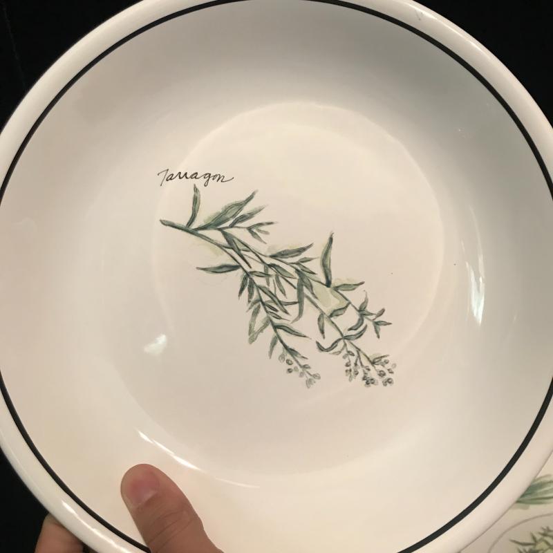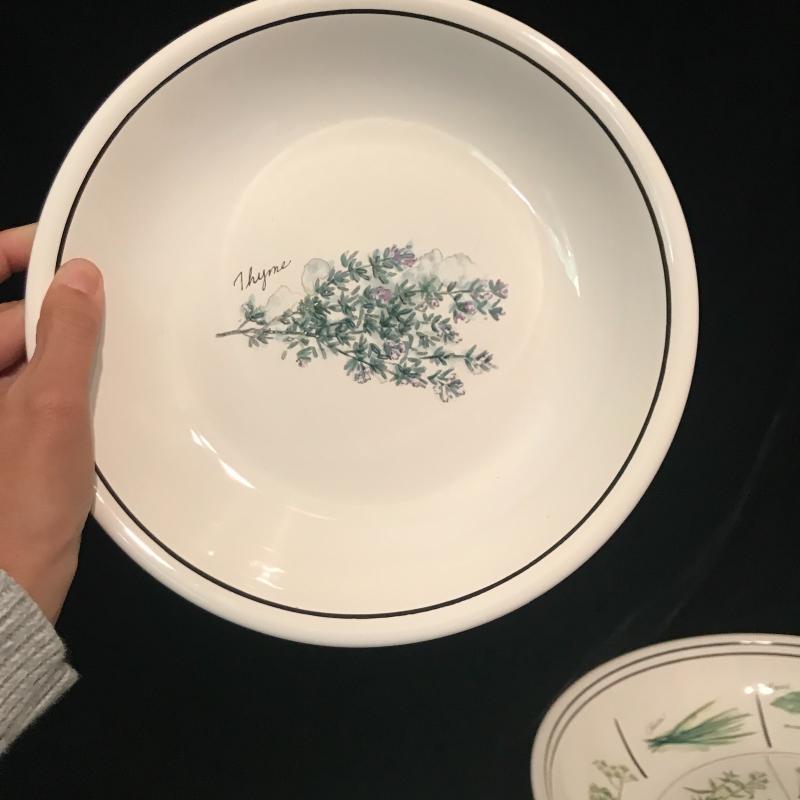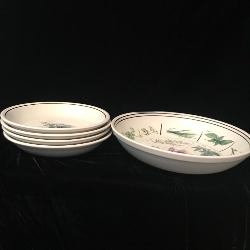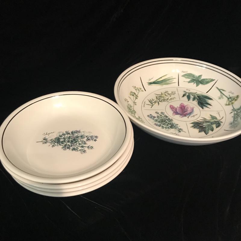 Four bowls and one large bowl for serving your favorite pasta dish. This William and Sonoma Set will make anything taste good! Each dish has a different herb design. One small chip in one dish. See pix. Large bowl is 13”d x 3”h. Shipping available
