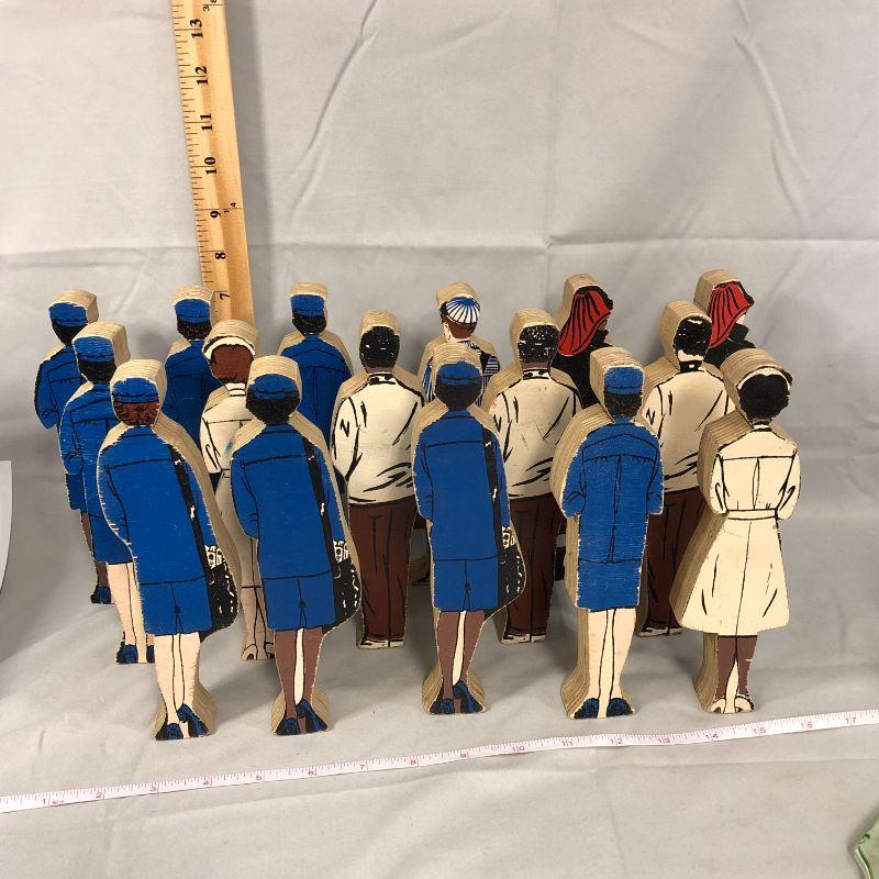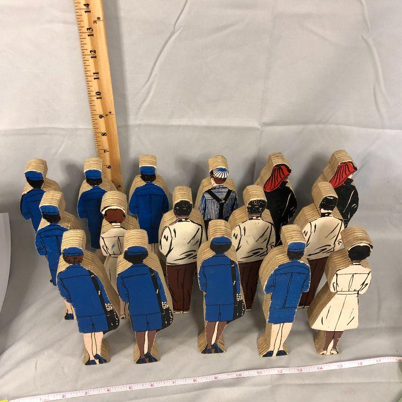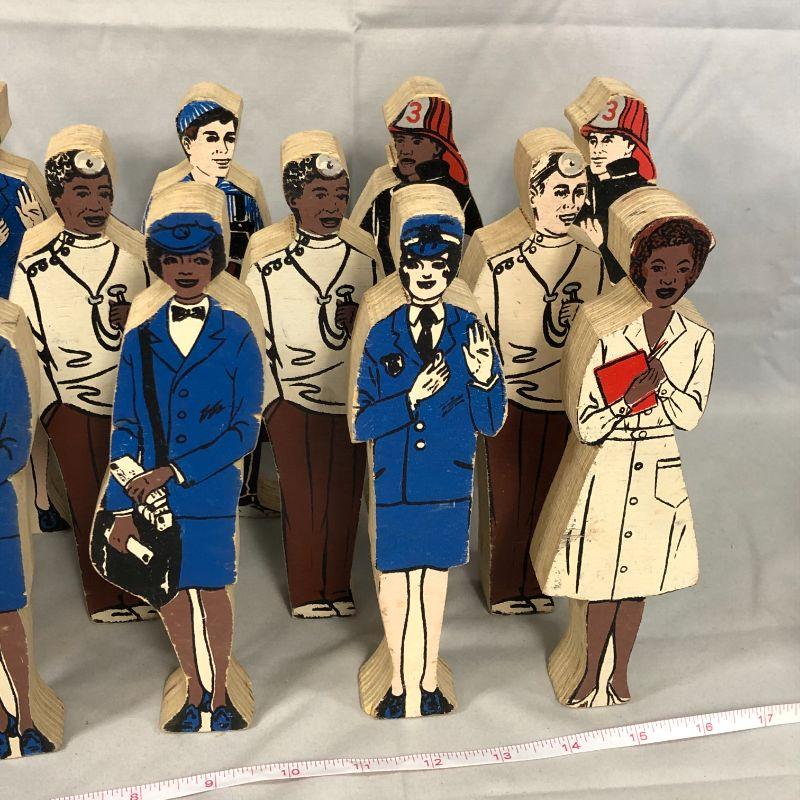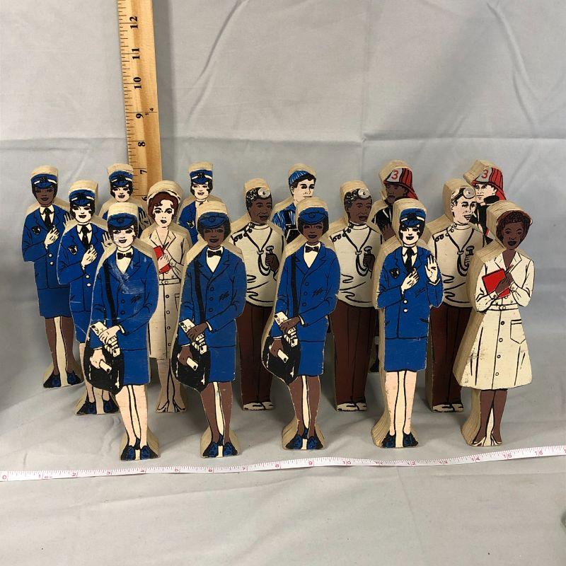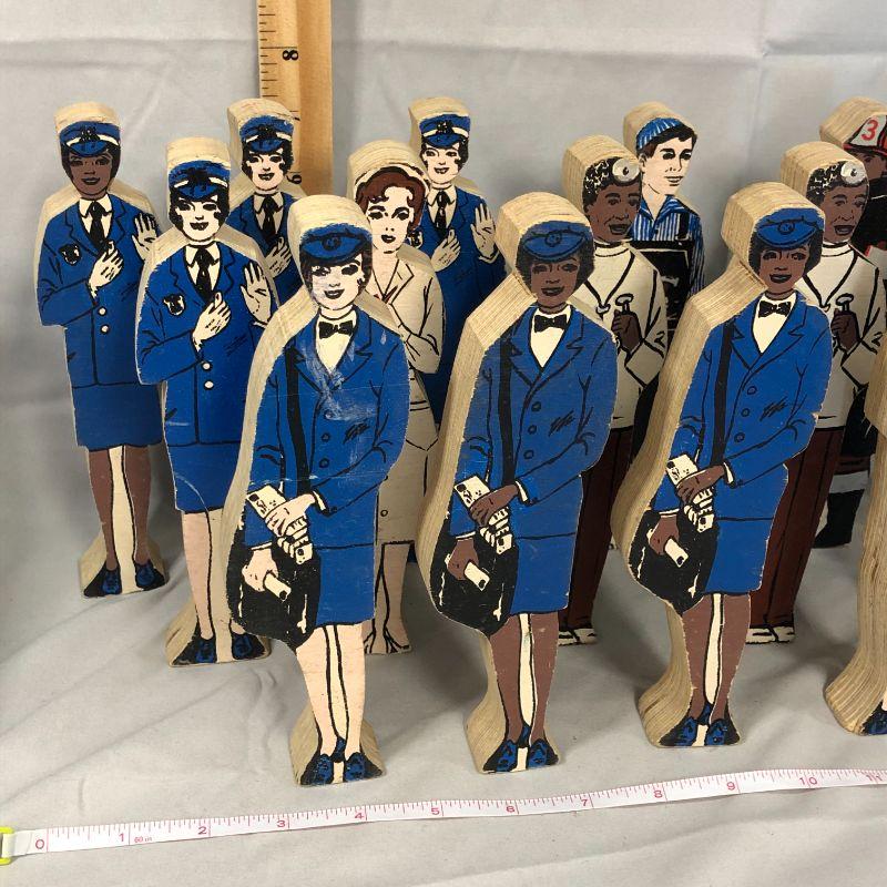 There are (5) female police officers, (3) female mail carriers, (2) male firefighters, (2) female nurses, (1) male carpenter, and (3) male doctors. They are all about 7.75" tall and in good, gently used condition. Based on the uniforms, I would guess that these are from the 1960s-1970s.
