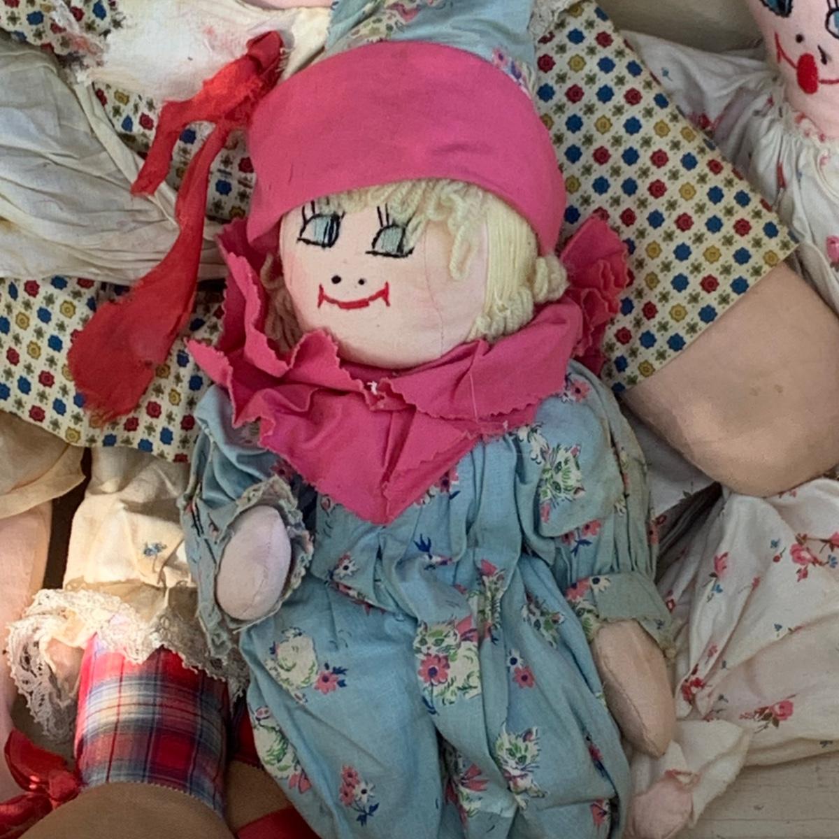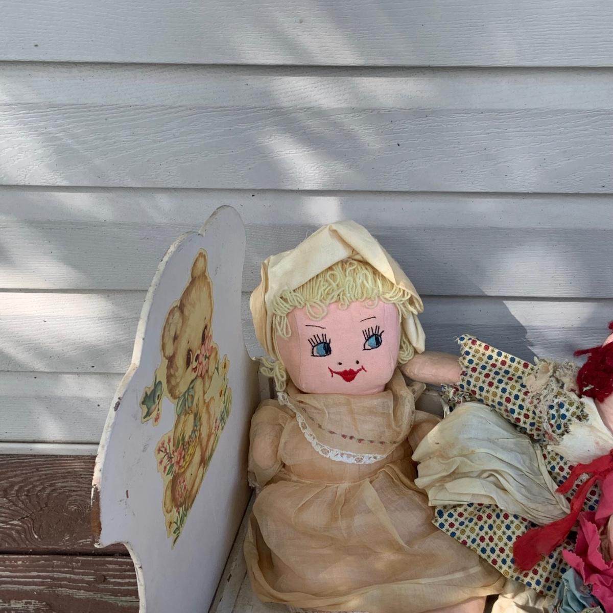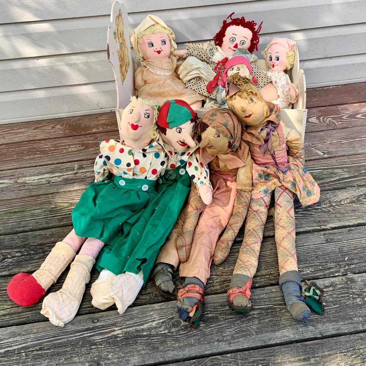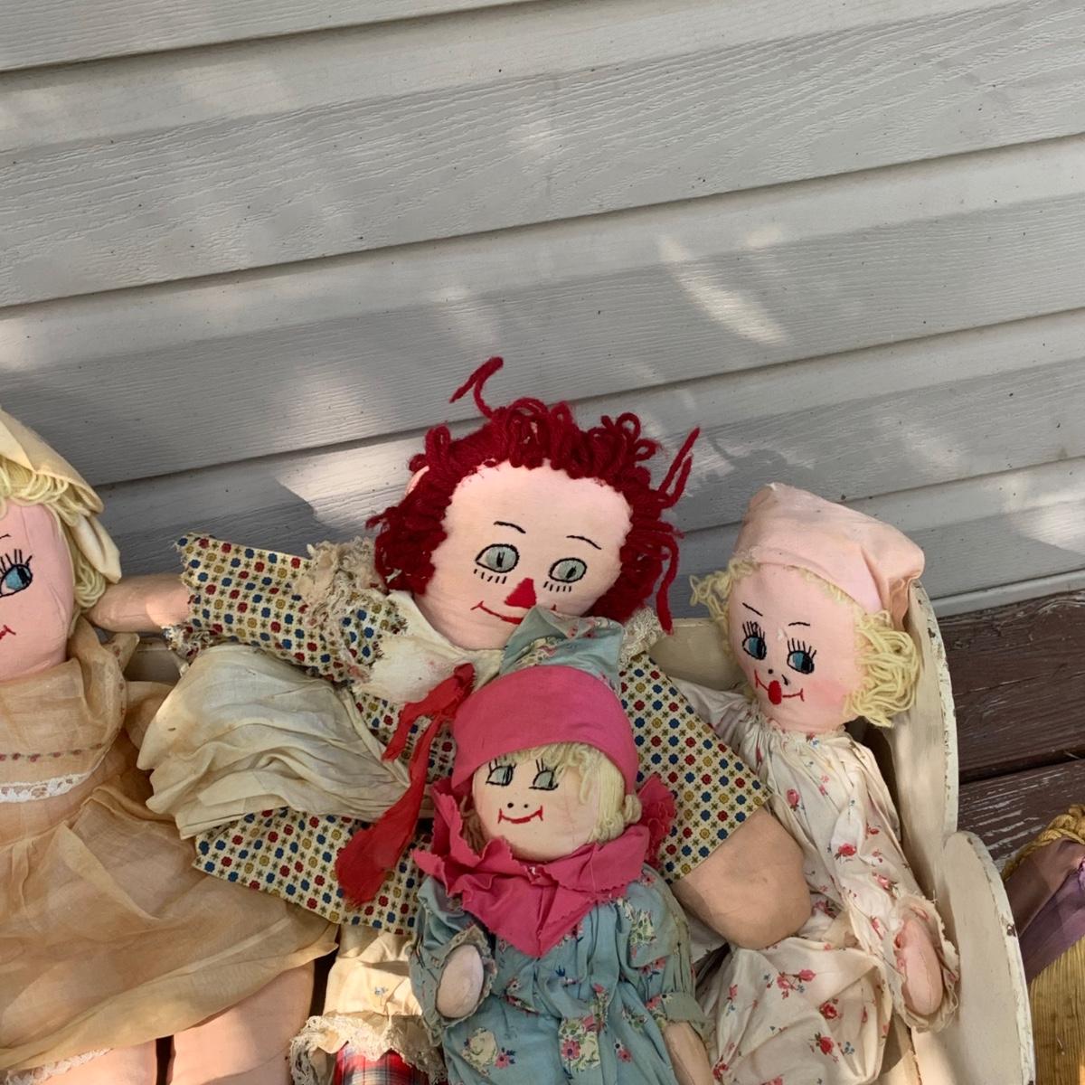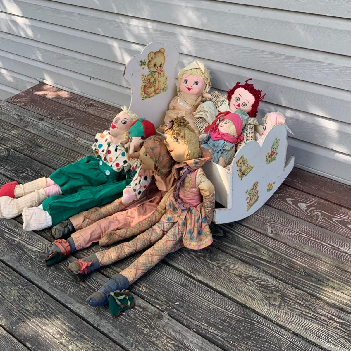 LOT:28: Collection of Vintage/ Antique Rag Dolls with a Doll Cradle