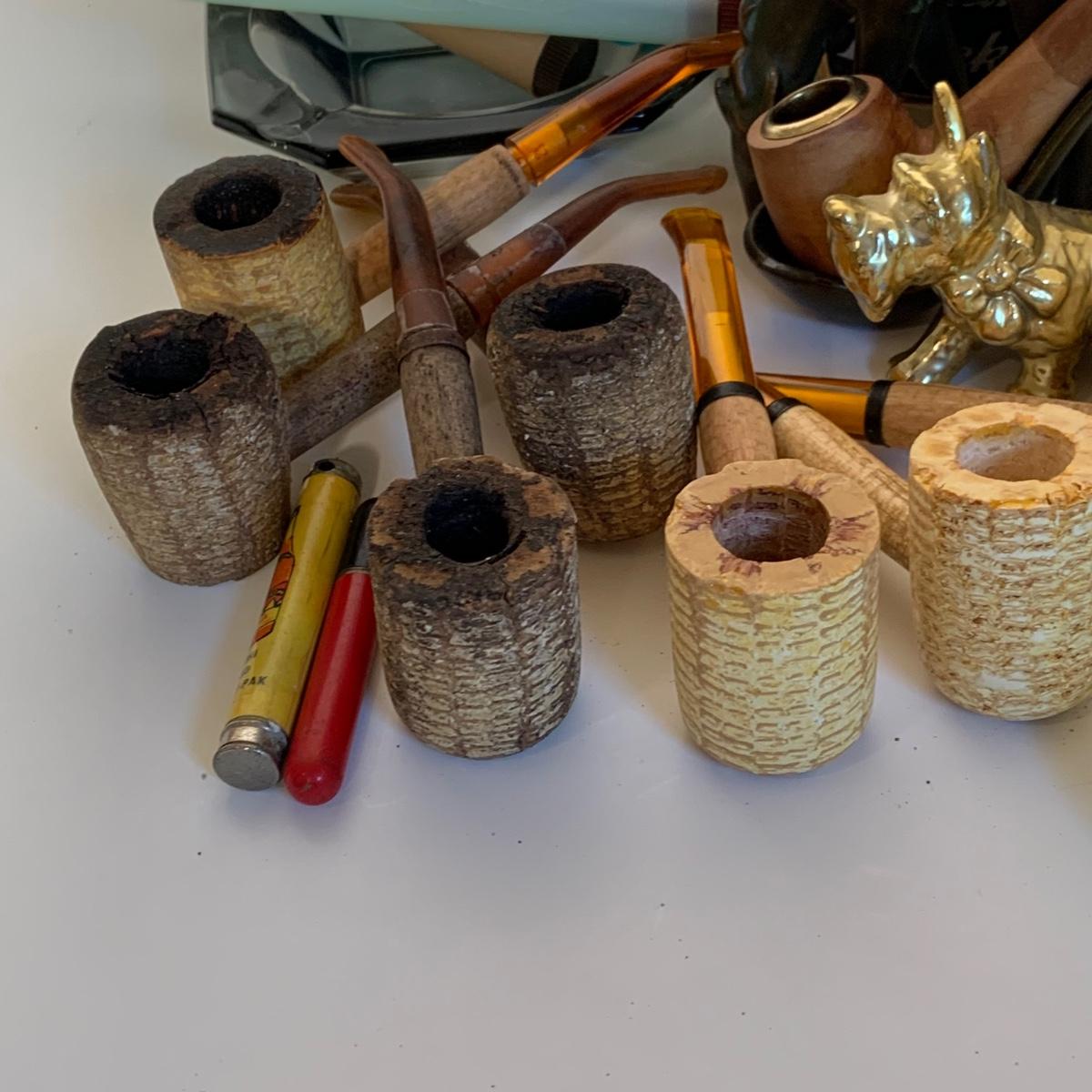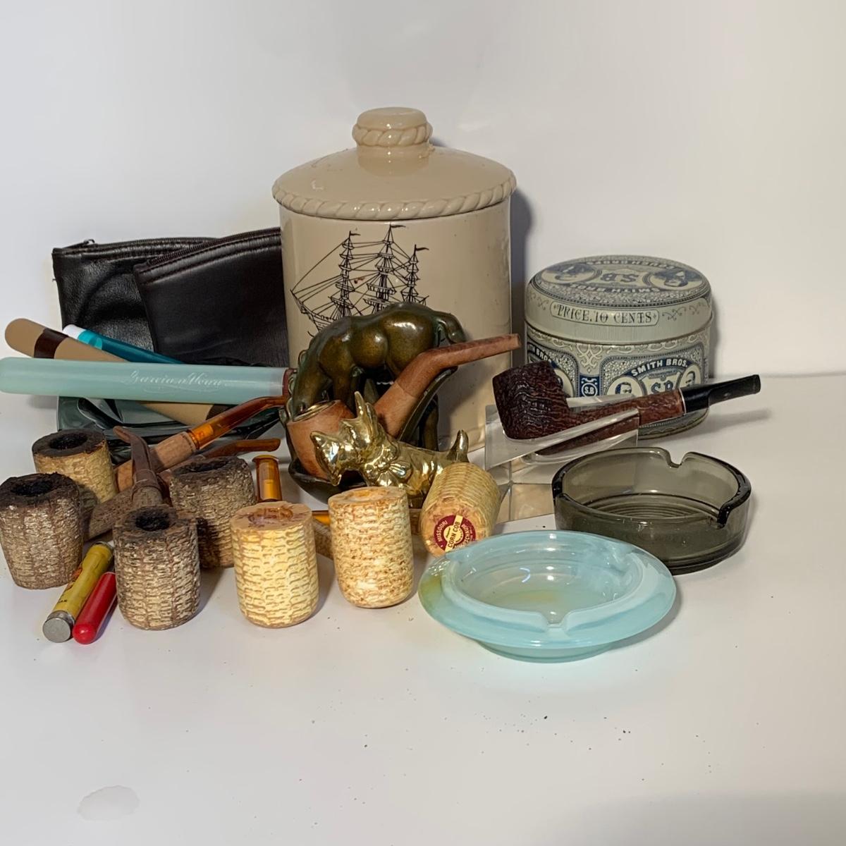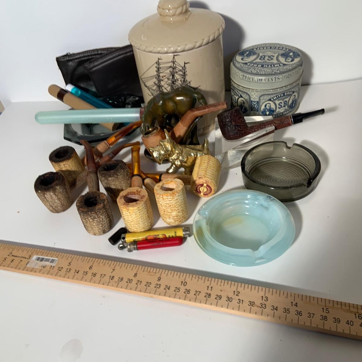 LOT:34G: Tobacciana Collection of Pipes, Pipe Holders, Lighters, Ashtrays, Tobacco Jar and More.