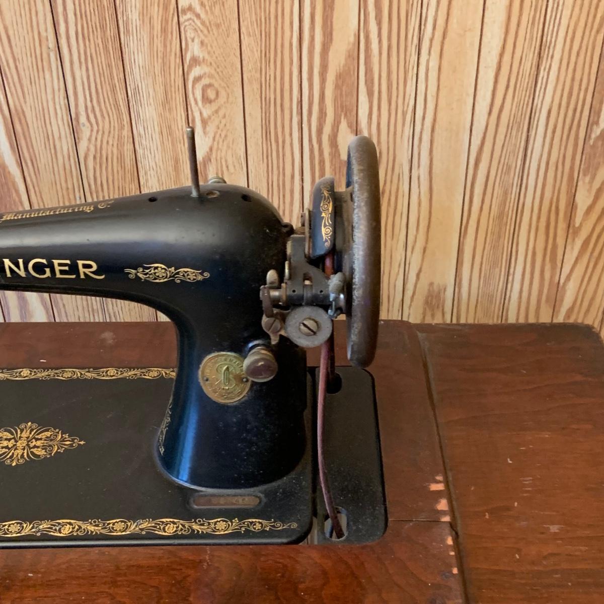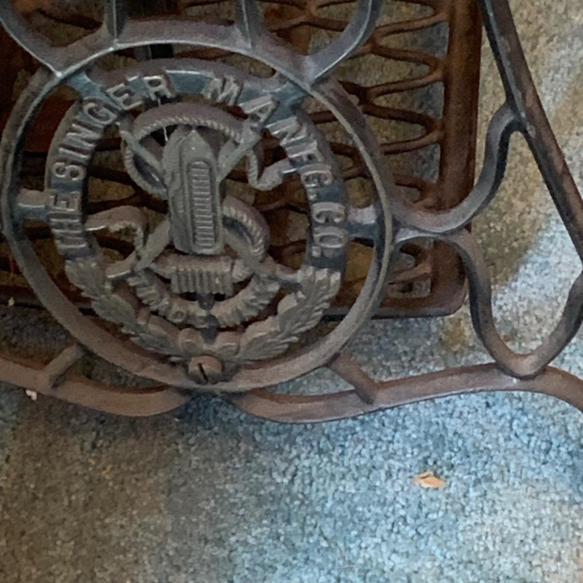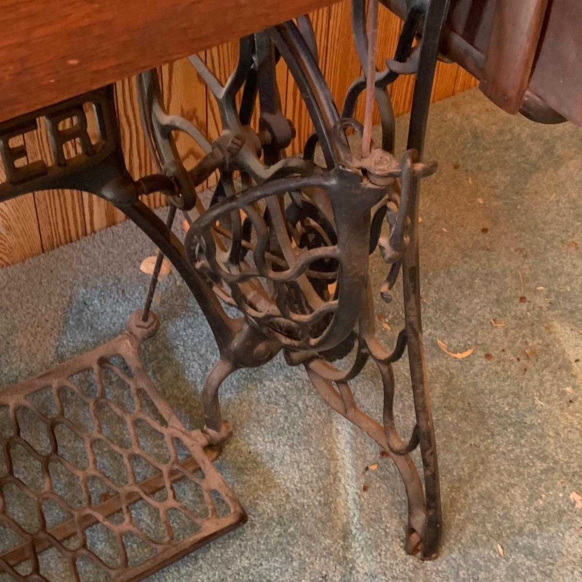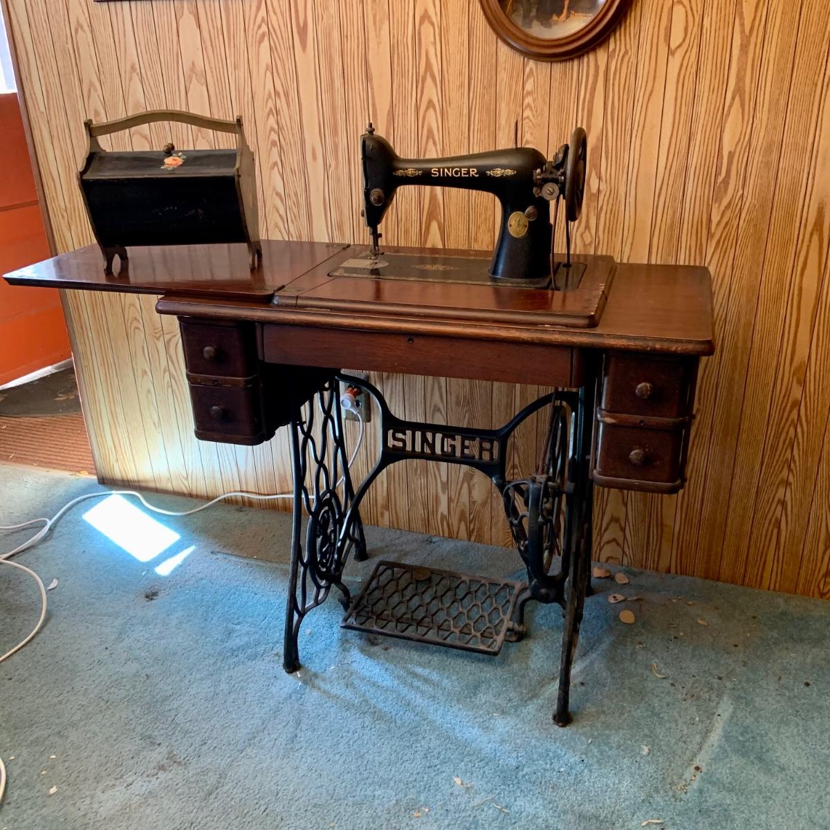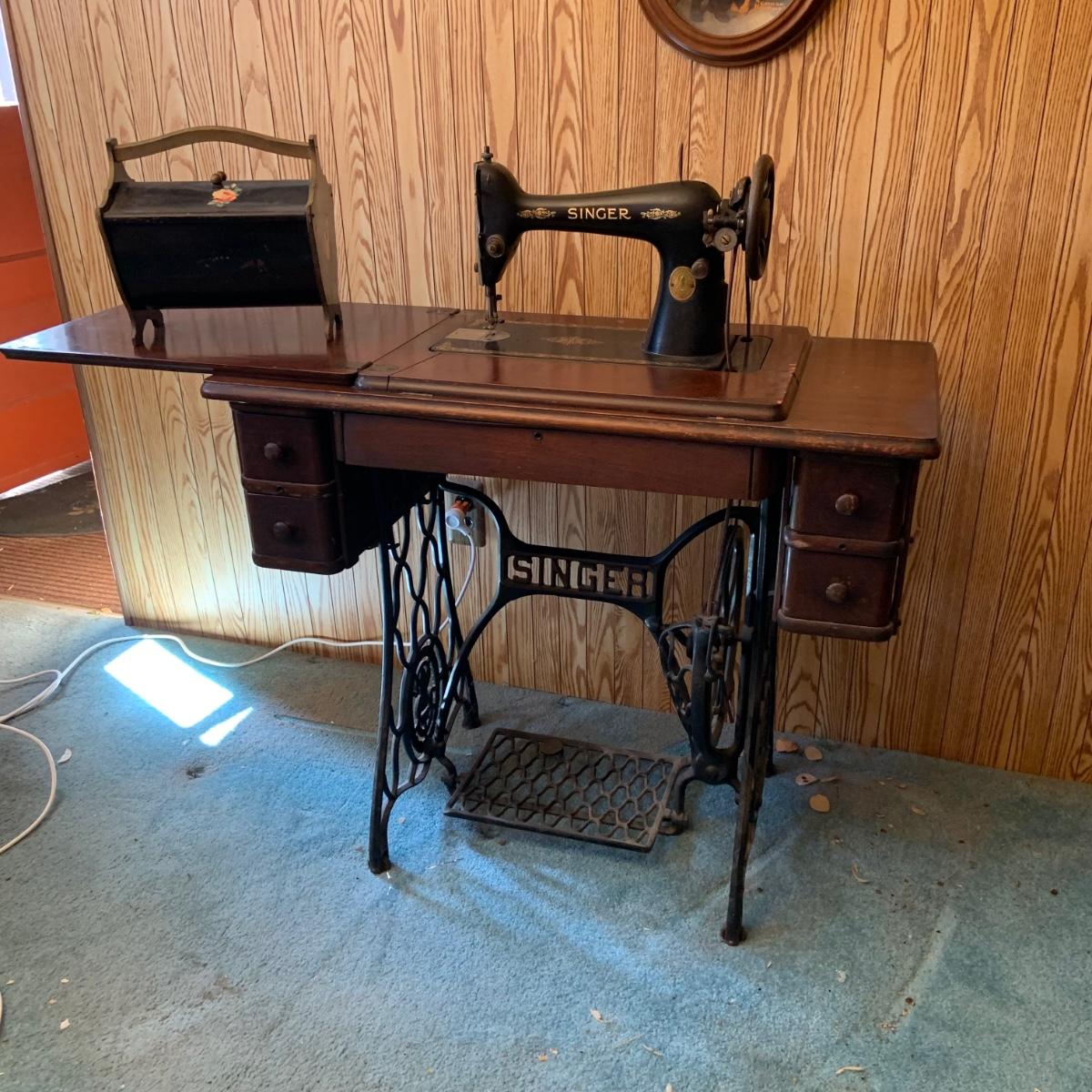 LOT:38G: Antique Singer Treadle Sewing Machine with Wooden Sewing Basket