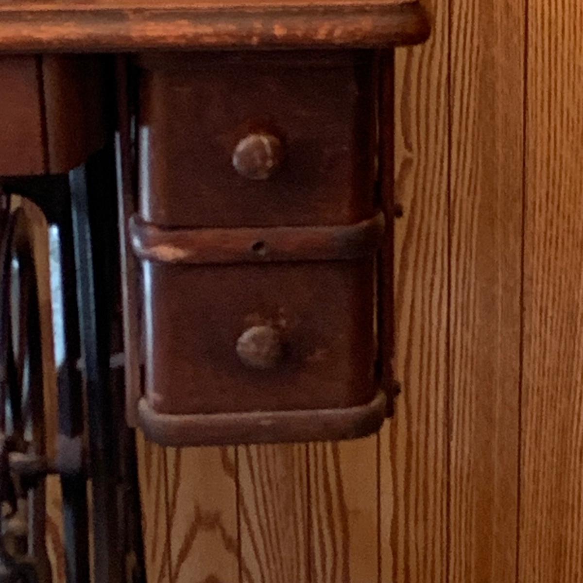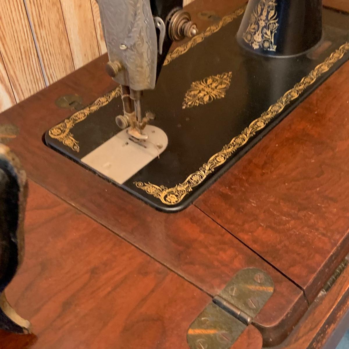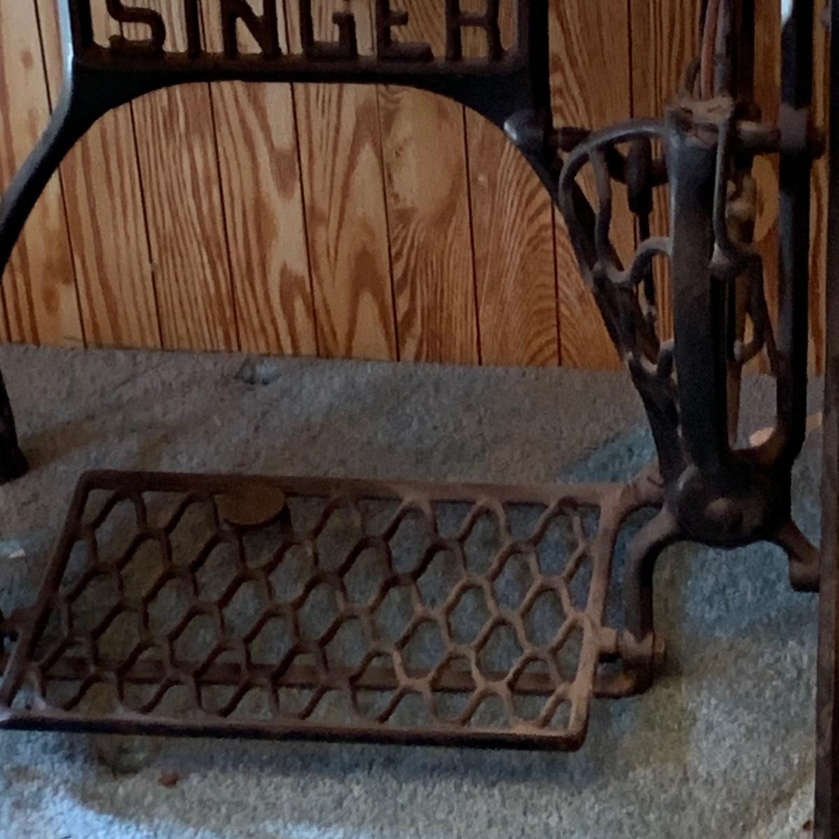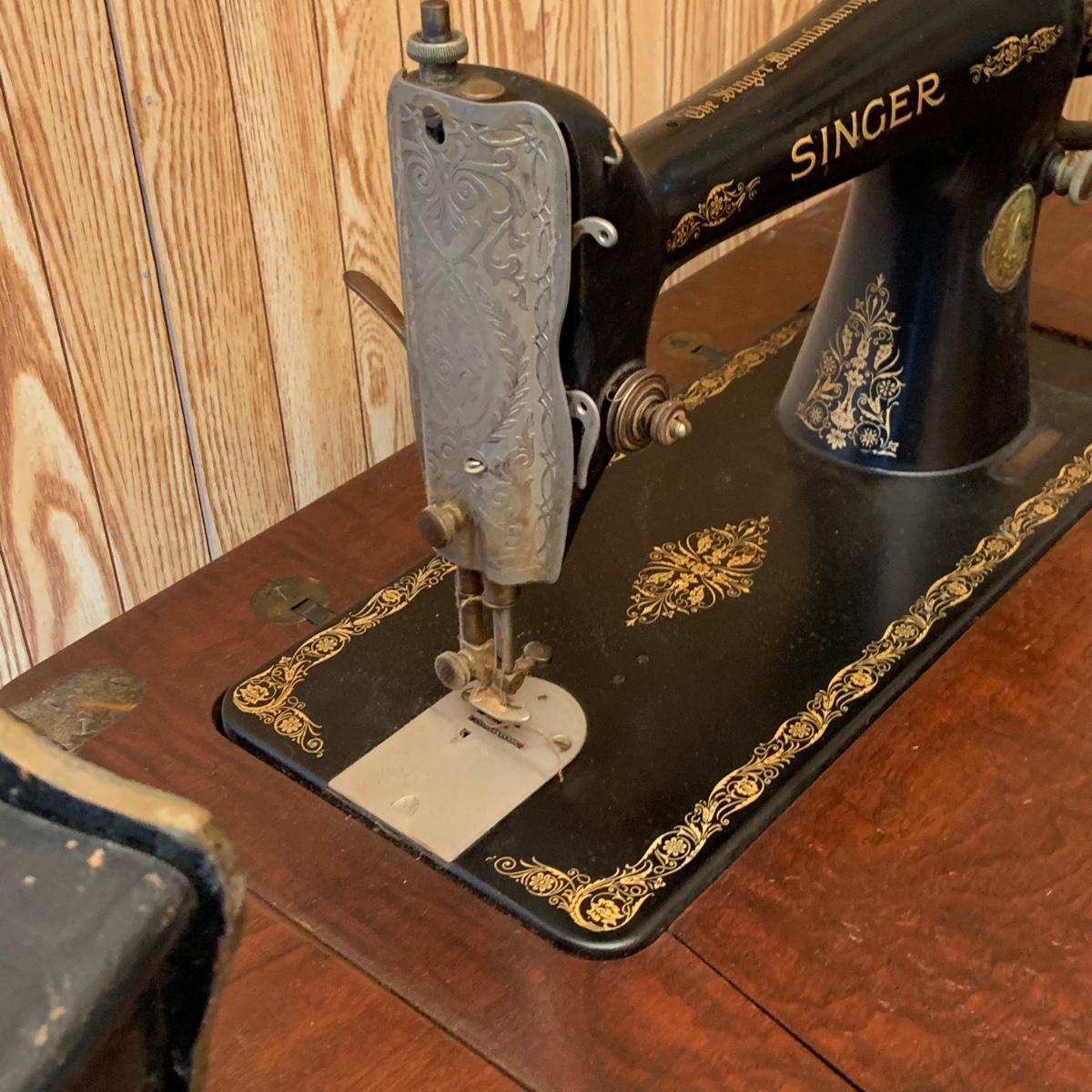 LOT:38G: Antique Singer Treadle Sewing Machine with Wooden Sewing Basket