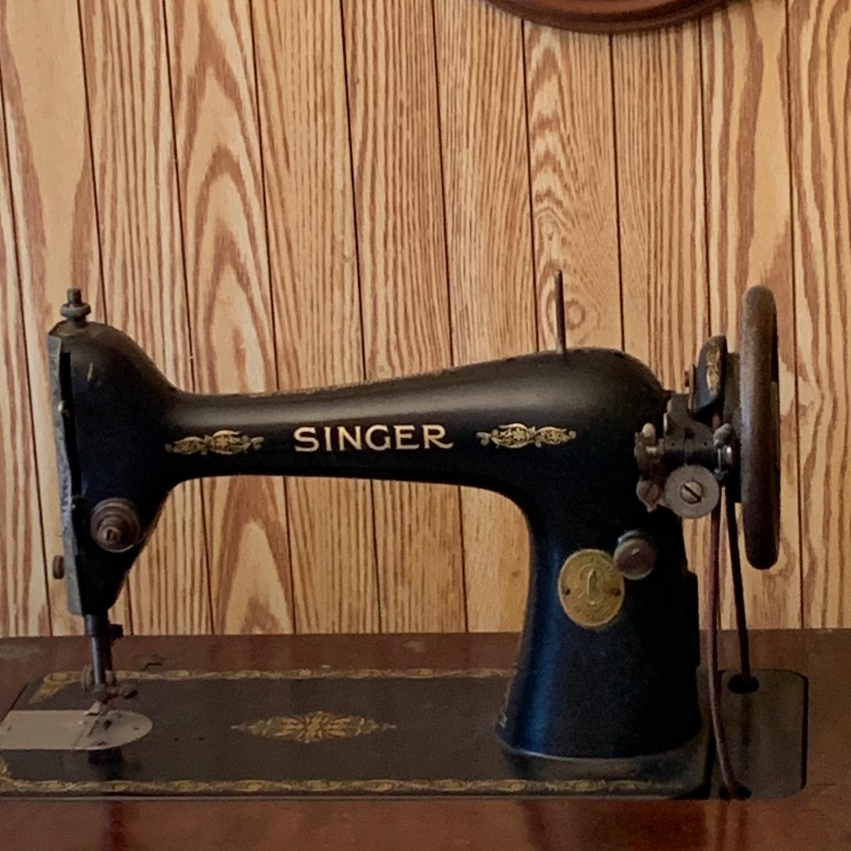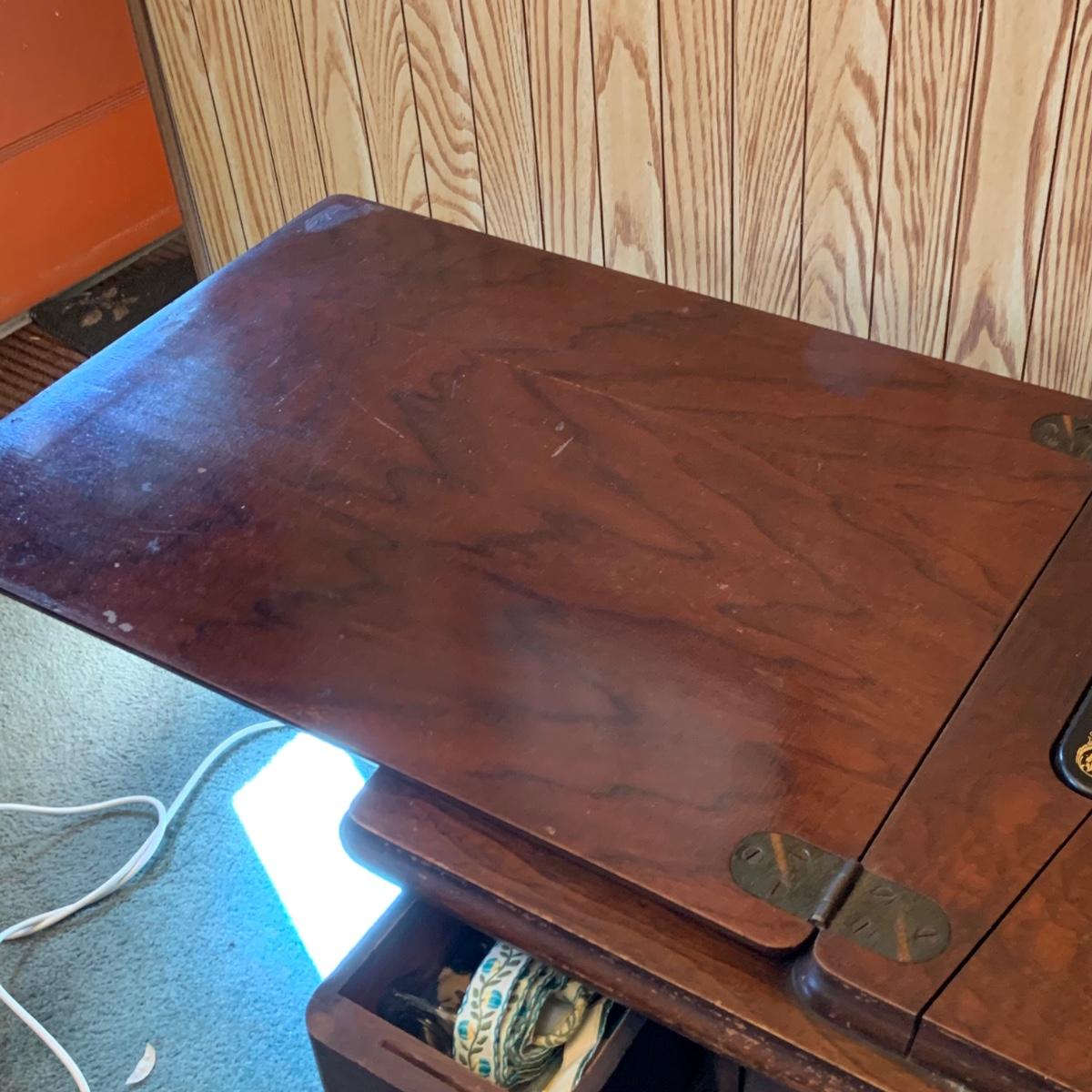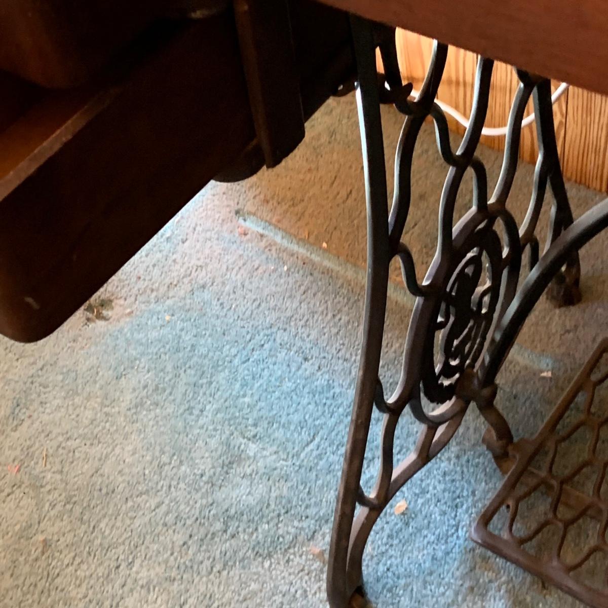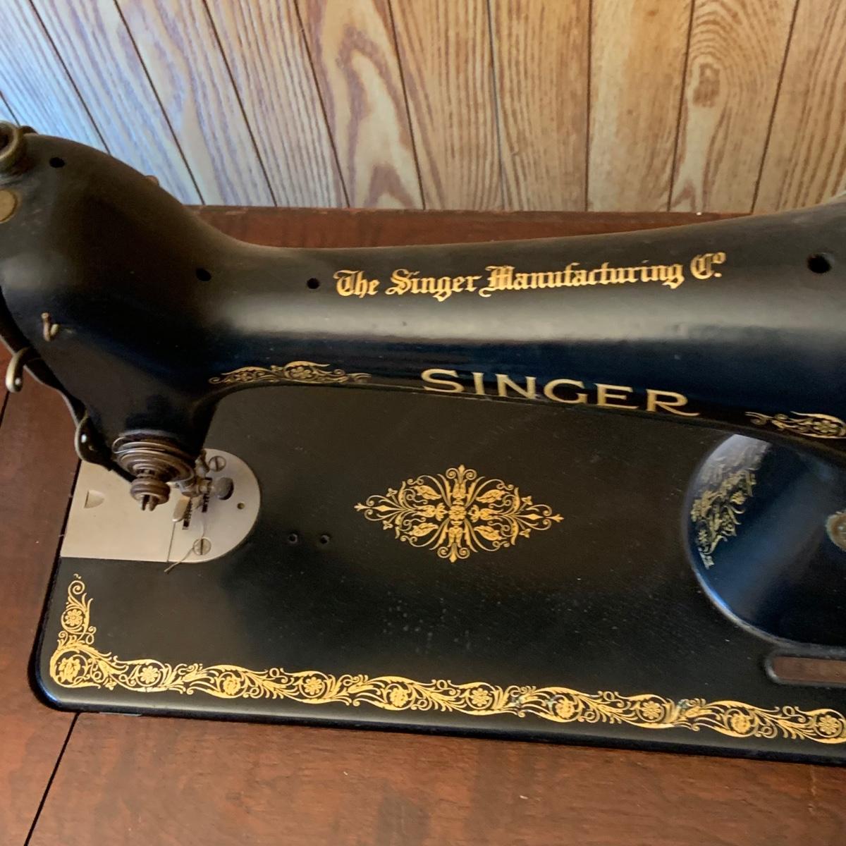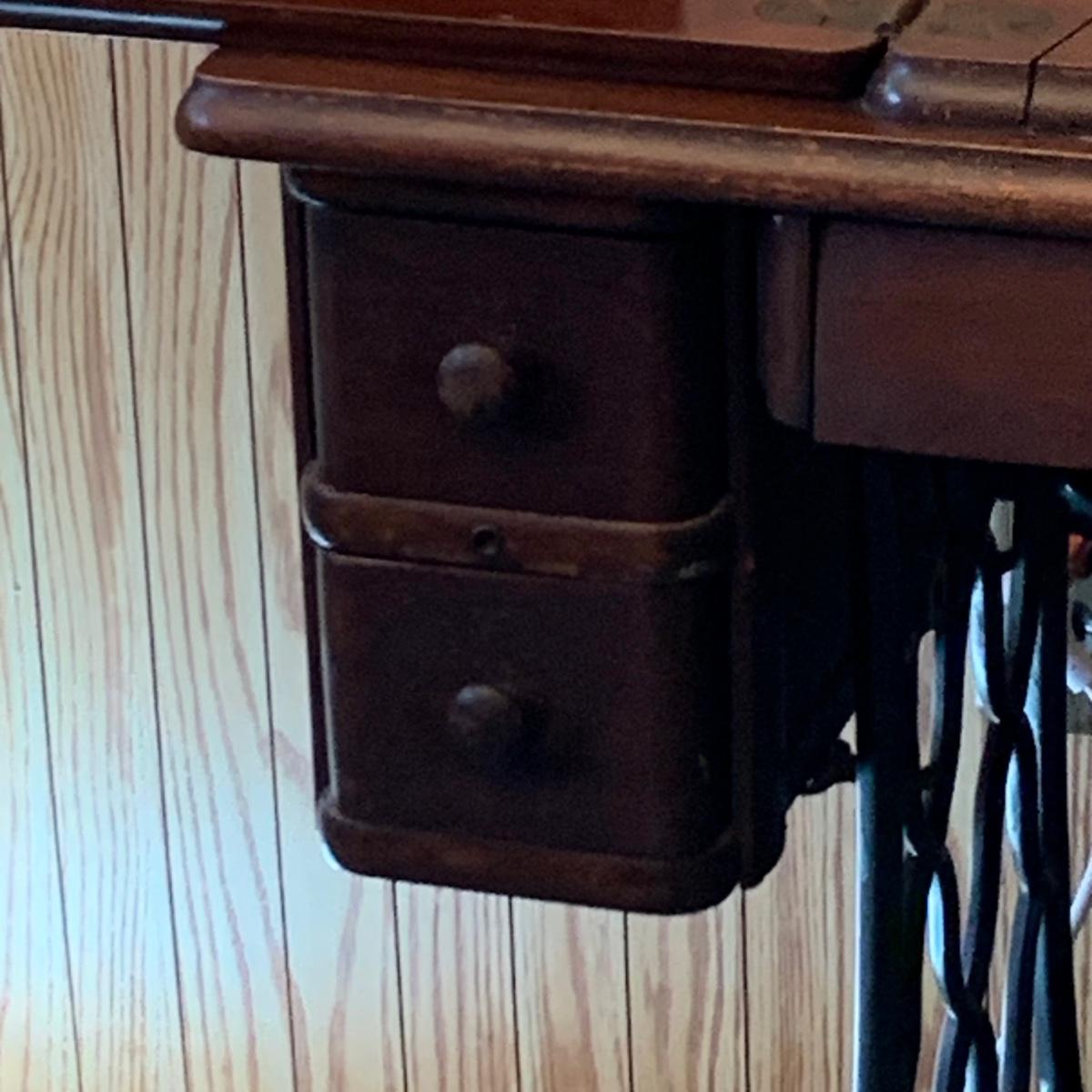 LOT:38G: Antique Singer Treadle Sewing Machine with Wooden Sewing Basket