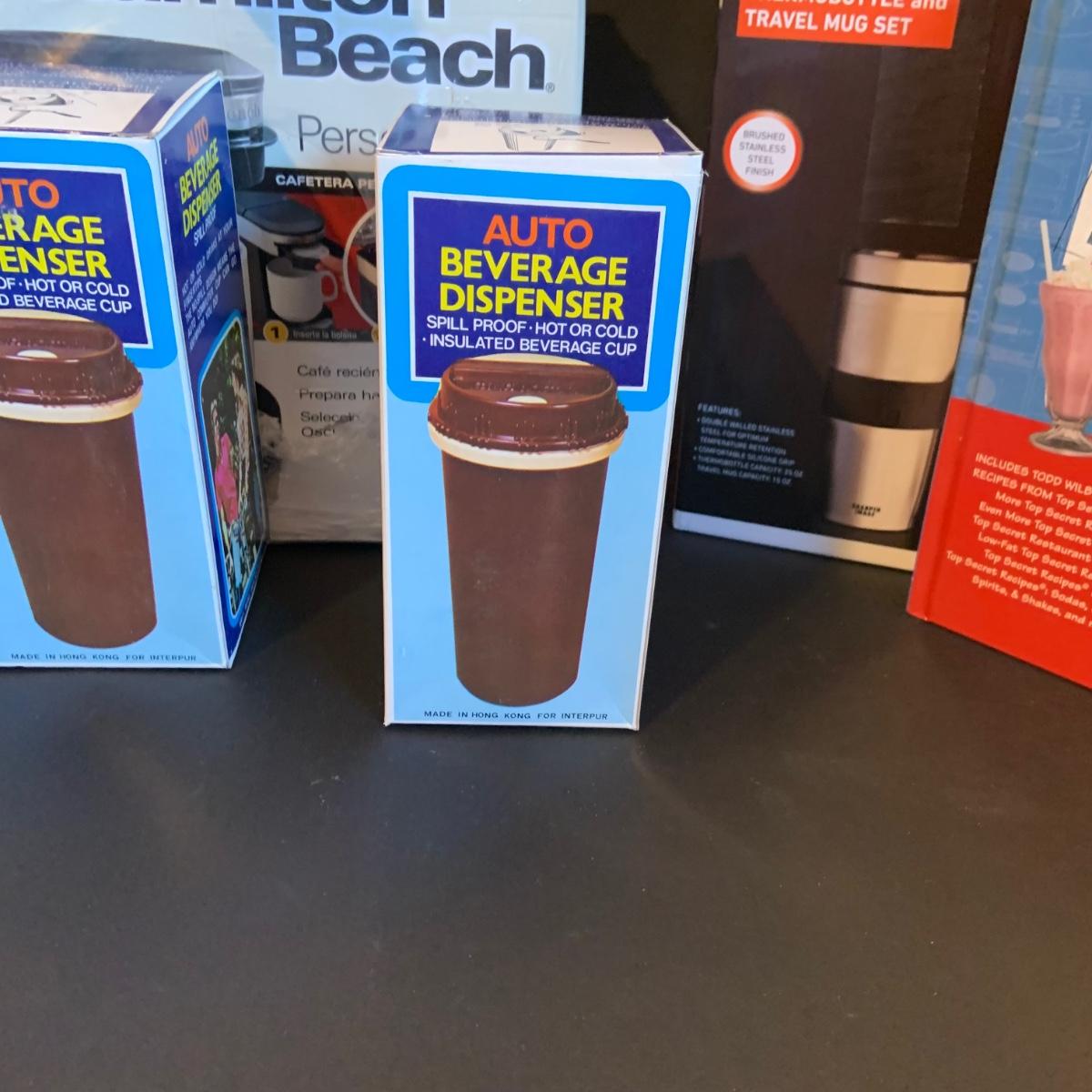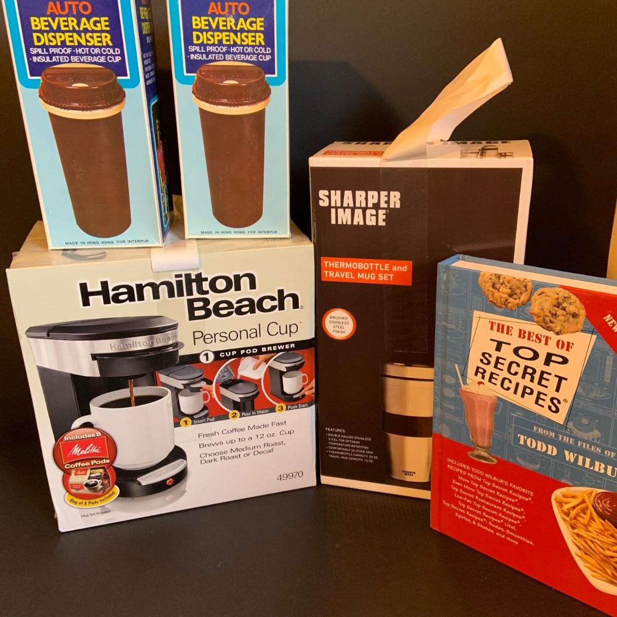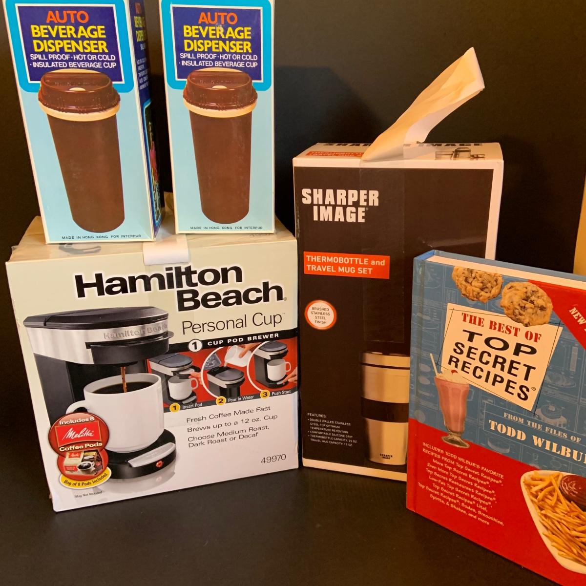 LOT:43G: Coffee to Go - Hamilton Beach Personal Cup Coffee Maker, 2 Vintage Auto Beverage Dispensers, Sharper Image Thermobottle / Travel Mug Set and Book