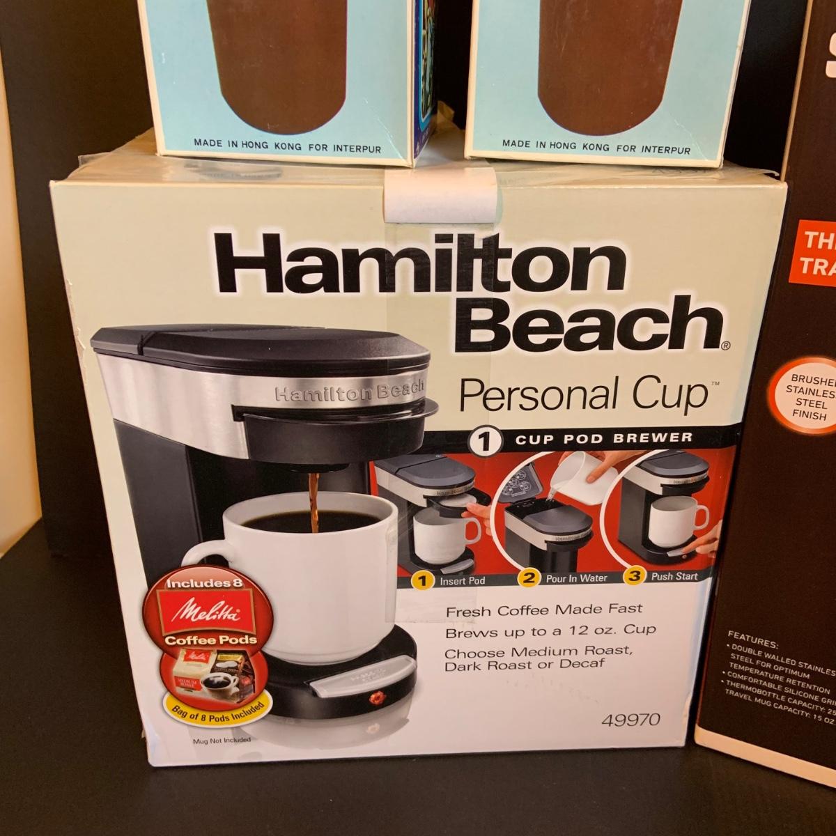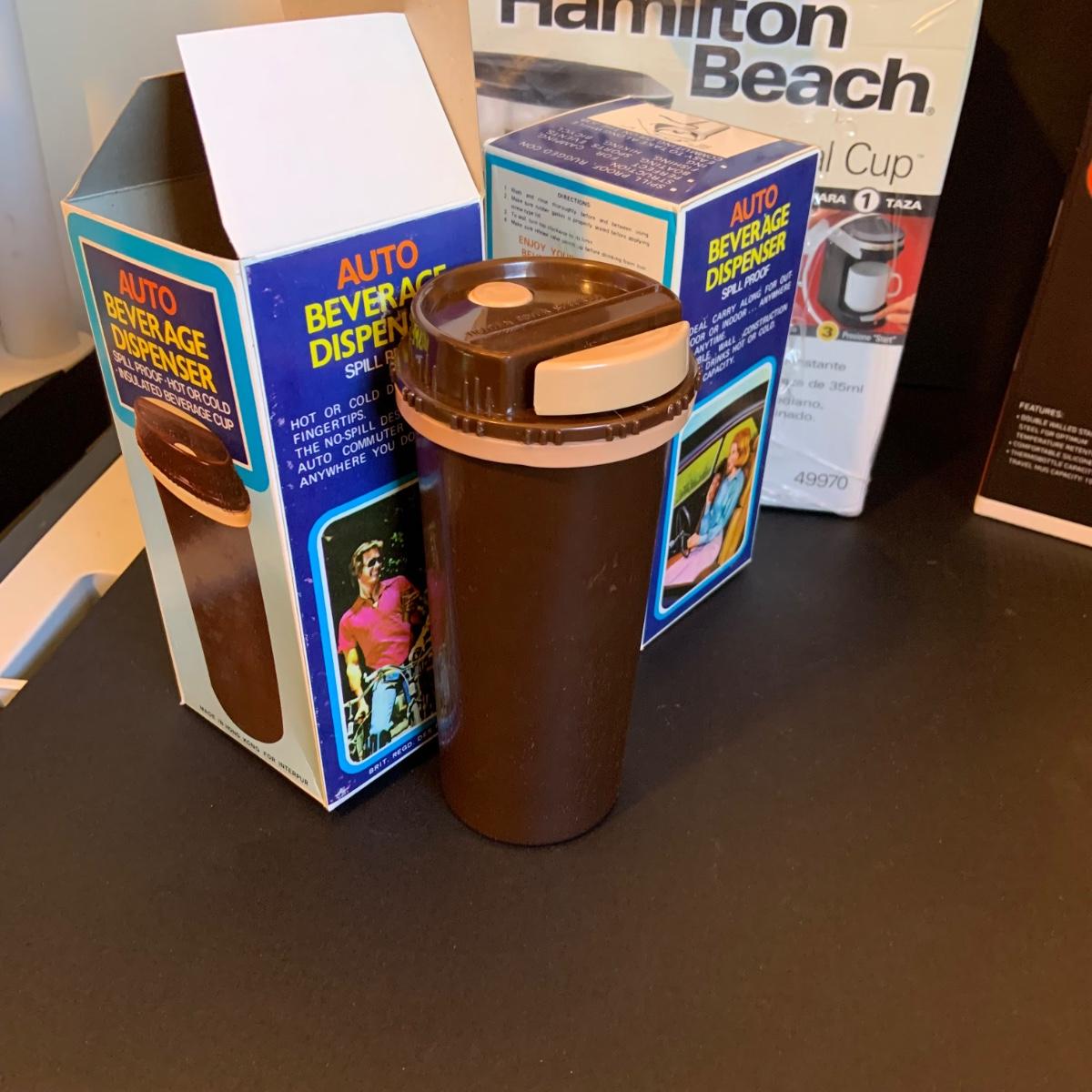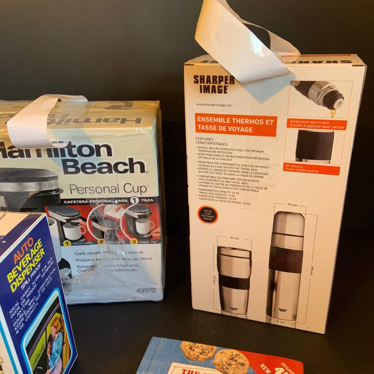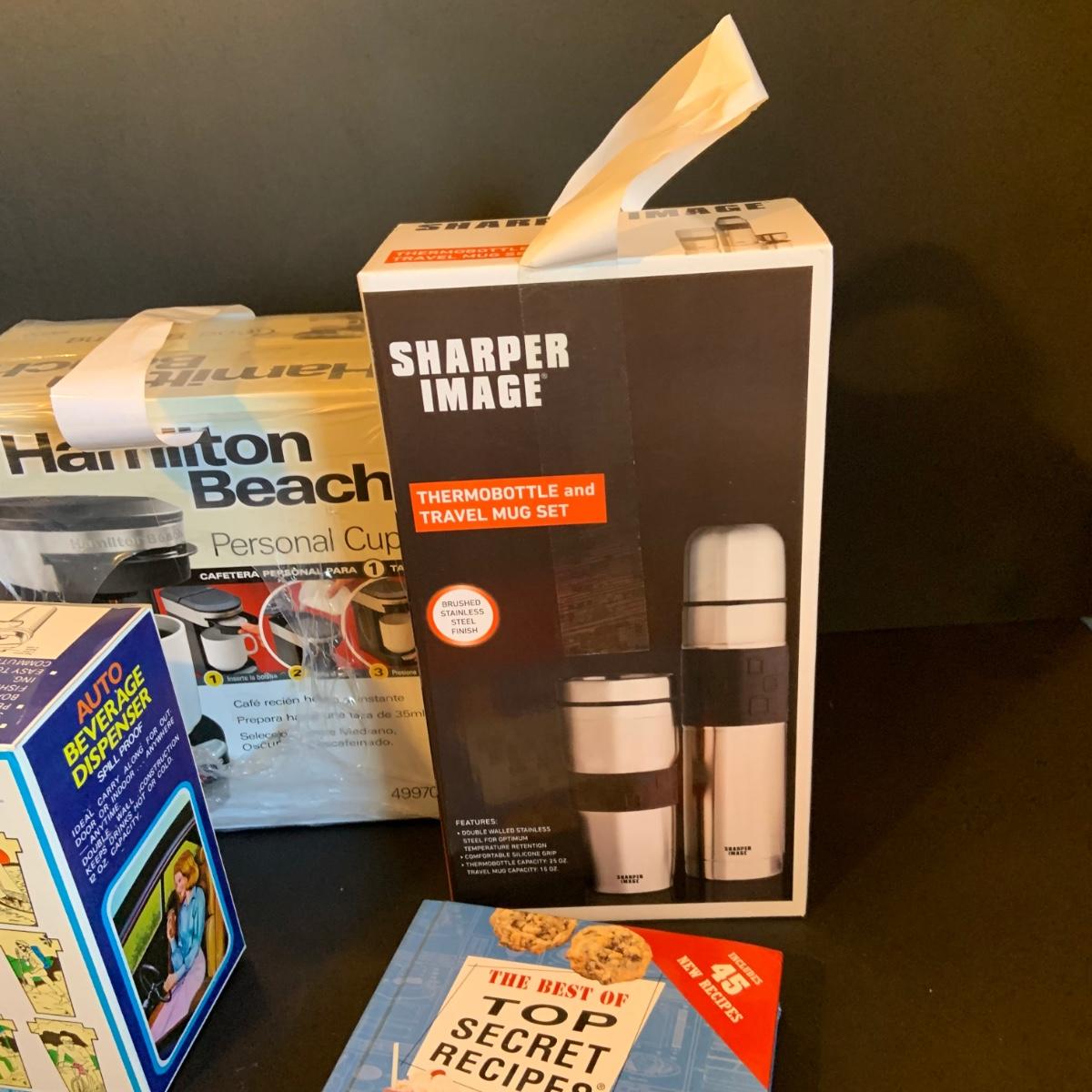 LOT:43G: Coffee to Go - Hamilton Beach Personal Cup Coffee Maker, 2 Vintage Auto Beverage Dispensers, Sharper Image Thermobottle / Travel Mug Set and Book