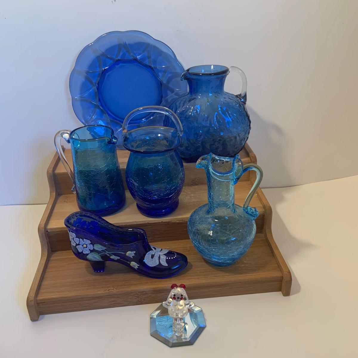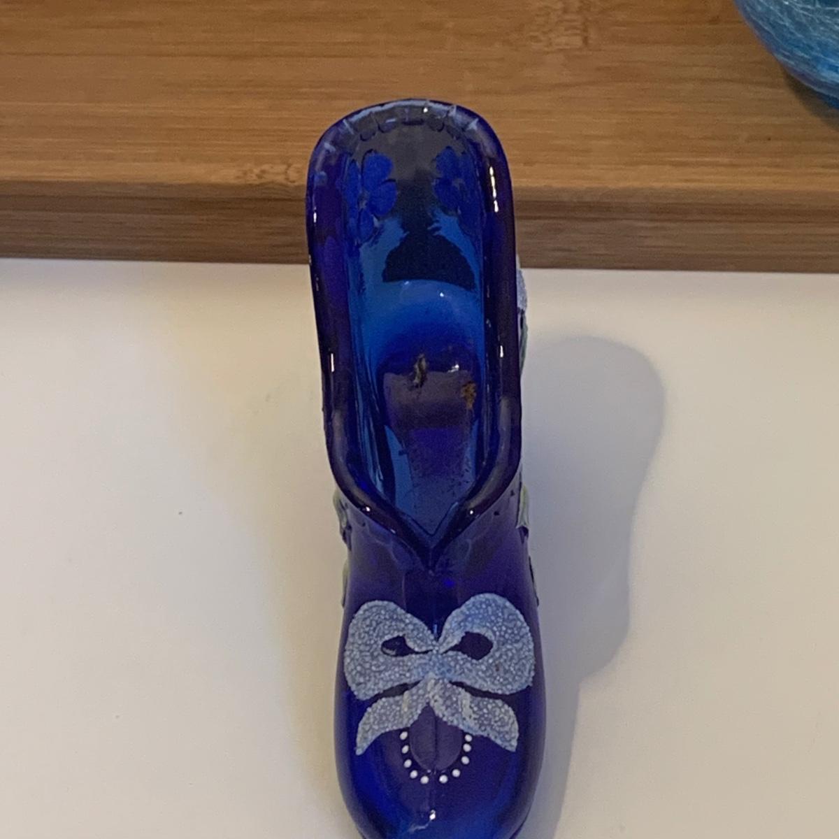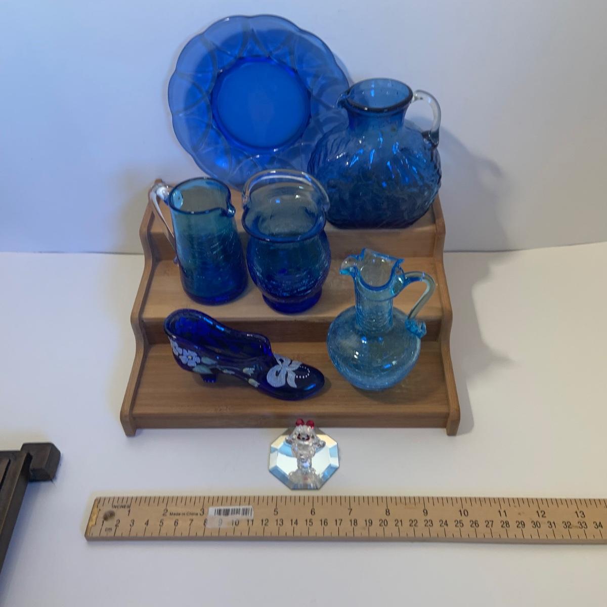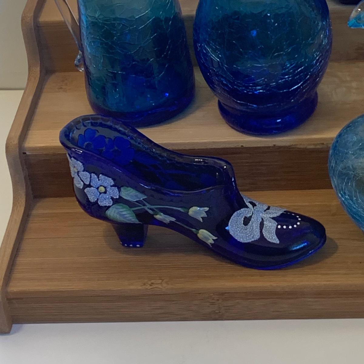LOT:48G: Collection of Blue Glass Featuring a Signed Glass Shoe and a Crystal Doll