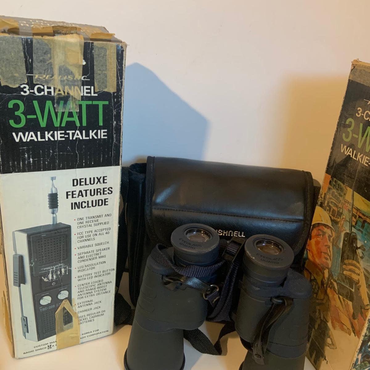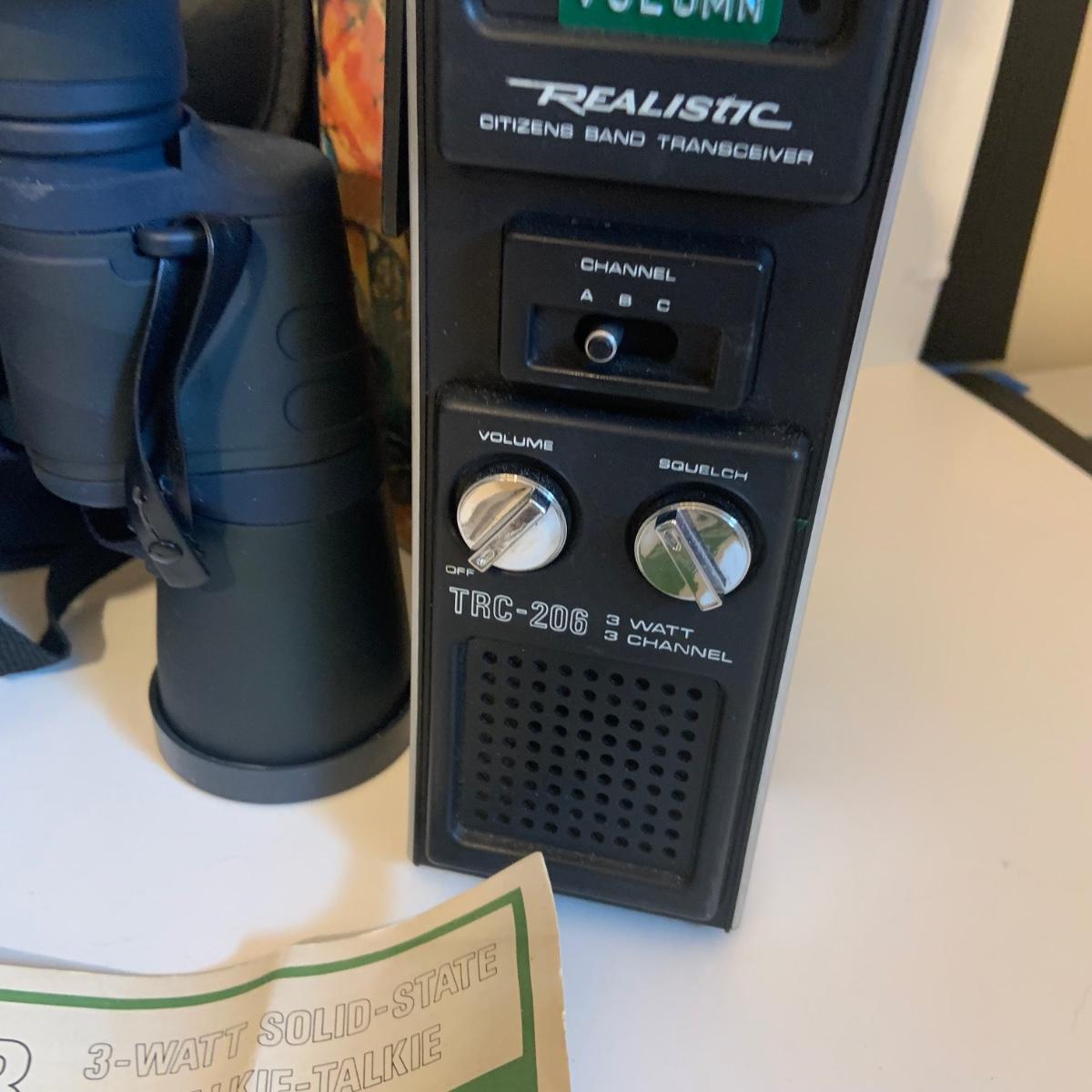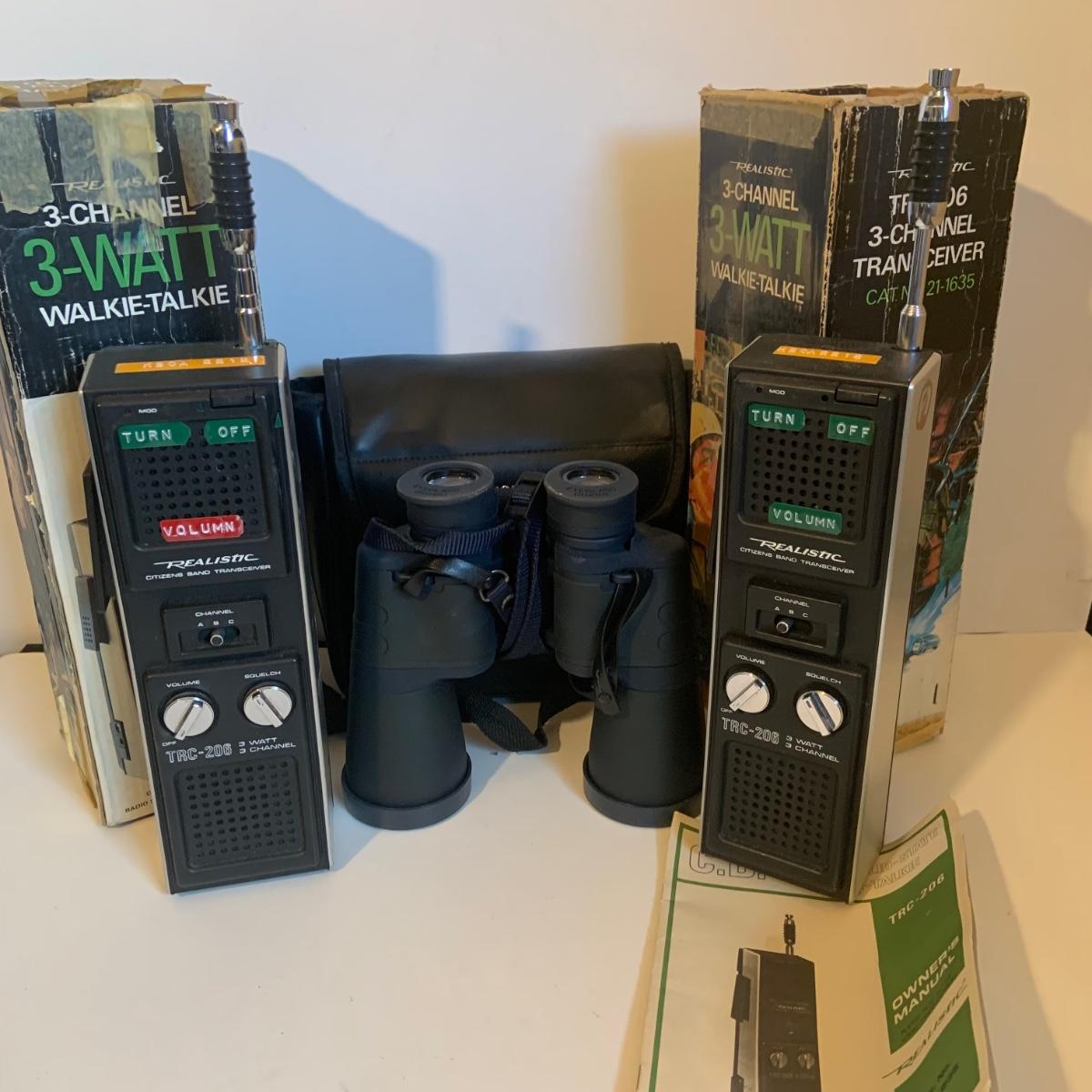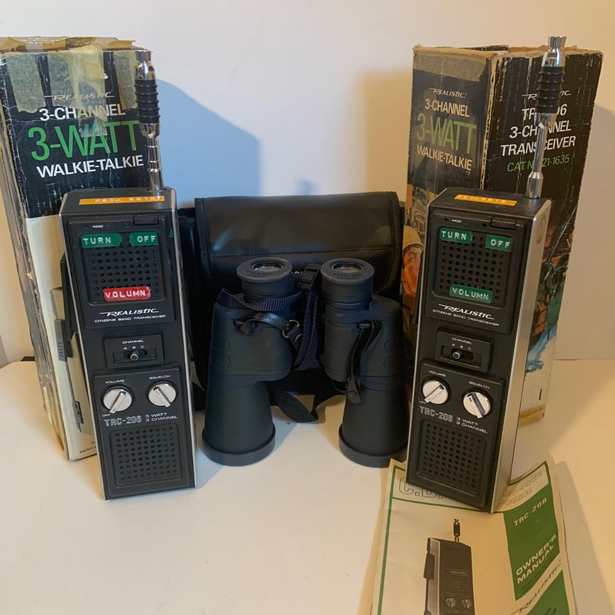 LOT:52G: Two Vintage Realistic C.B Walkie Talkies in Original Boxes with Manuel and a Pair of Busnel Binoculars